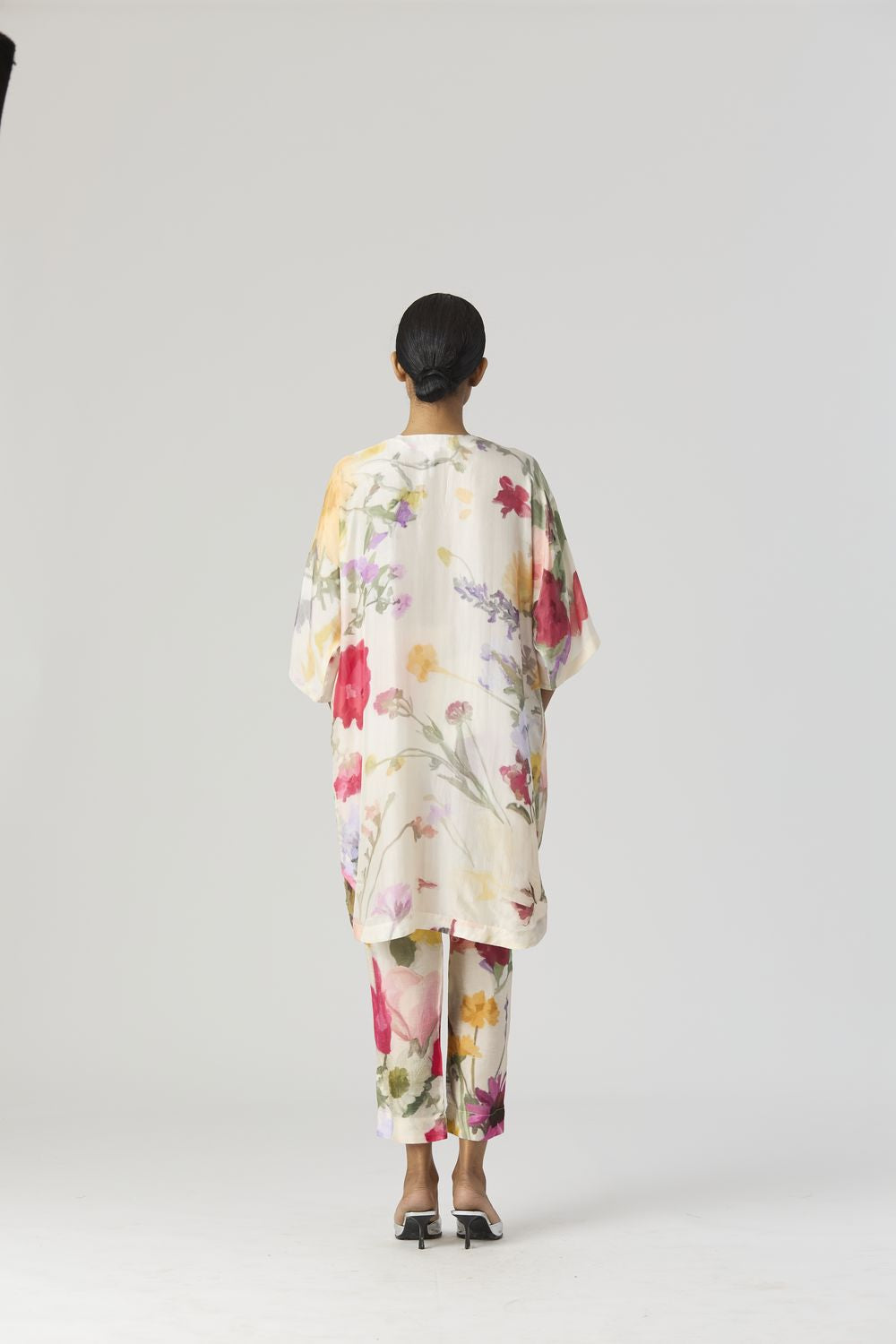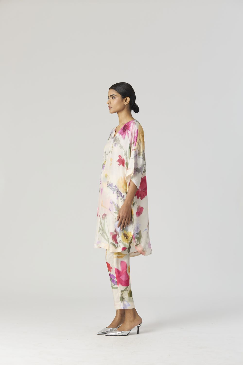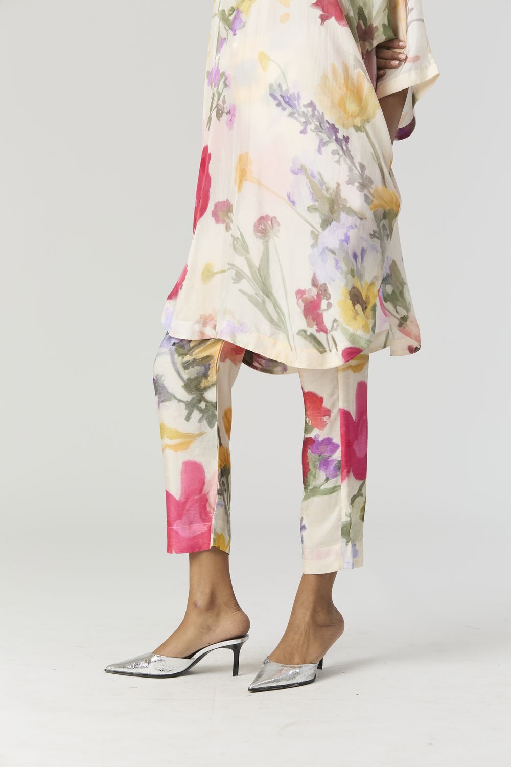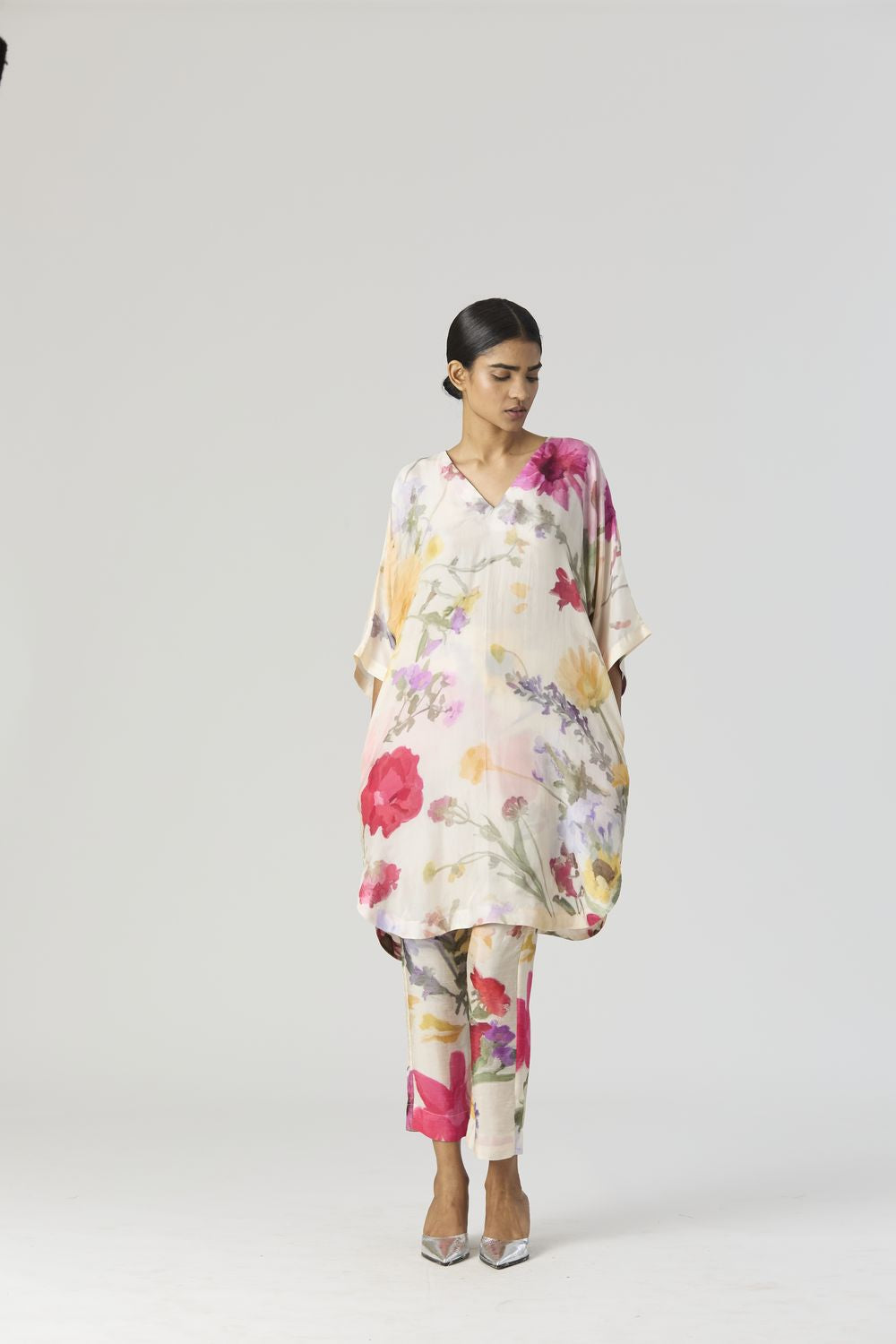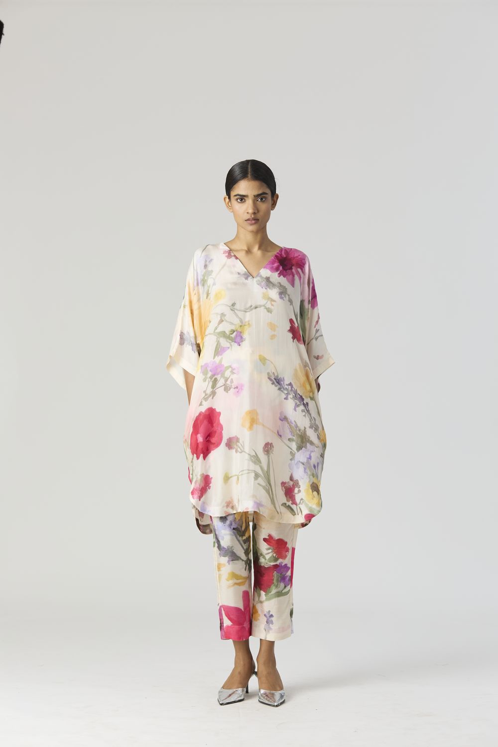 The Maria print is an enchanting artwork that magnifies the elegance of botanical florals in a pastel palette. Oversized blooms dominate the canvas, their gentle pastel hues evoking a dreamlike ambiance. The V neck short kaftan kurta is crafted in pure habutai silk. The kurta has side pockets. The pants have a drawstring front and back elastic. Model is wearing a size small and height is 5'9