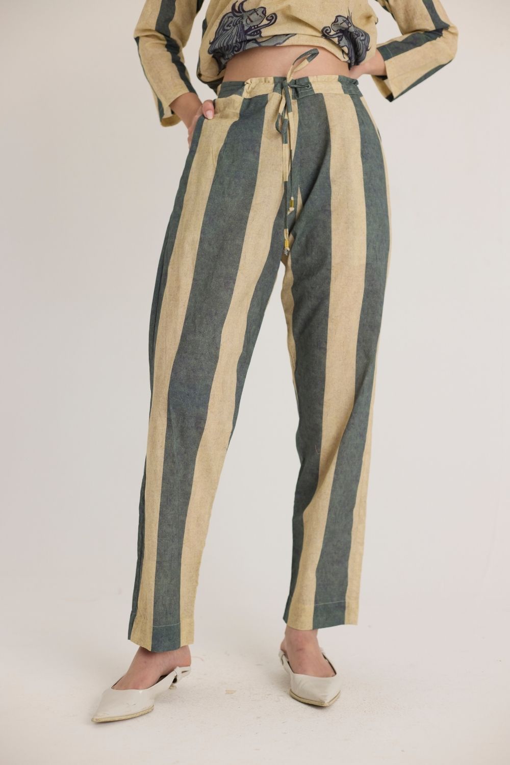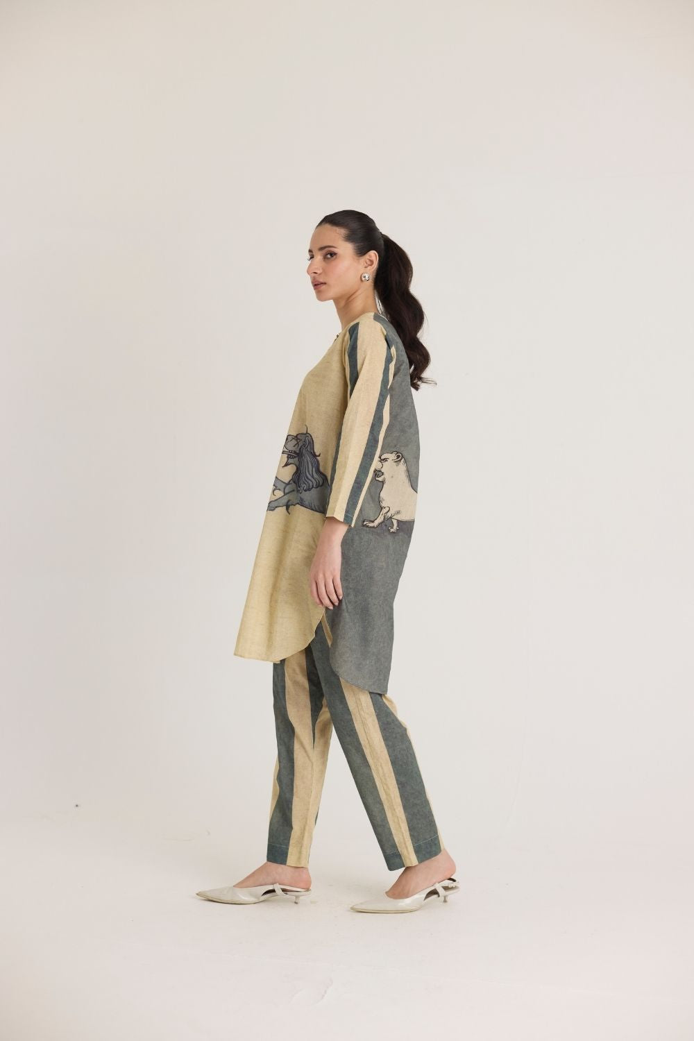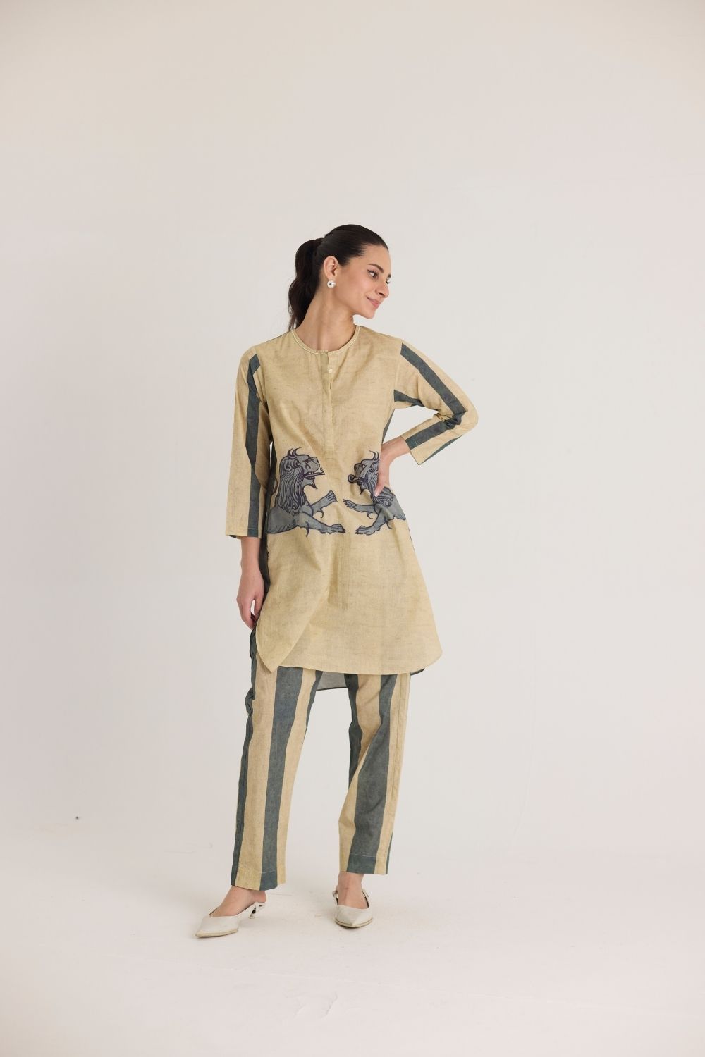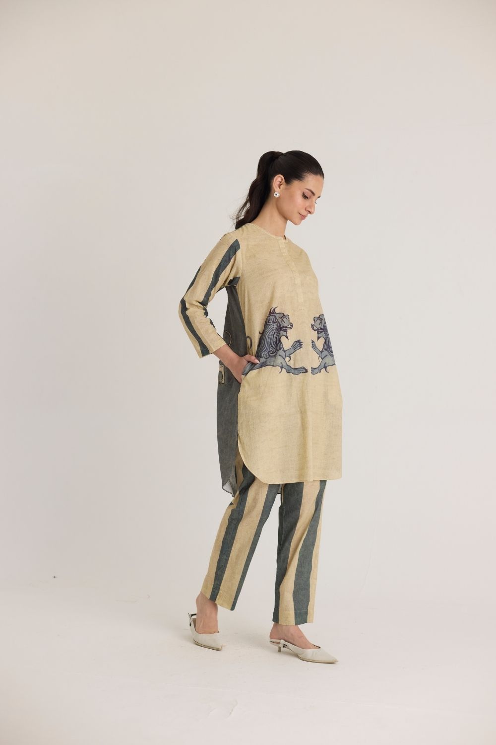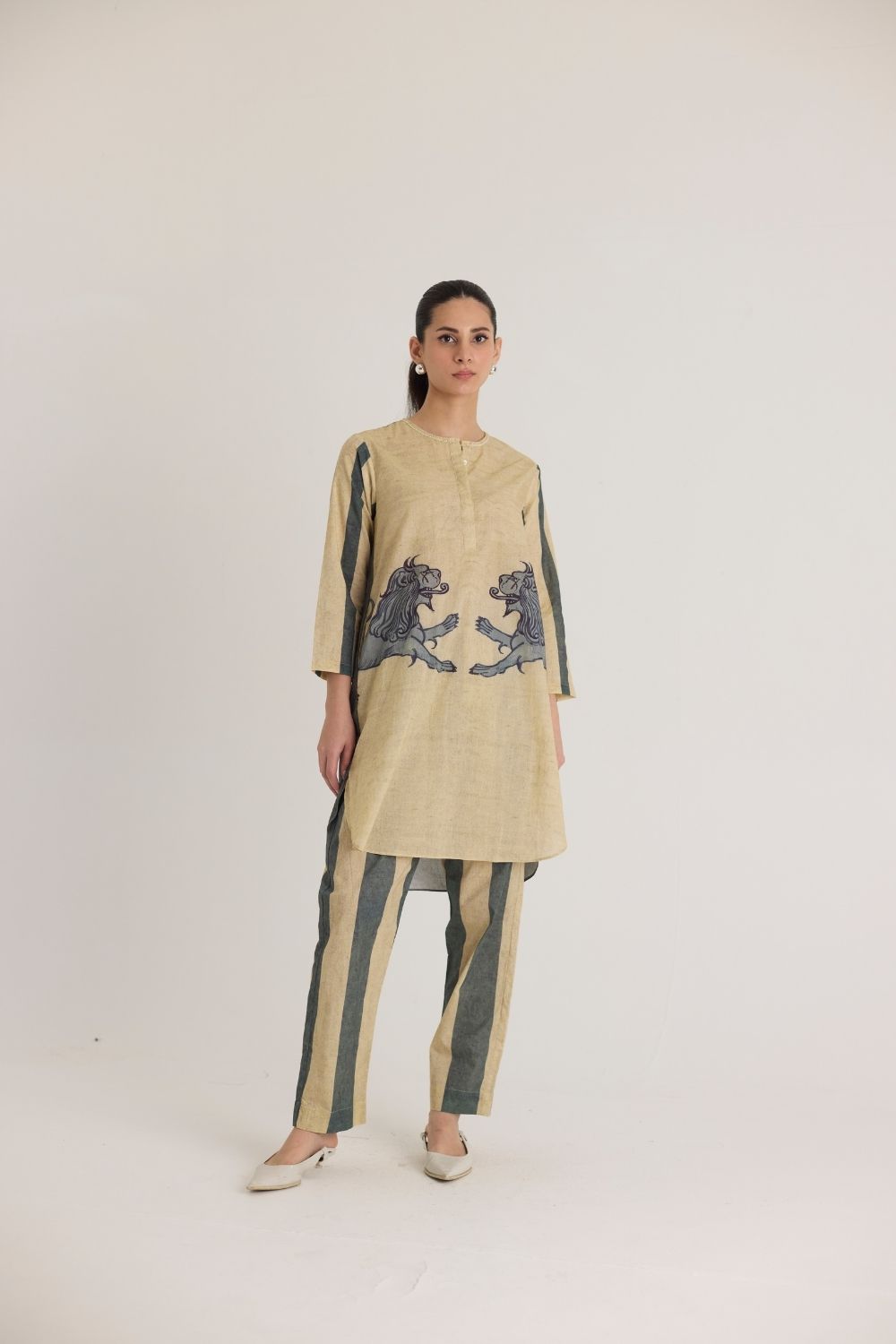 This ensemble features a striking mythical lion motif on the shirt, symbolizing strength and heritage. The hand-drawn artwork is reminiscent of traditional folk art, lending a regal yet contemporary aesthetic. Complementing the detailed print, the trousers showcase bold vertical stripes in earthy tones, adding a structured and elongated silhouette. The straight-cut kurta with a mandarin collar and matching tapered pants offer a sophisticated yet relaxed silhouette, making it perfect for both casual and semi-formal occasions.