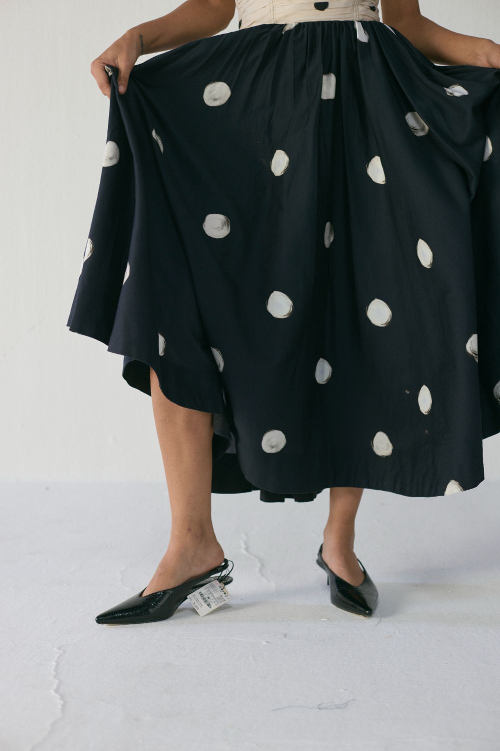 A playful yet refined mix of hand-painted dot motifs brings this piece to life. The bodice features irregular black brushstroke-style dots set against a soft, neutral base, creating an artisanal contrast. The skirt flows with larger, painterly circular prints on a deep navy background, giving the dress a dynamic, contemporary character. Each dot is intentionally imperfect, celebrating texture, movement, and craftsmanship.