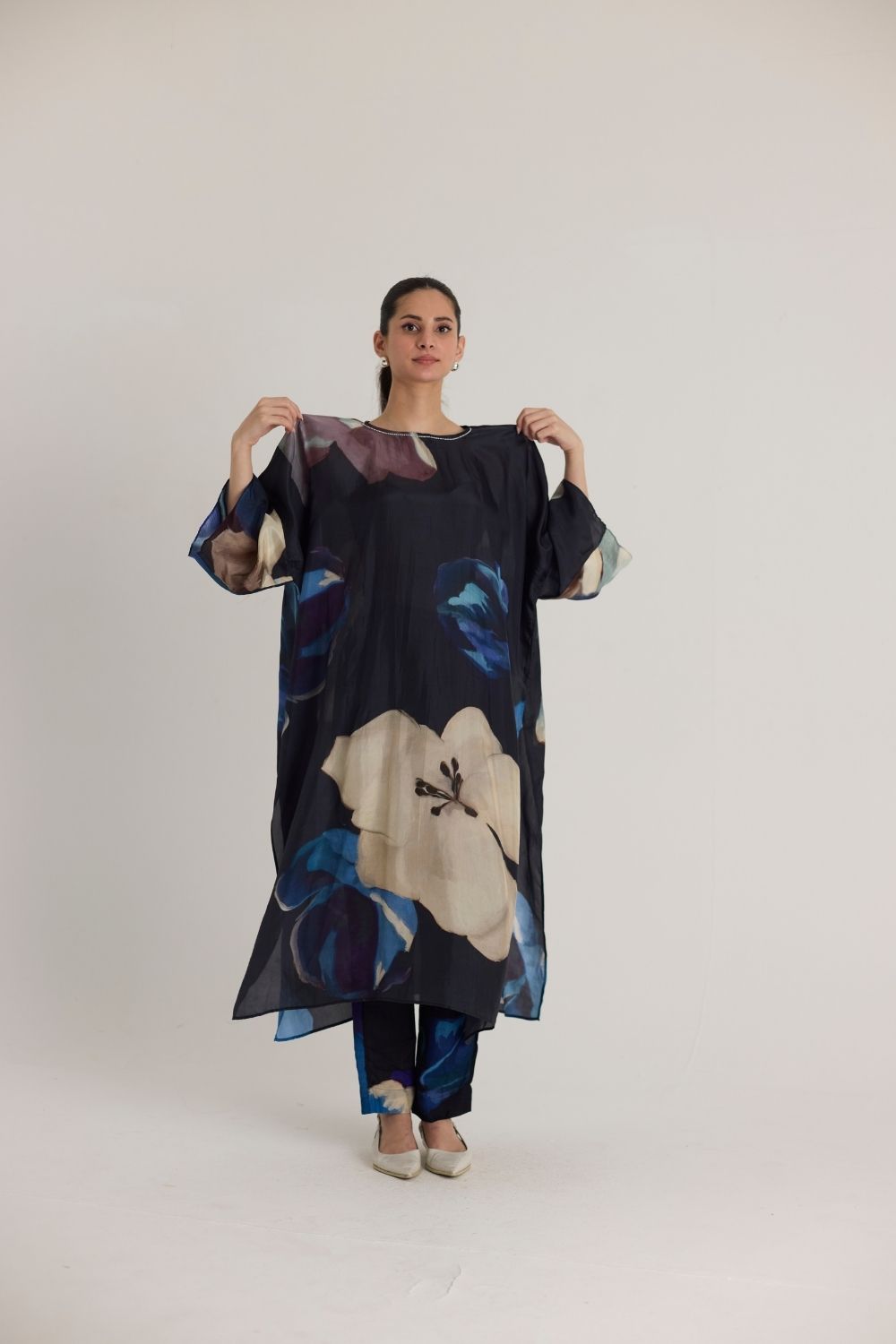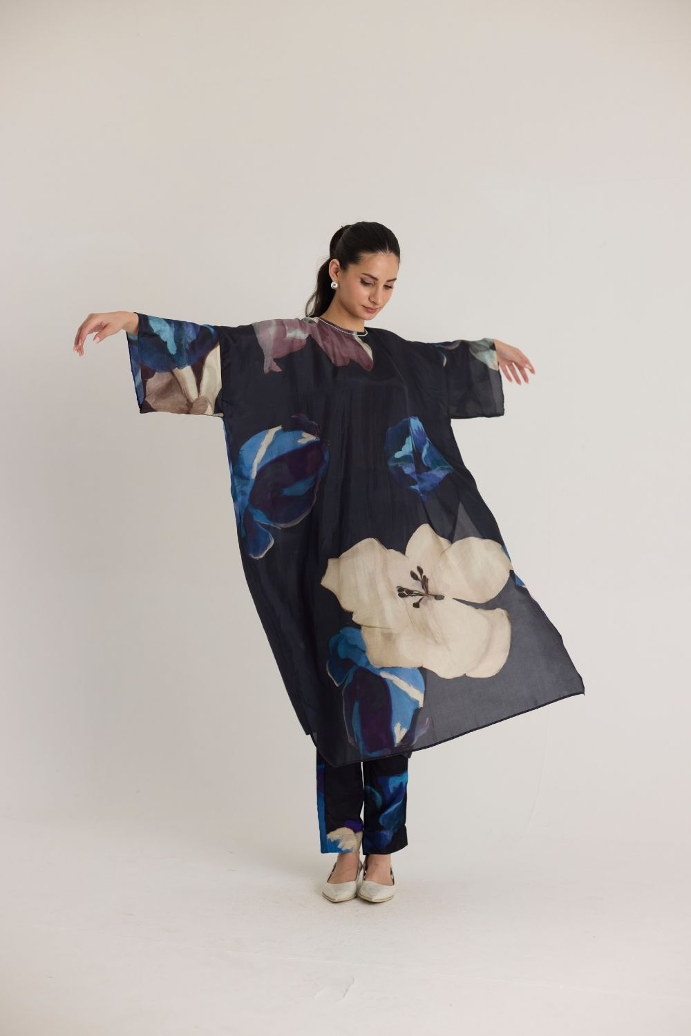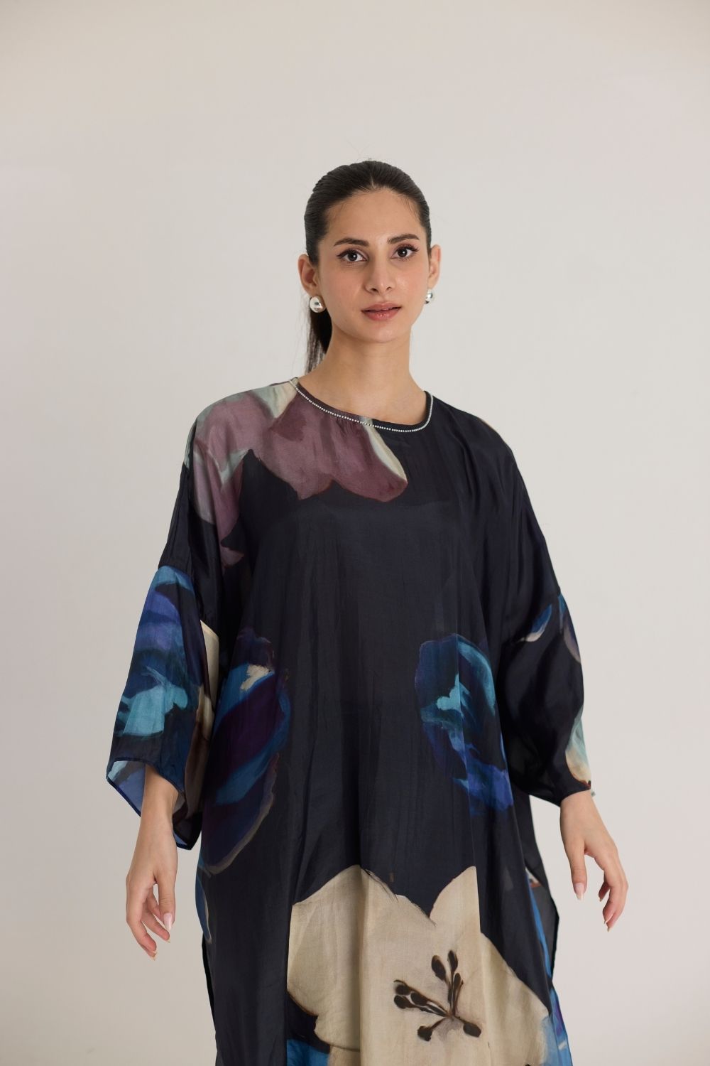 A flowy and effortlessly elegant oversized kaftan featuring a bold floral poppy print on a silk, lightweight fabric. Paired with matching tapered trousers in cotton silk, this set offers a striking blend of comfort and sophistication. The wide sleeves and relaxed silhouette add to its breezy charm, making it an ideal choice for resort wear or special occasions.