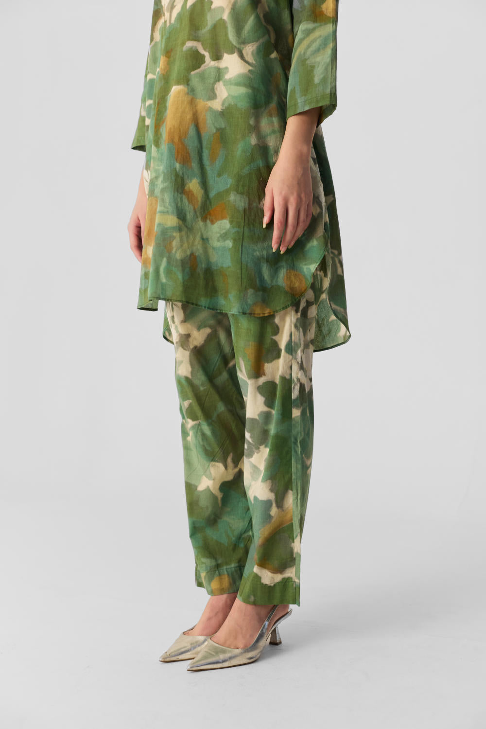 The print of this ensemble is inspired by the lush beauty of jungle flora, featuring vintage-style flowers that evoke a sense of natural elegance. The intricate design blends vibrant blooms with a timeless aesthetic Crafted from soft cotton fabric, the kurta has a round neckline with a front buttoned placket and practical side pockets for added convenience. It is paired with matching printed pants that feature an elasticated waist with front drawstrings for a comfortable fit. The pants also include side pockets, ensuring both style and functionality in this chic ensemble. Perfect for any casual outing or relaxed gathering.