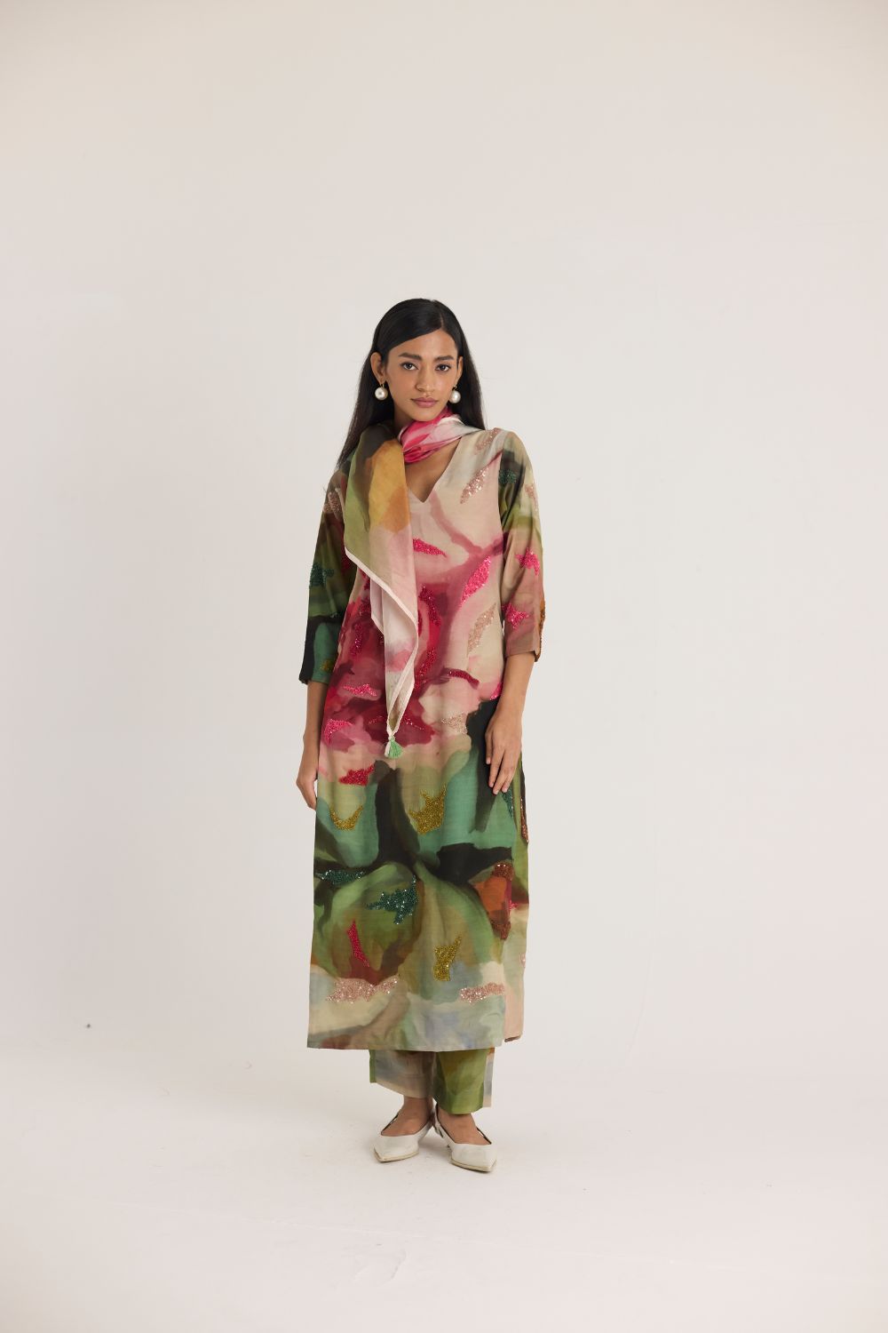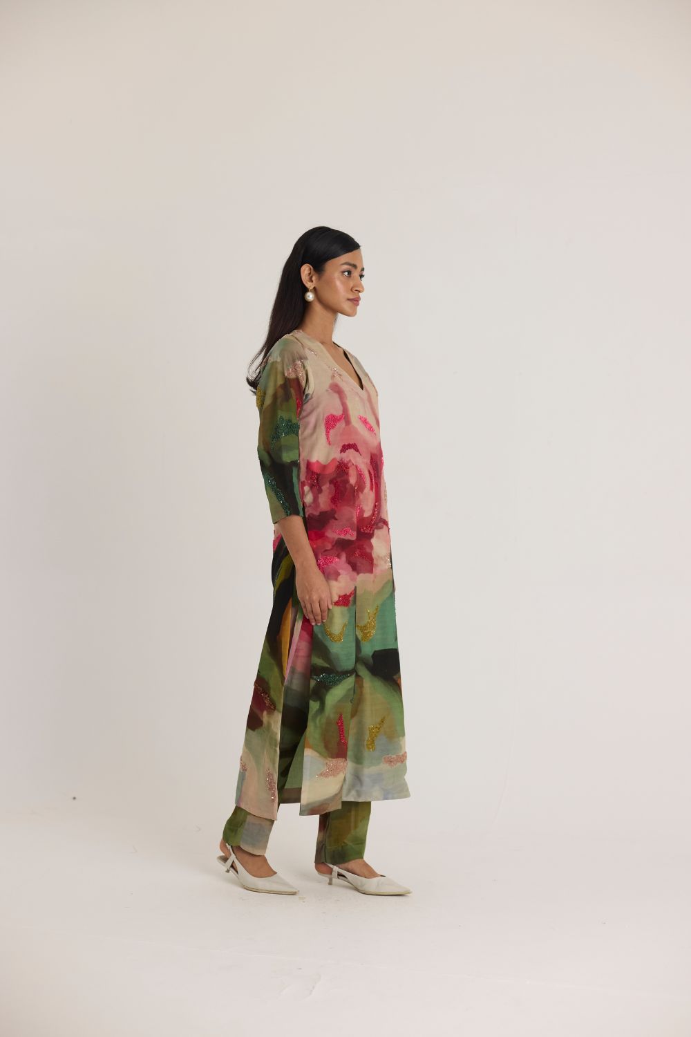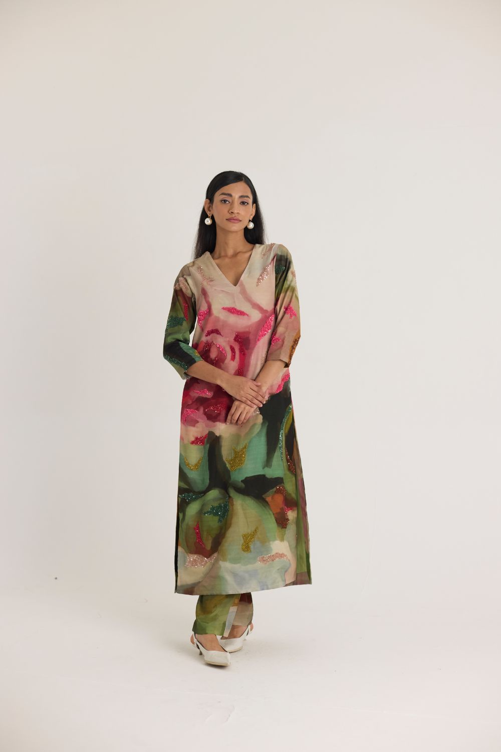 A sophisticated and artistic ensemble, this V-neck kaftan features an ethereal hand-painted floral print with oversized blooming roses in rich hues of deep red, blush pink, and earthy green. The abstract watercolor-like design gives it a dreamy and elegant appeal. Print & Embellishments: The print is a fusion of impressionist-inspired floral motifs, blending shades of olive, burgundy, and soft beige for a nature-inspired palette. Delicate hand-embellished beadwork and sequins trace the floral contours, adding dimension and a touch of shimmer. Sequins in shades of red, pink, gold, and green are intricately placed to highlight the organic movement of the pattern.