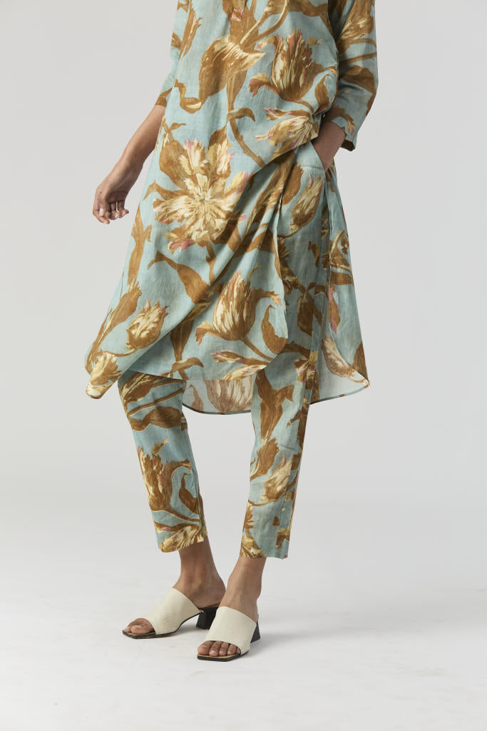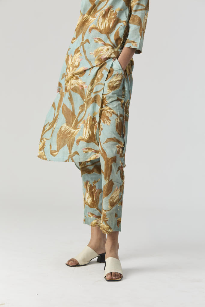 The set is crafted in the Trevi print carefully printed on Cotton Cambric. The Kurta has concealed placket with the button and the beadwork detailing on the neckline. The set includes a Kurta and pants with drawstring front and back elastic.