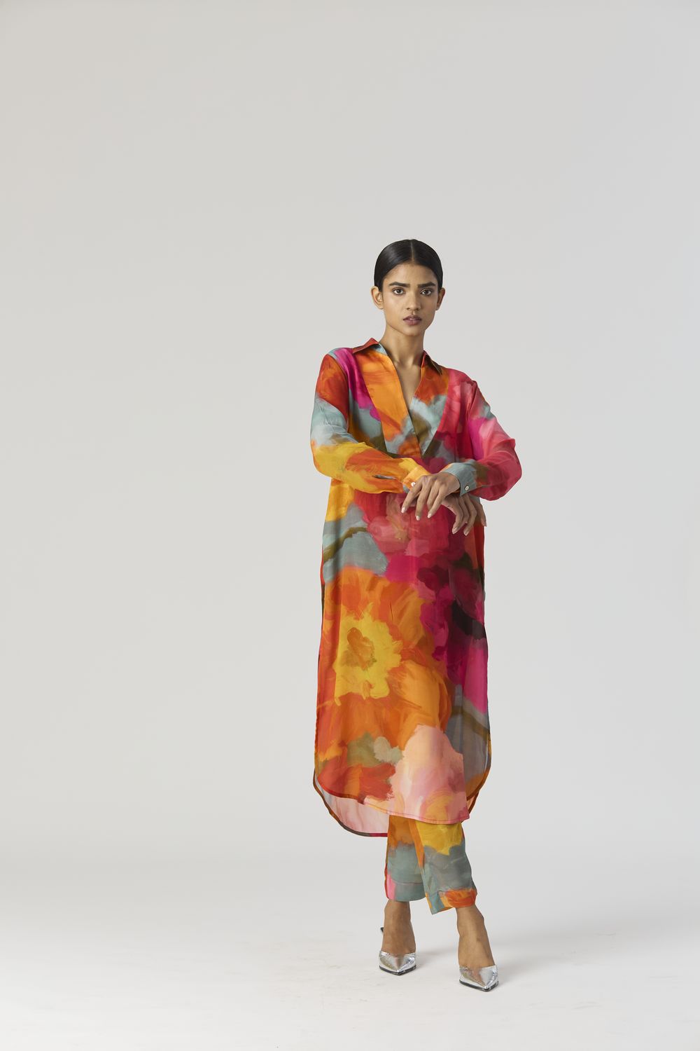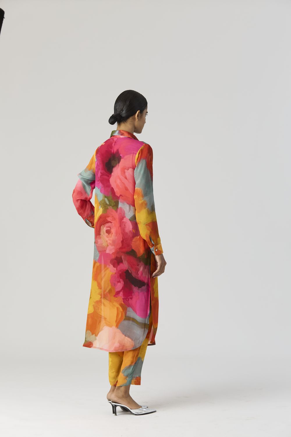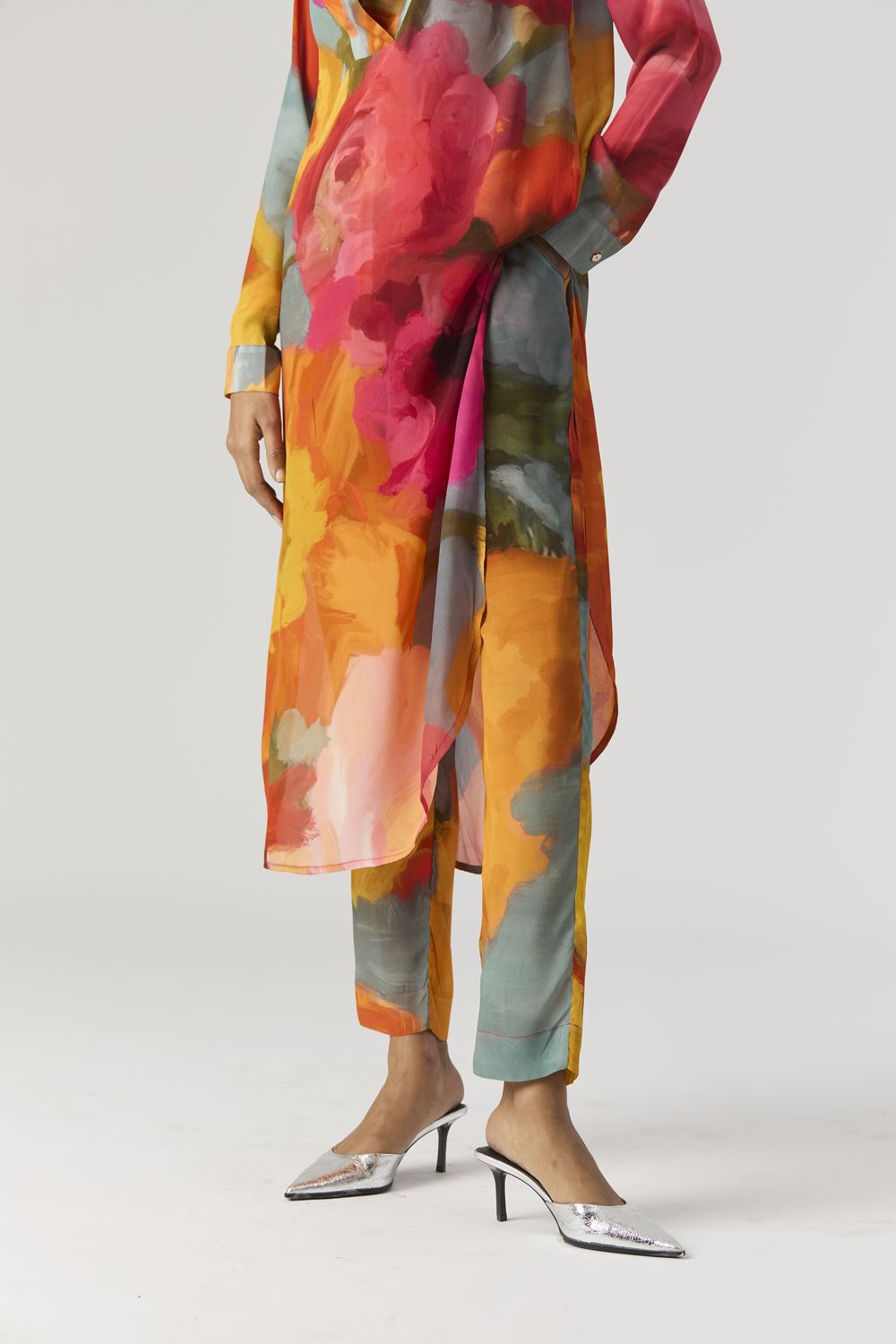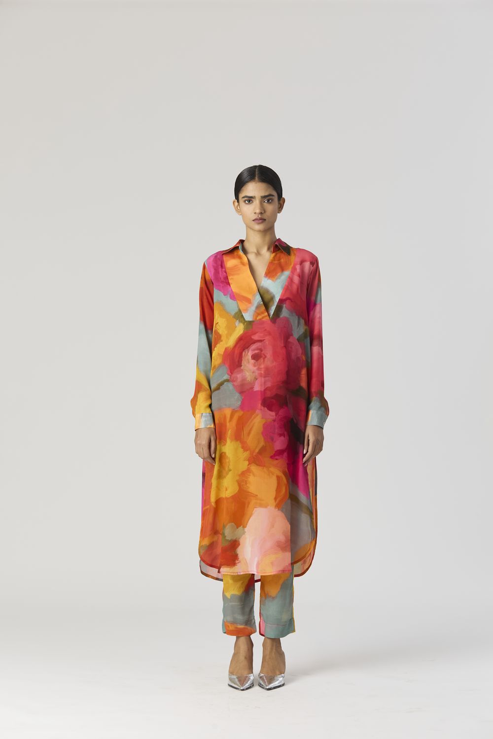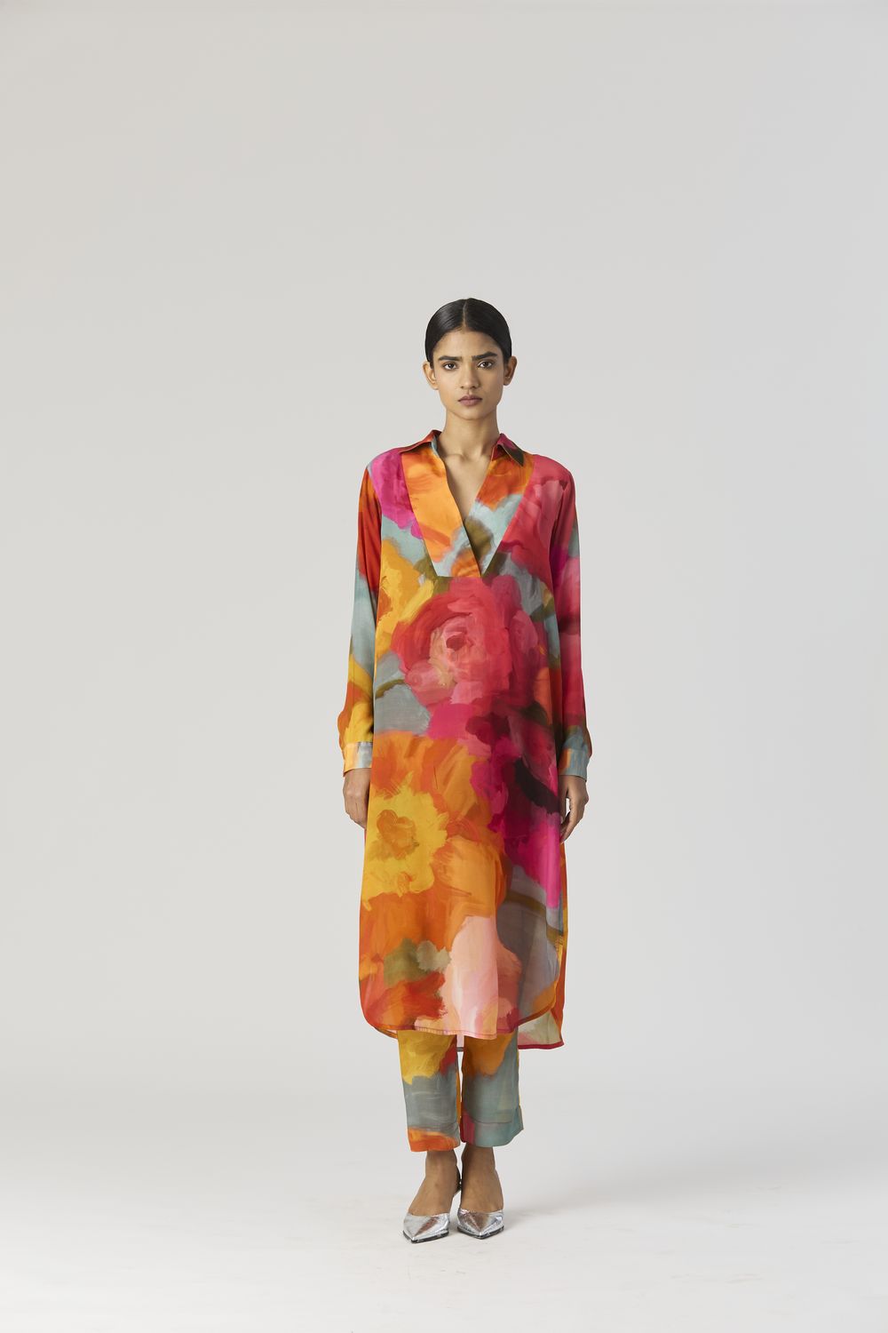 A relaxed fit Kurta and Pant crafted in the Veronica print carefully printed on Crepe. It has pockets and comes with pants in the same print.