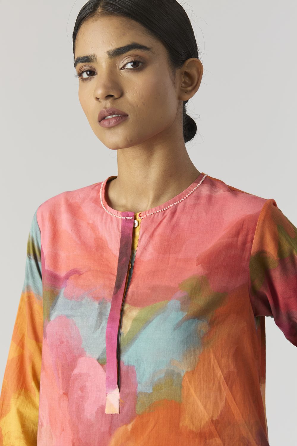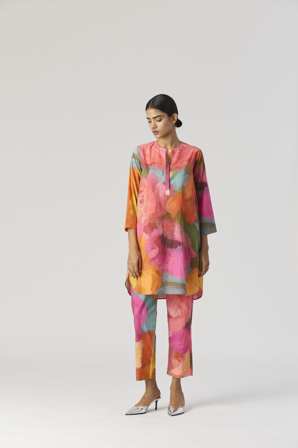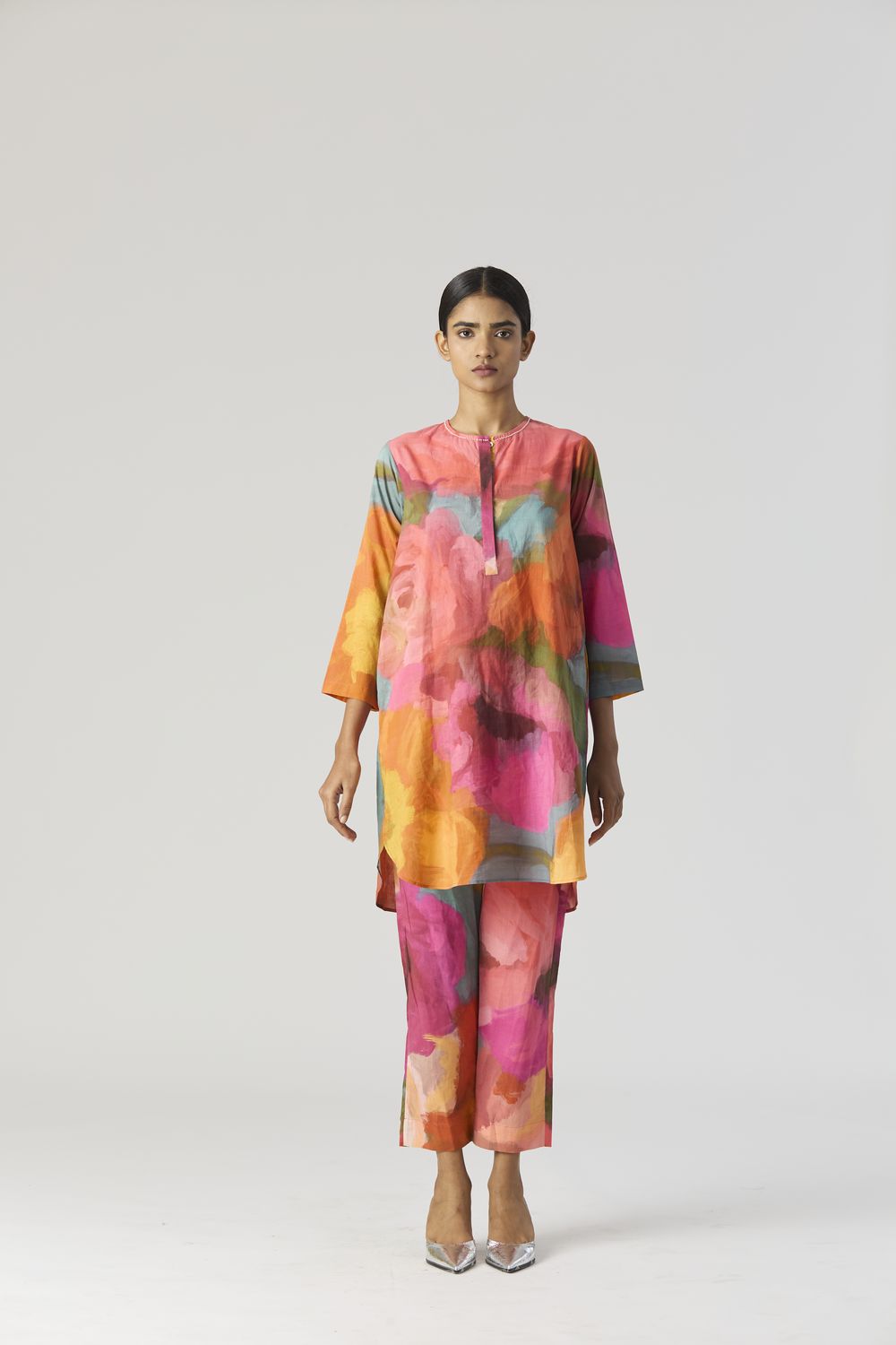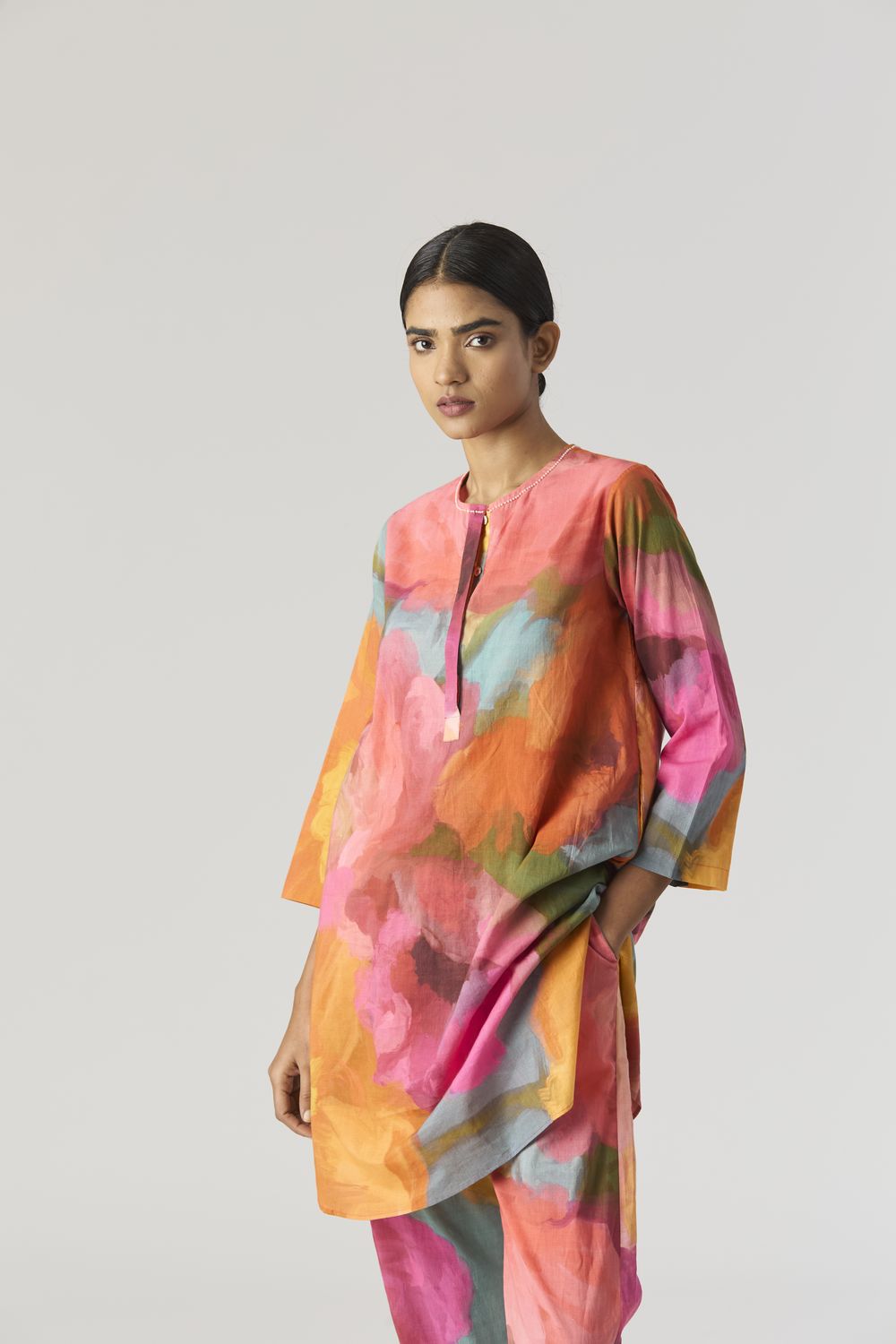 A relaxed fit tunic crafted in the Veronica print carefully printed on Cotton cambric featuring white beadworks on the neck. It has pockets and comes with pants in the same print.