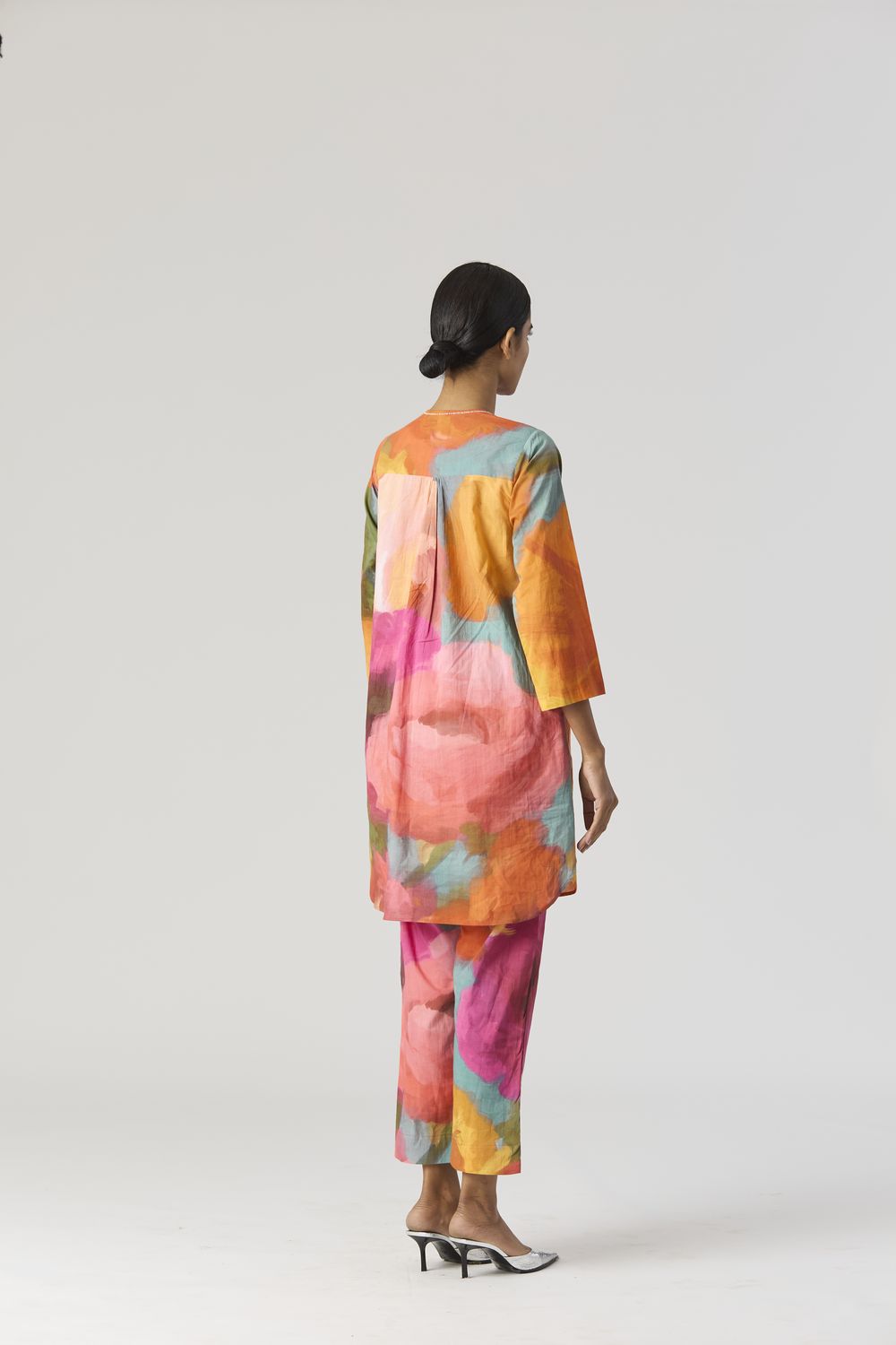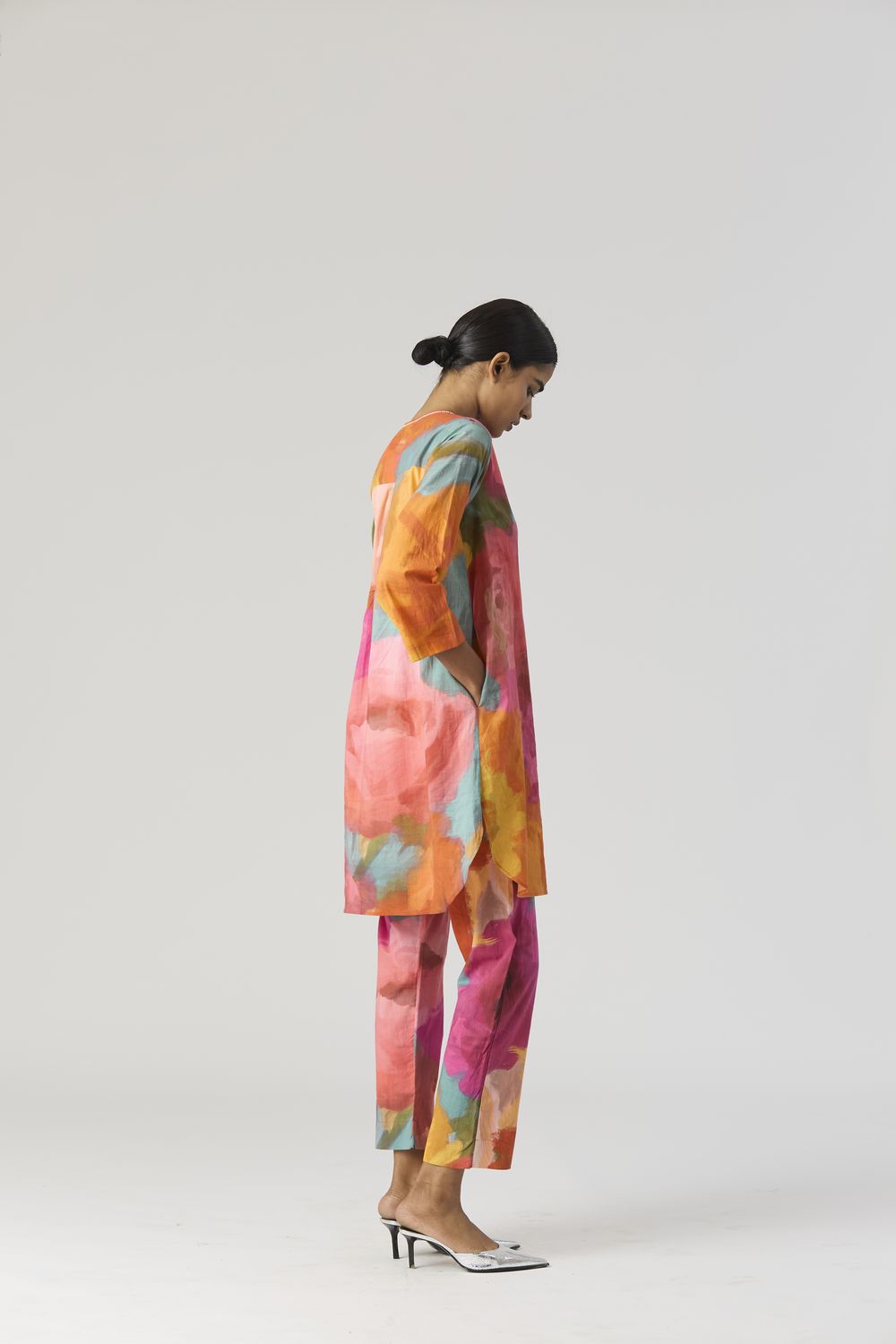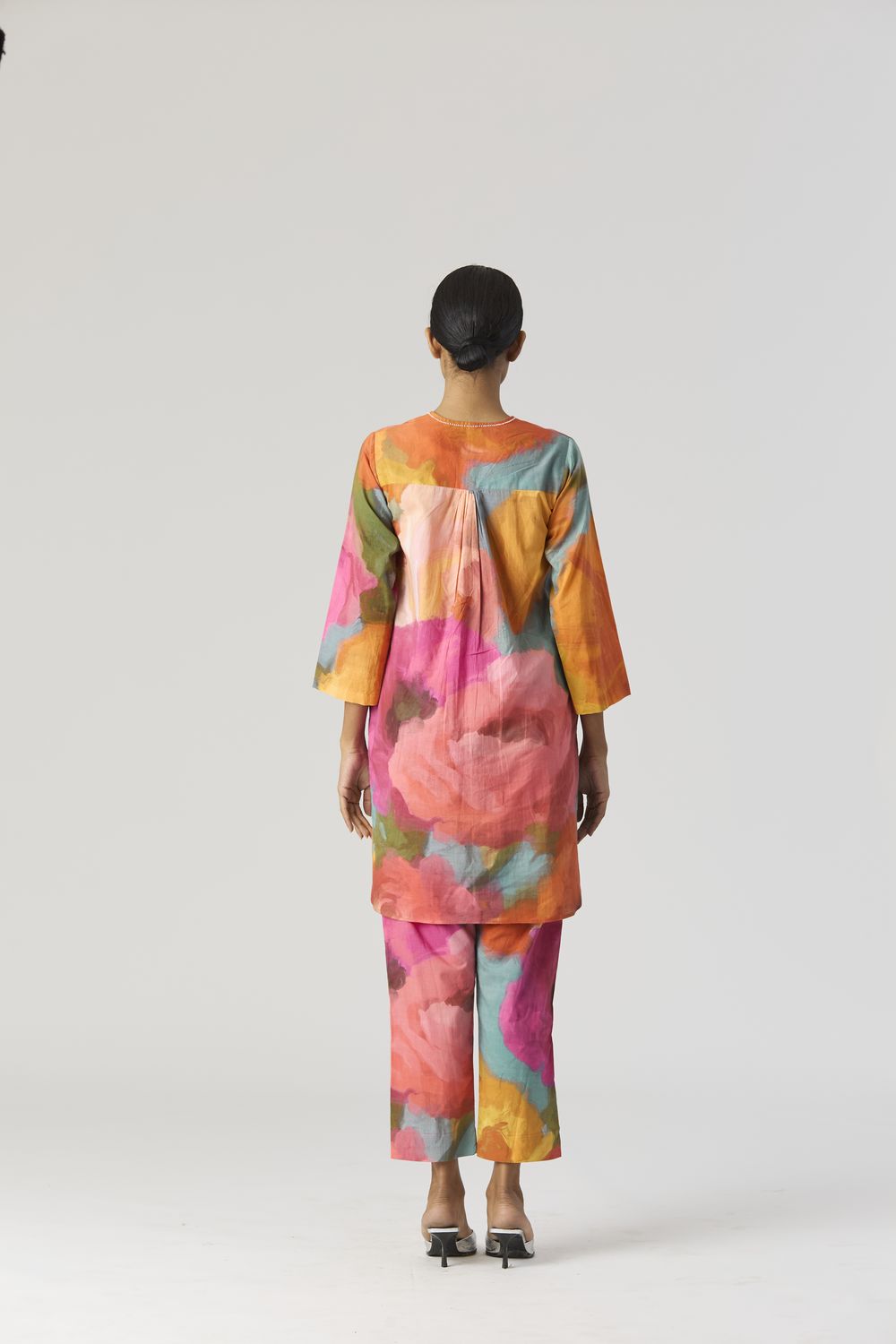 A relaxed fit tunic crafted in the Veronica print carefully printed on Cotton cambric featuring white beadworks on the neck. It has pockets and comes with pants in the same print.