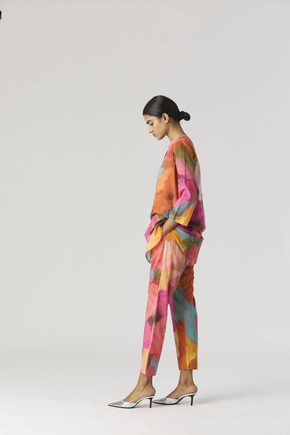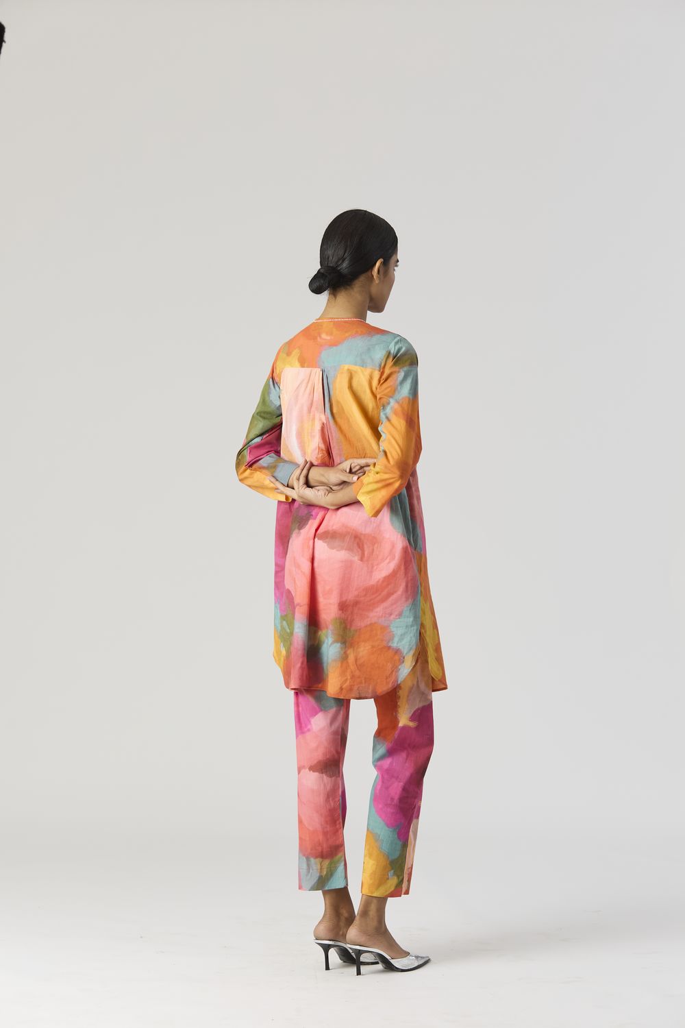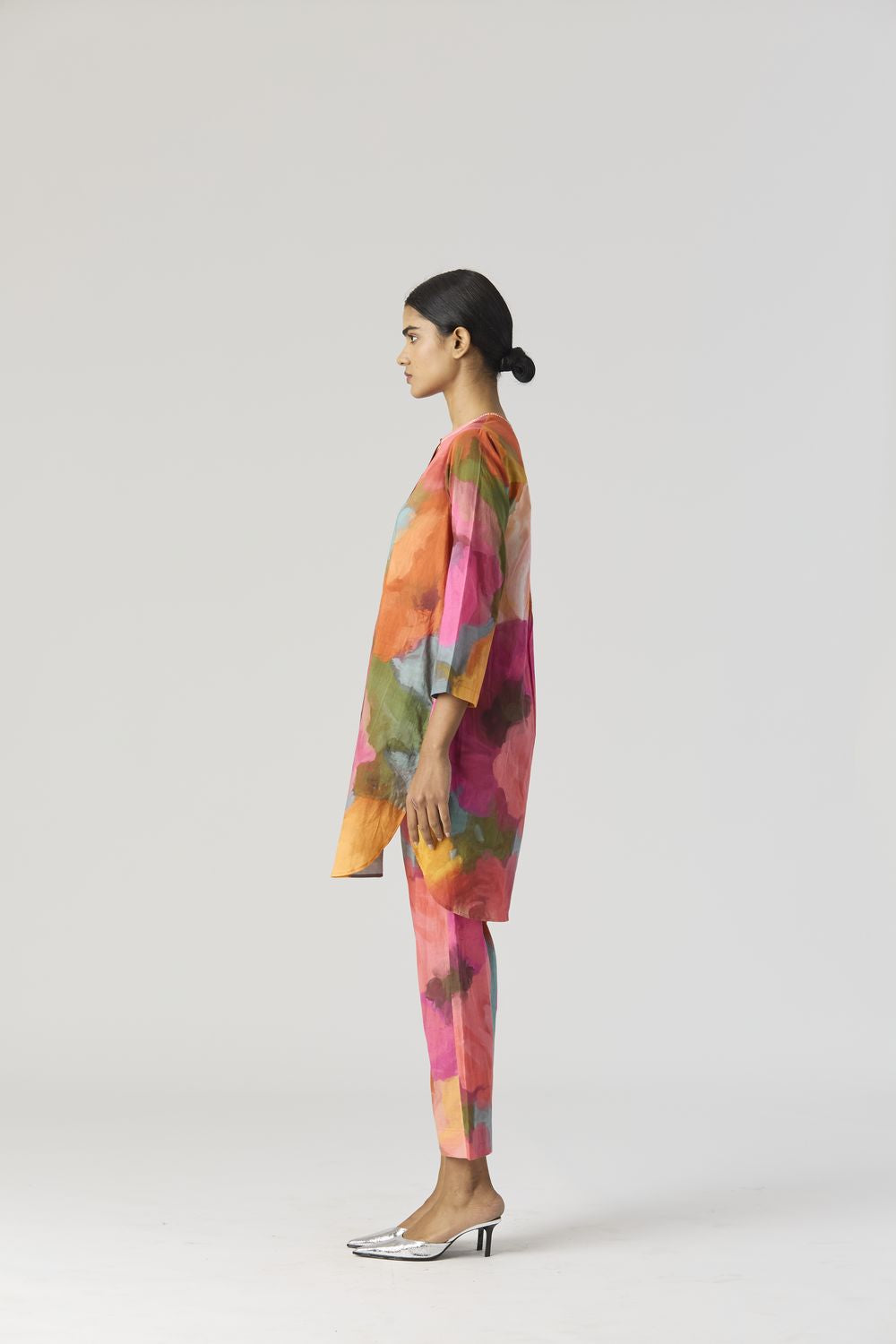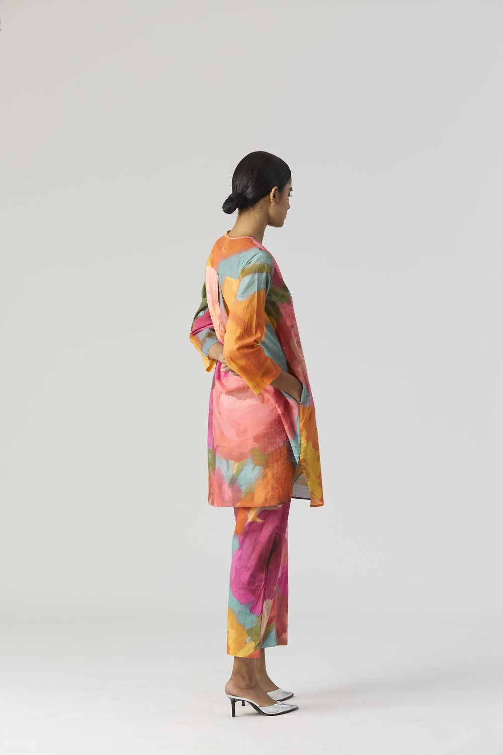 A relaxed fit tunic crafted in the Veronica print carefully printed on Cotton cambric featuring white beadworks on the neck. It has pockets and comes with pants in the same print.