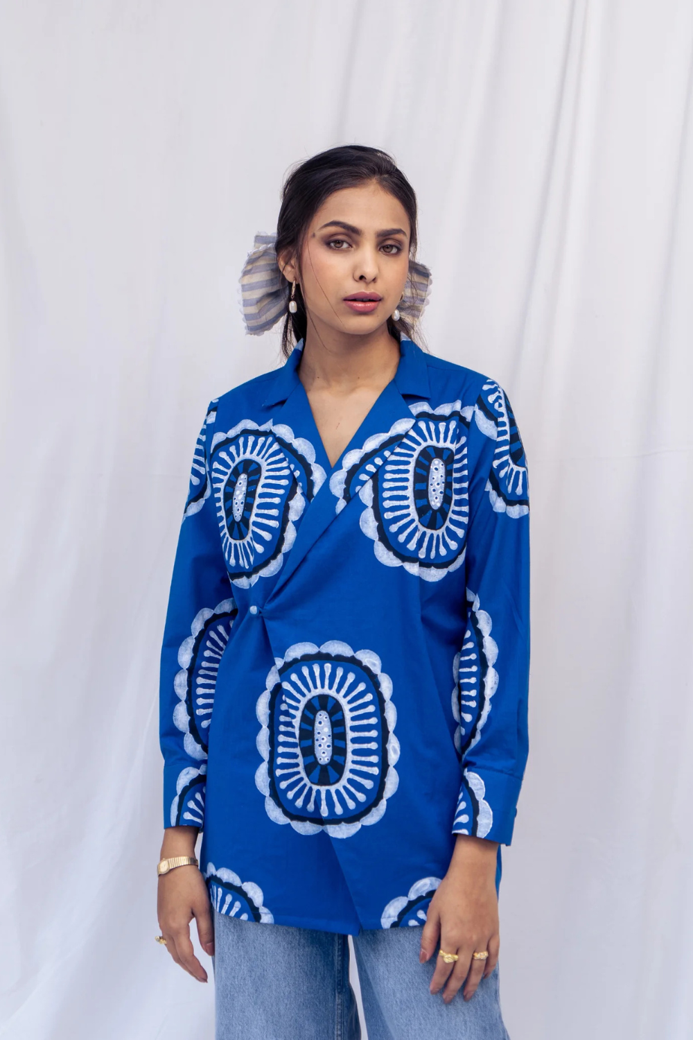 This wrap shirt keeps it simple but never boring. Fabric buttons add a thoughtful touch, and the cuffed full sleeves bring a hint of structure. It’s the kind of piece that works wherever you need it—no fuss, just easy style.