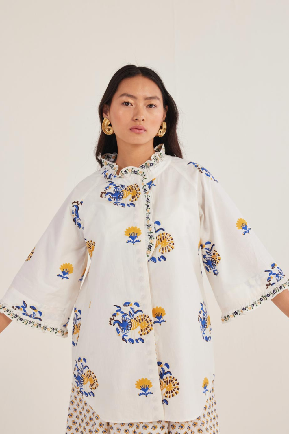 Summer whites for the win! A breezy, handblock-printed shirt with a ruffled collar and wide sleeves. Effortlessly chic, with intricate floral motifs that bring a touch of sunshine to your wardrobe.