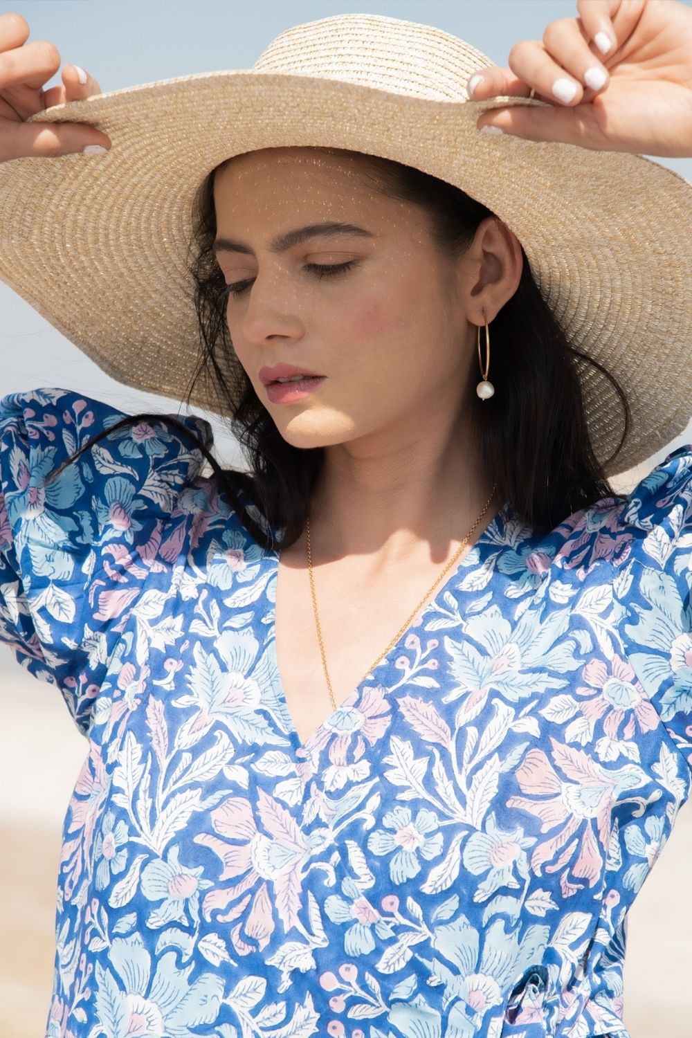 Wrap dresses are versatile and can be tied in multiple ways. This one is handblock printed in a blue brighter than the sky and has loads of volume and flounce. The puffed sleeves complete the look and tie it all together! Dress is down for a sunday brunch, or dress is up for an intimate dinner with friends.