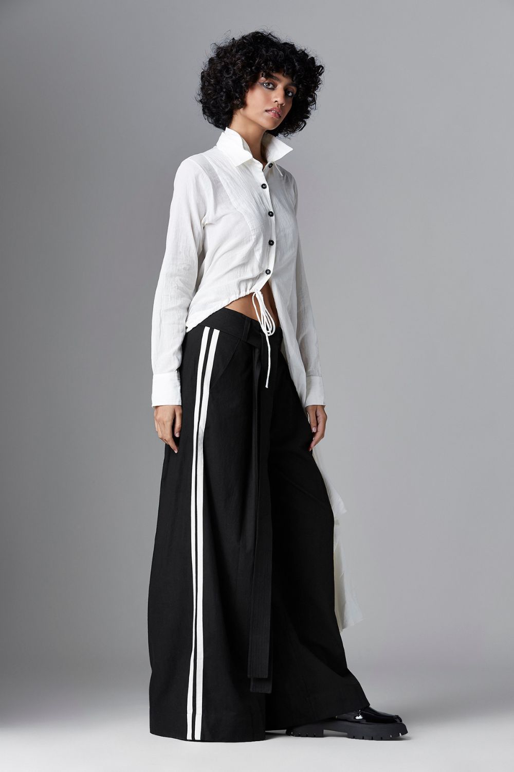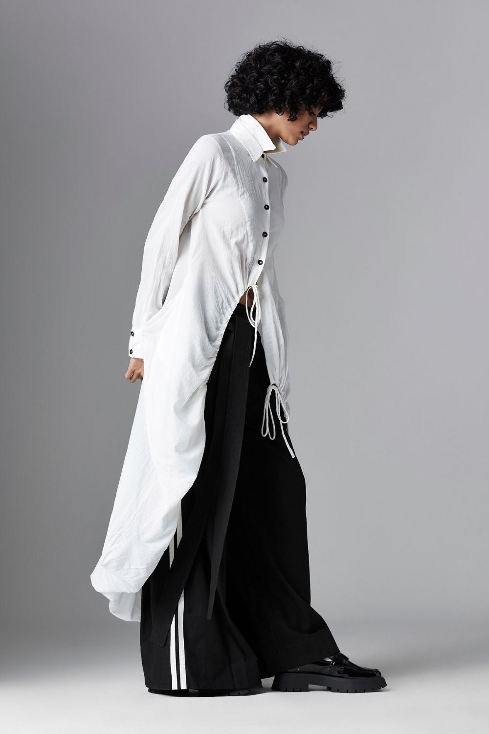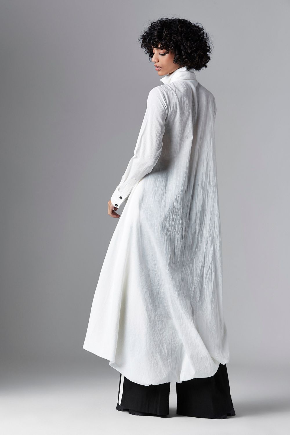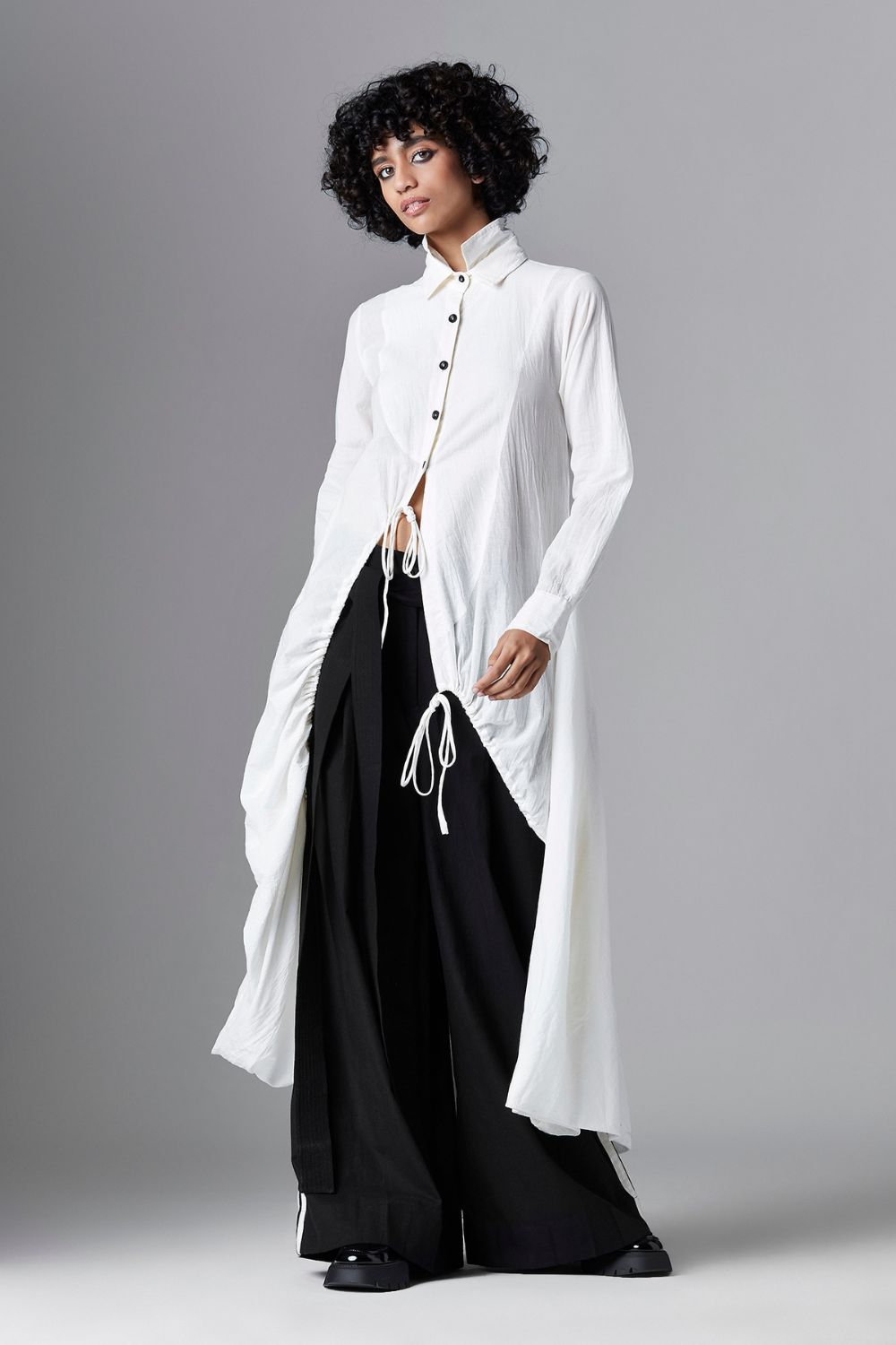 The Deanna shirt features a double shirt collar, half front button placket, narrow full sleeves and drawstring at the hem.