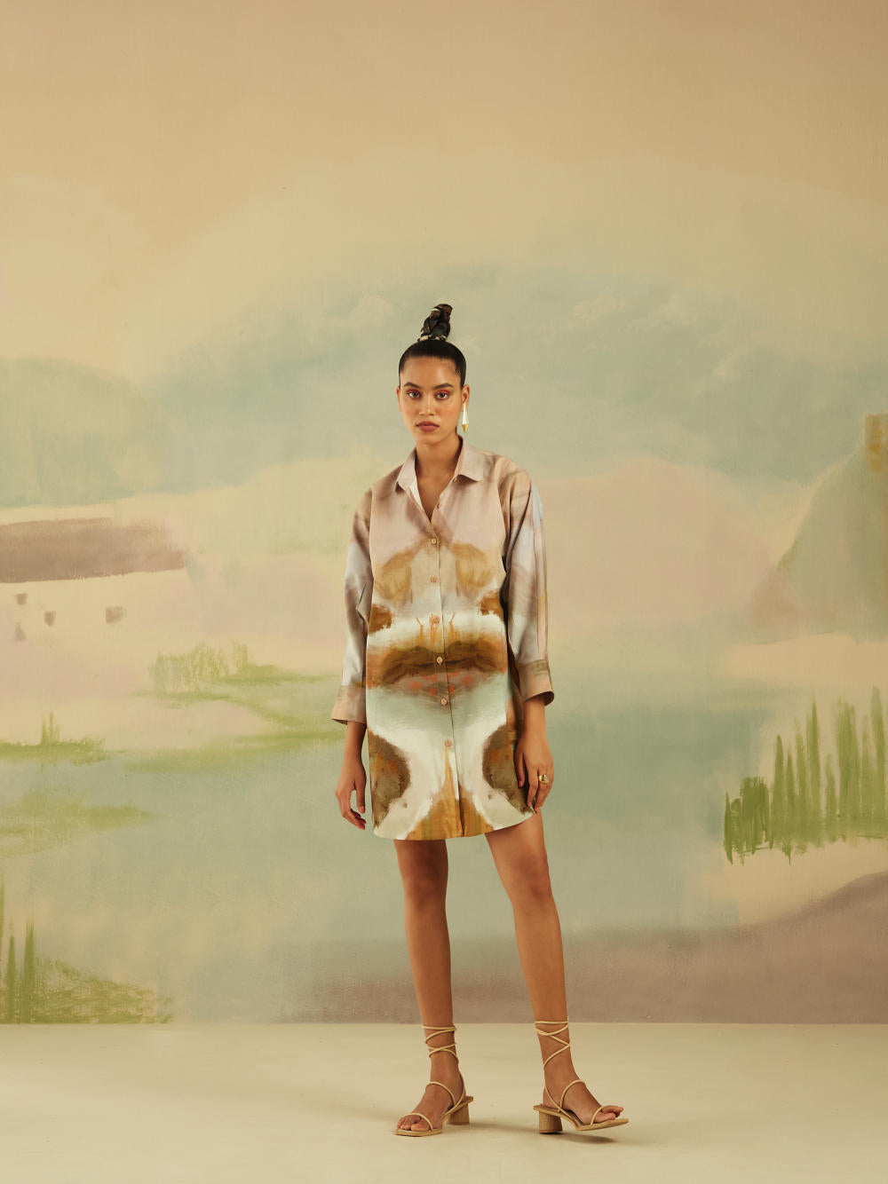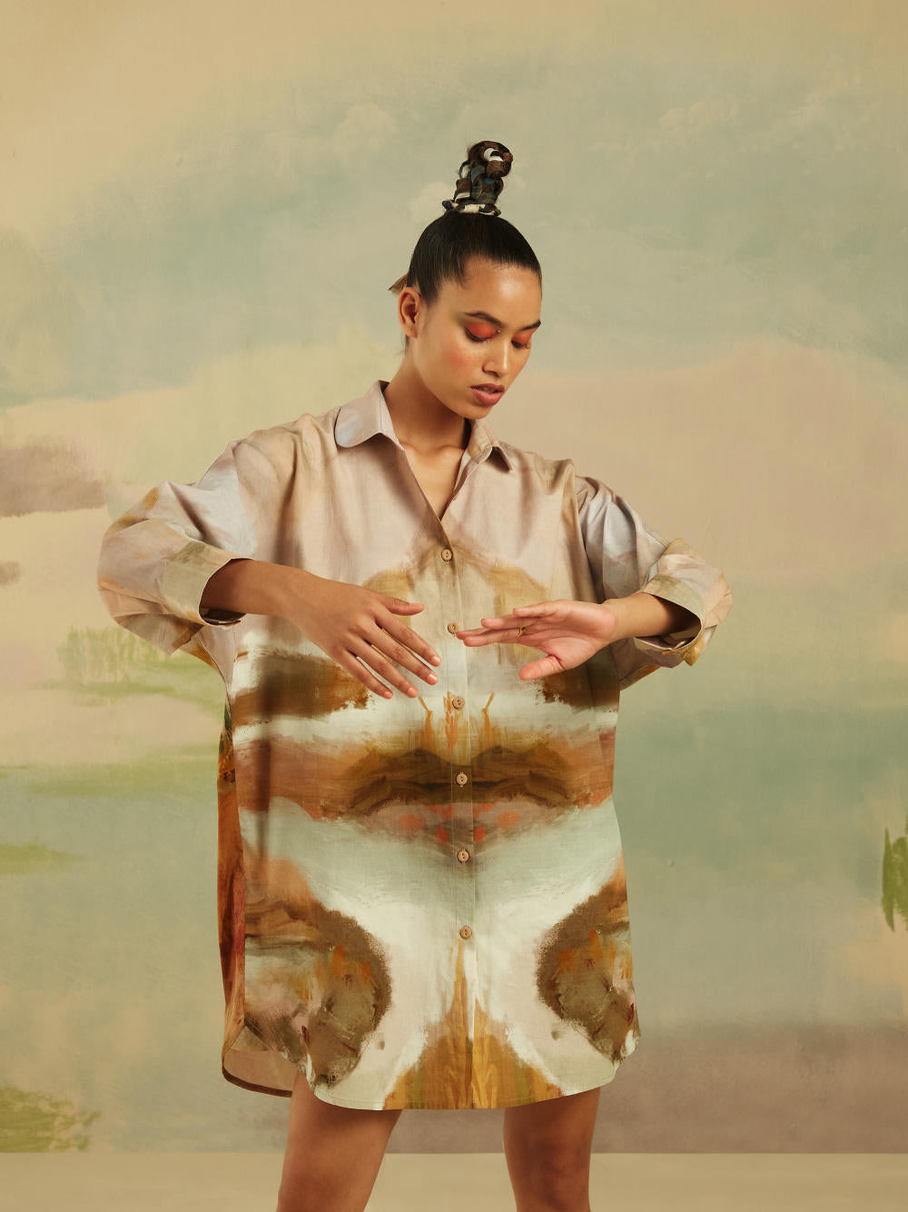 This shirt-dress is made in a one-size-fits-all silhouette with droopy shoulders. With full sleeves and a mid-thigh length, the shirt dress features round-flat shirt collars and a front opening with wooden buttons. The boxy silhouette can be tapered around the waist with a belt or a crossbody bag to accentuate the look.