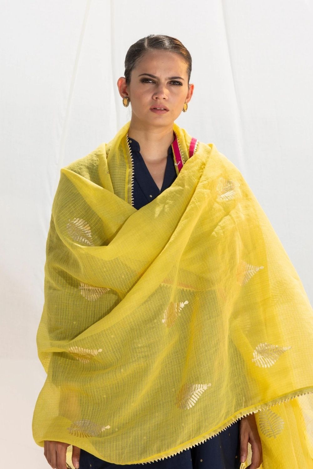 The dupatta comes with a kota doria border and overall gold foil leaf print adding a pinch of color to this timeless piece.