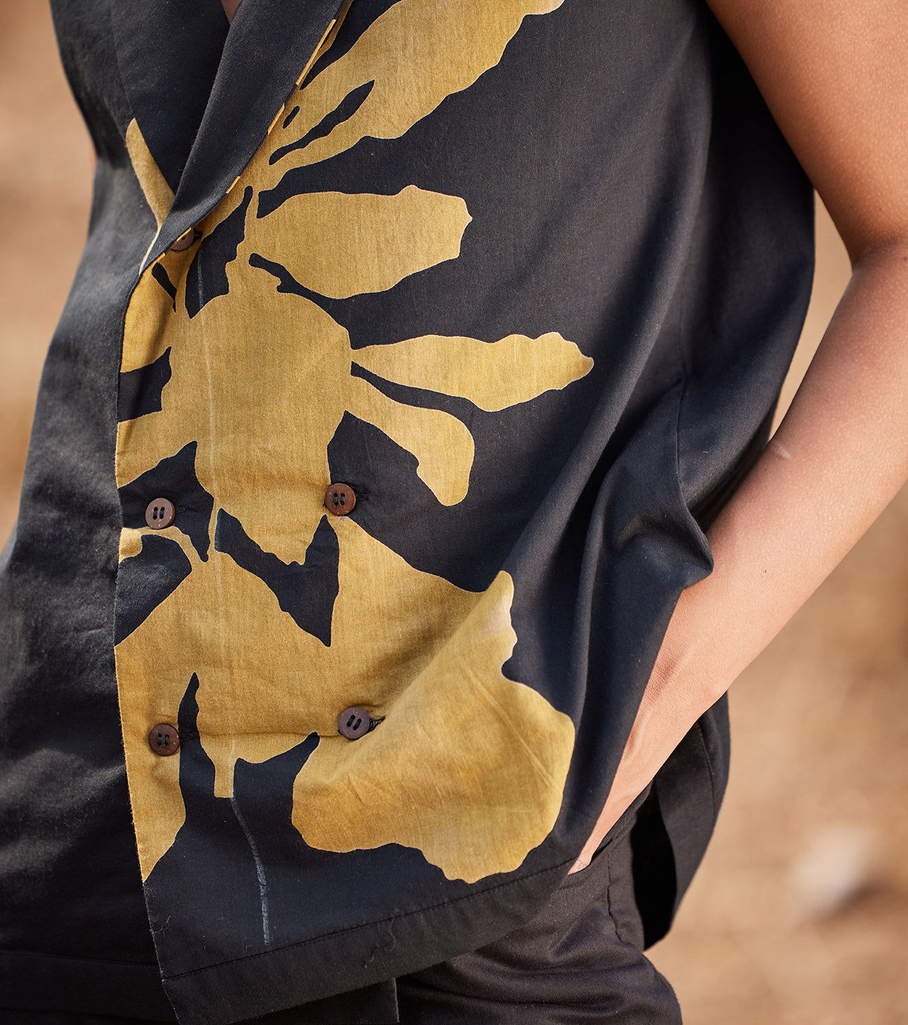 A classic black co ord set featuring a floral printed waistcoat with shawl lapels paired with solid wide bottoms crafted in breathable cotton fabric. - Handcrafted in India. - 2 Side pockets