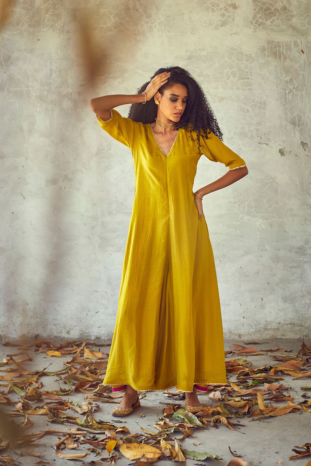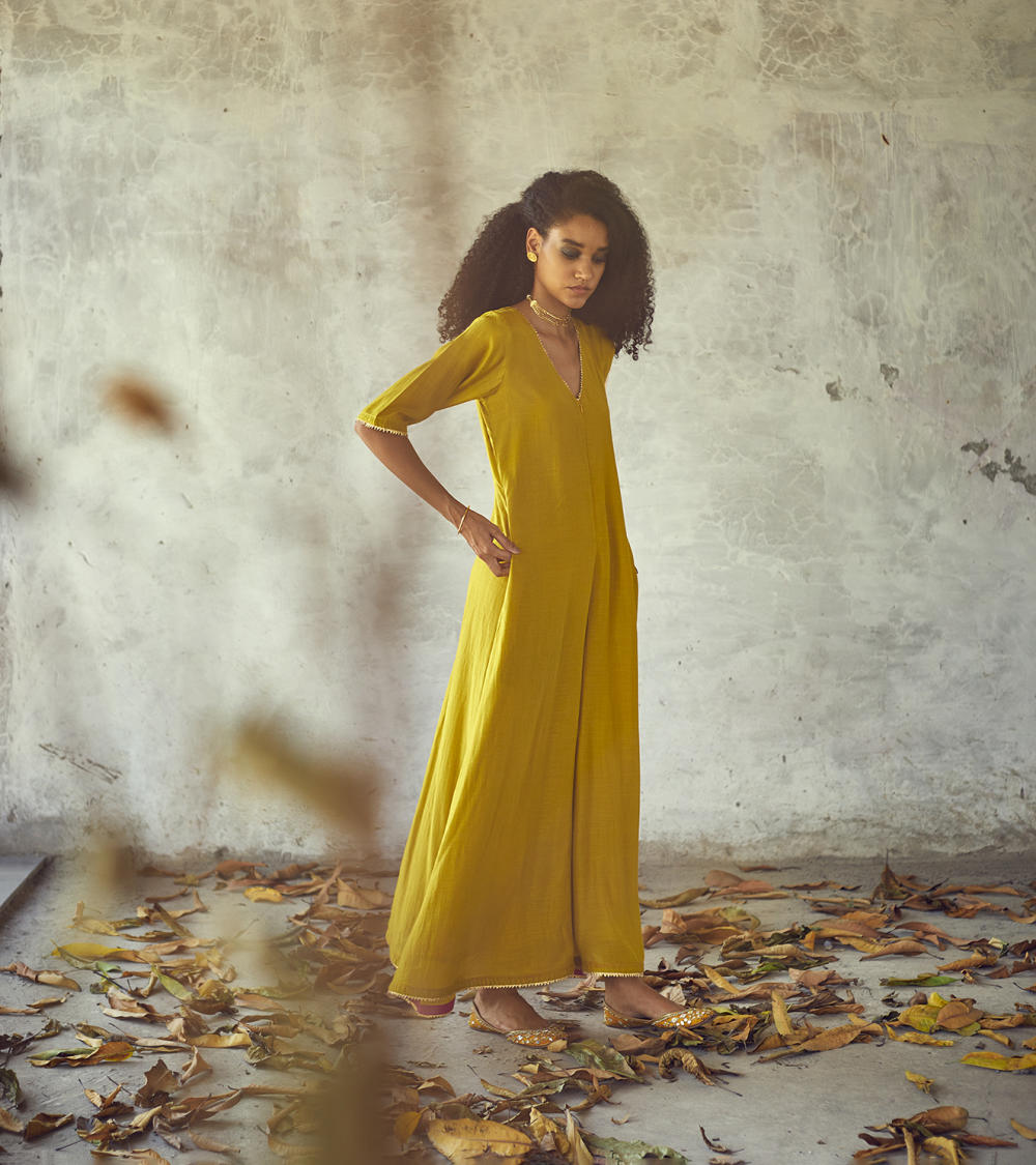 Fluid jumpsuit crafted in cotton silk with delicate gota finishing on the hemline and sleeves. A v - neck front zipper opening and peek - a - boo hemline finishing.
