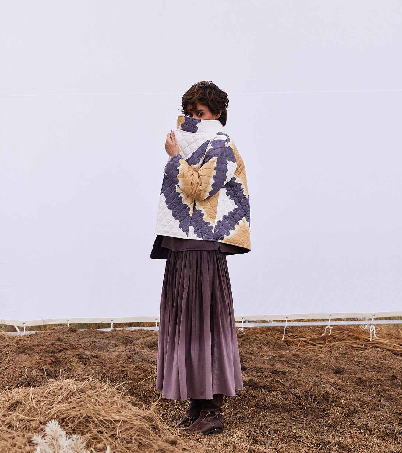 Rooted in handloom cotton and natural dyes, Khara Kapas works with the simplest geometry — circles, squares, triangles — and turns them into silhouettes that feel effortless, global, and emotionally familiar. There is a stillness to their clothes, a sense of returning to slower rhythms and honest materials, without ever losing relevance.