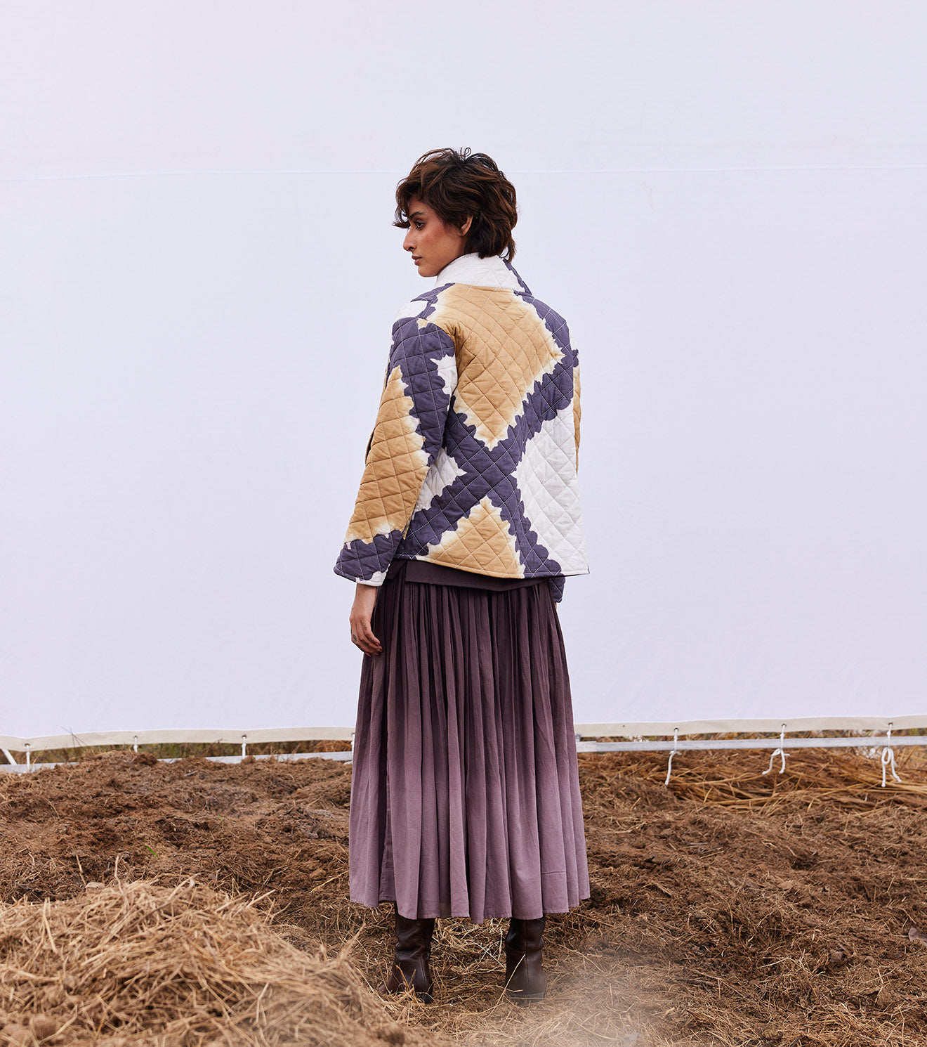 A shibori multi-coloured mul quilted jacket with stand up collar, full sleeves and mauve purple lining.