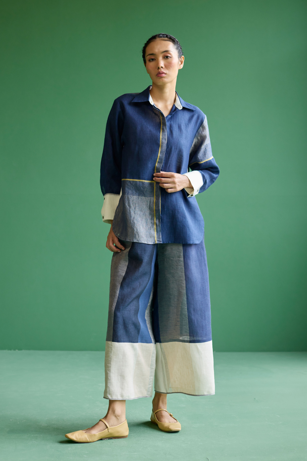 This chic and contemporary color-blocked shirt is crafted from our signature soft, handwoven metallic border linen with an ochre-coloured selvage; it features a button-down concealed placket, full sleeves, with contrasted cuffs finished with brass buttons.