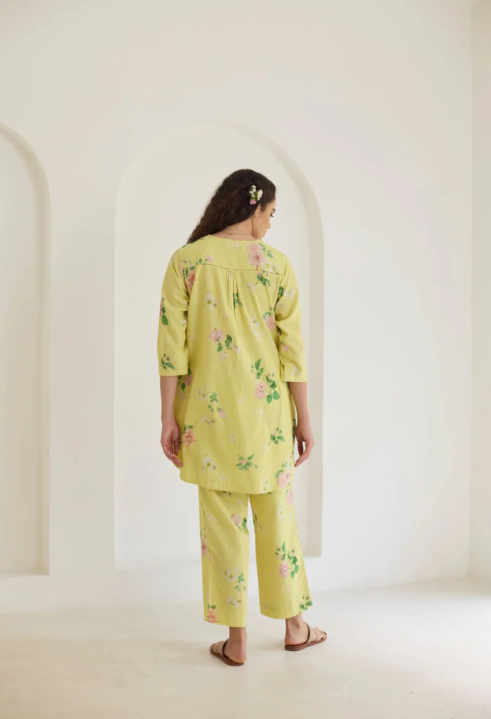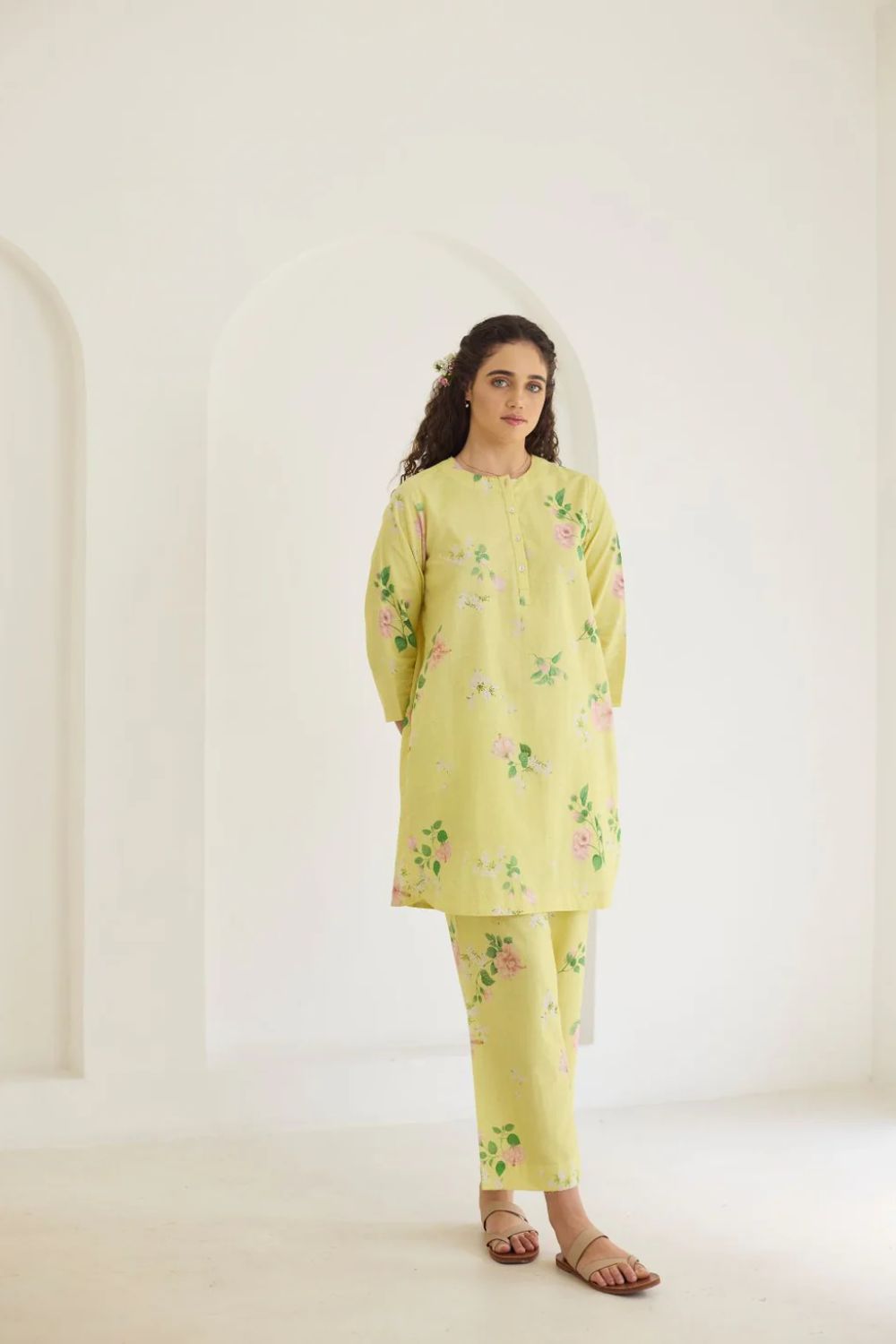Model is 5 feet 9 inches tall and wearing a size small. Kurta Length 35 inches. Pant Length 36 inches.