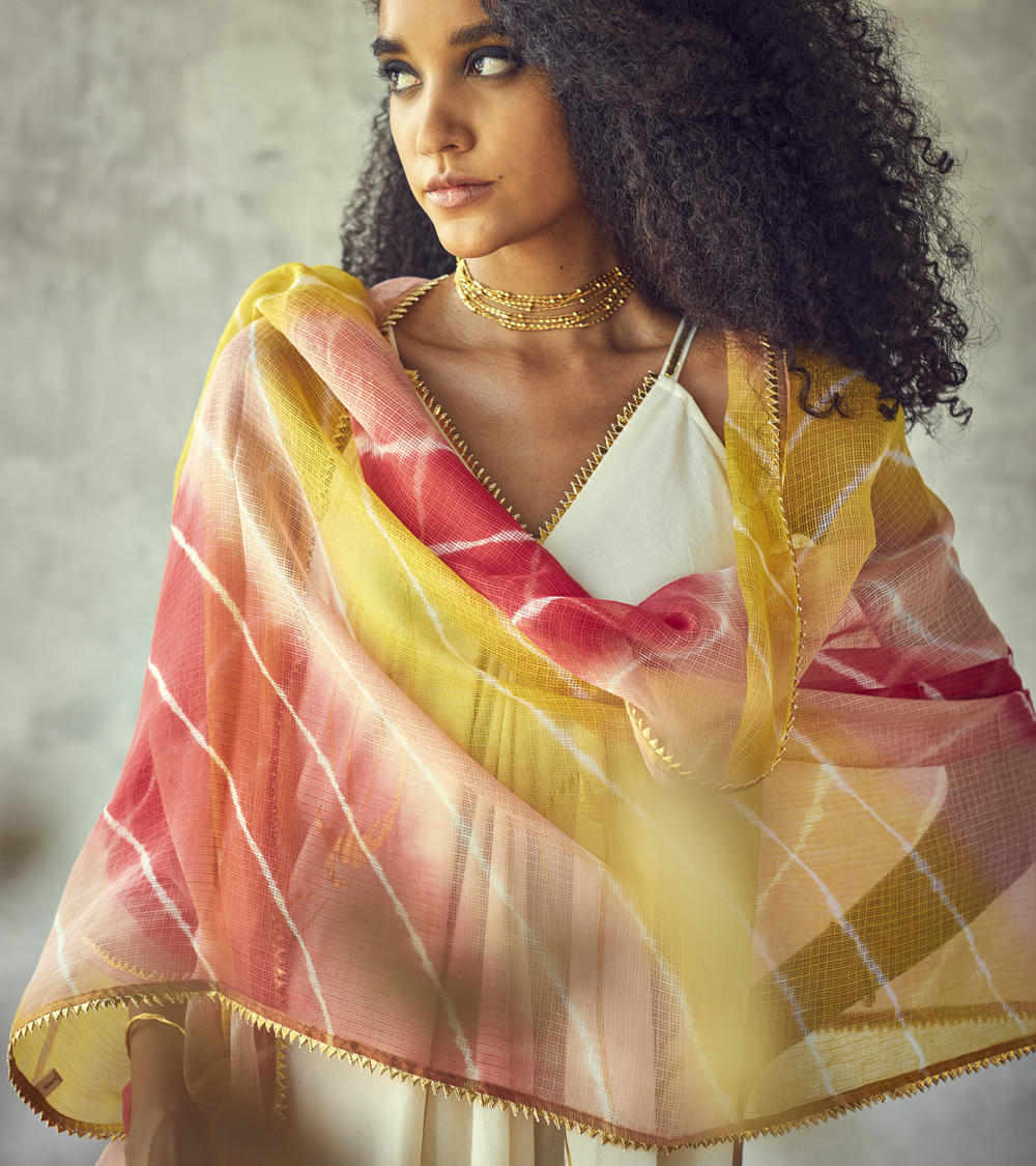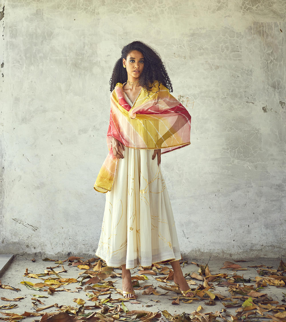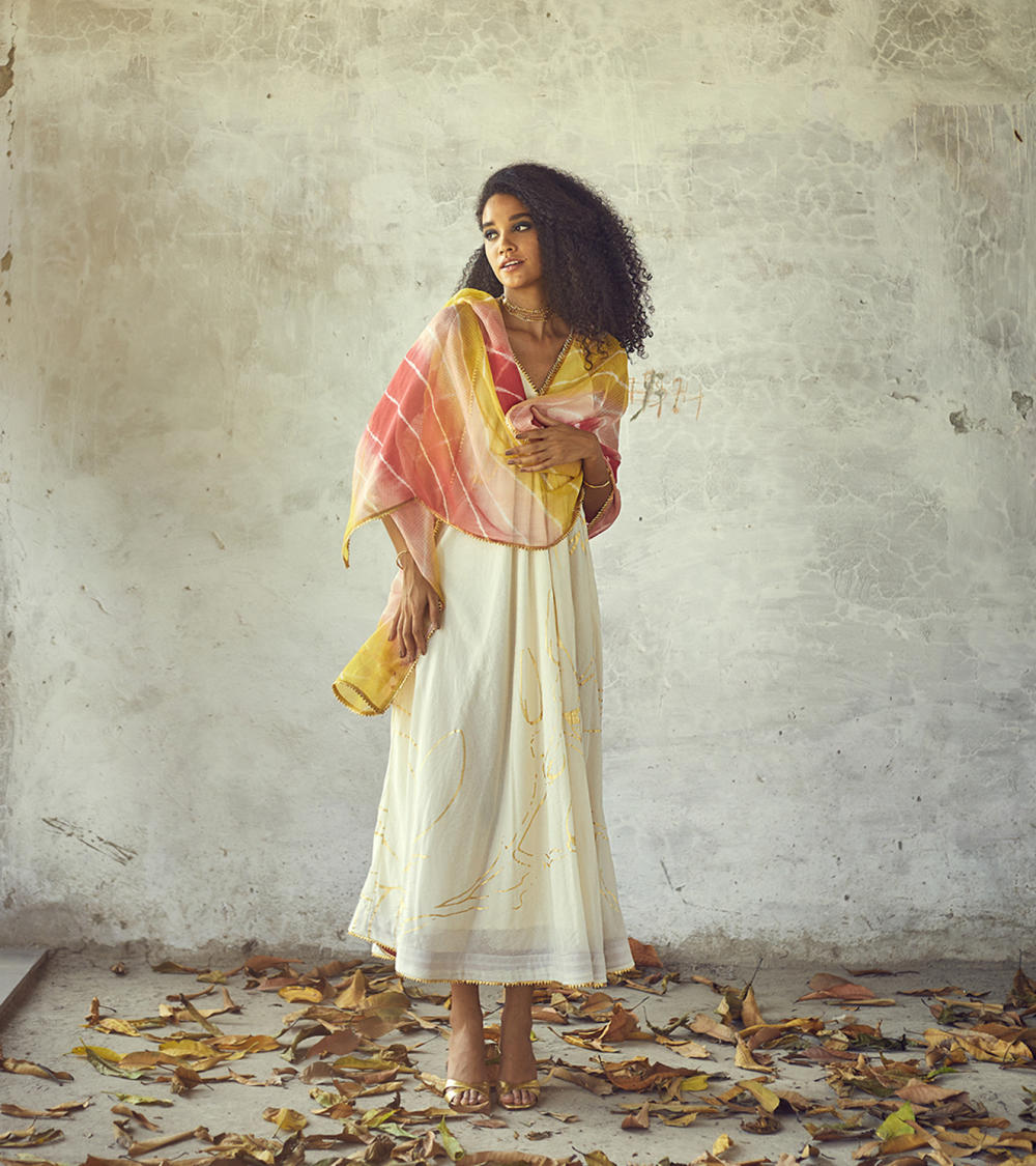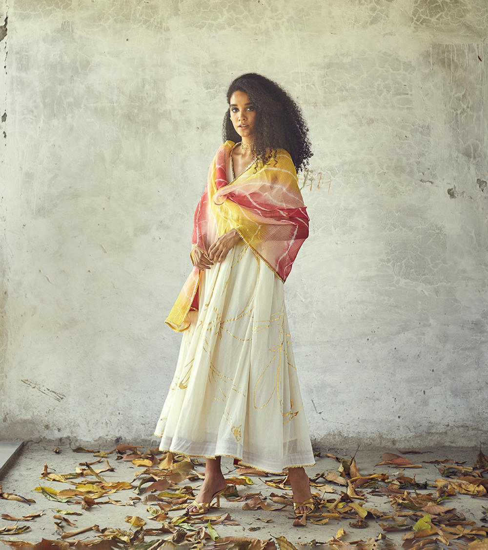 A festive staple sleeveless maxi gown with a V-neckline, overall gold foil floral print and delicate gota details. A peek -a- boo hemline finishing adds to the fun festive vibe. Paired with our Rangeela lehriya Dupatta. We have styled it with our gold chocker.