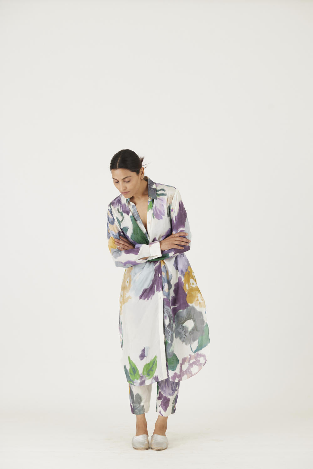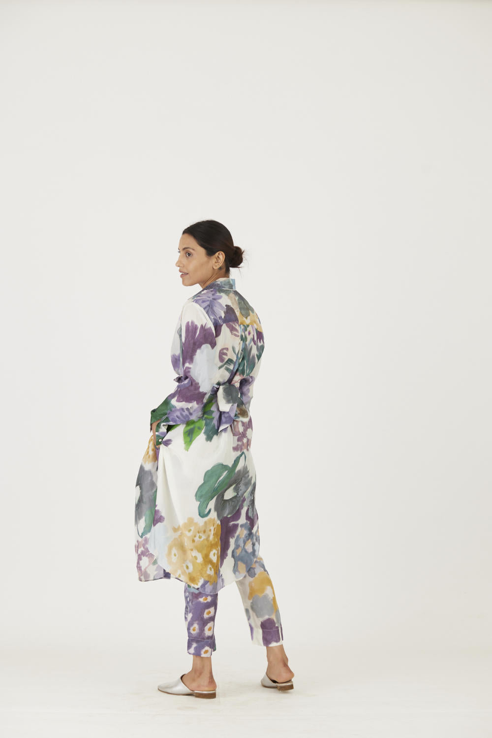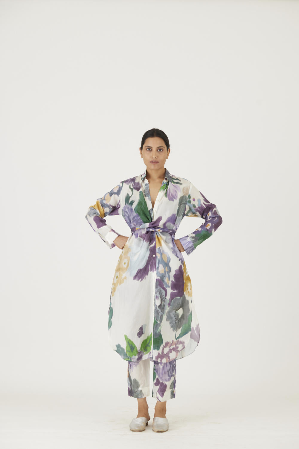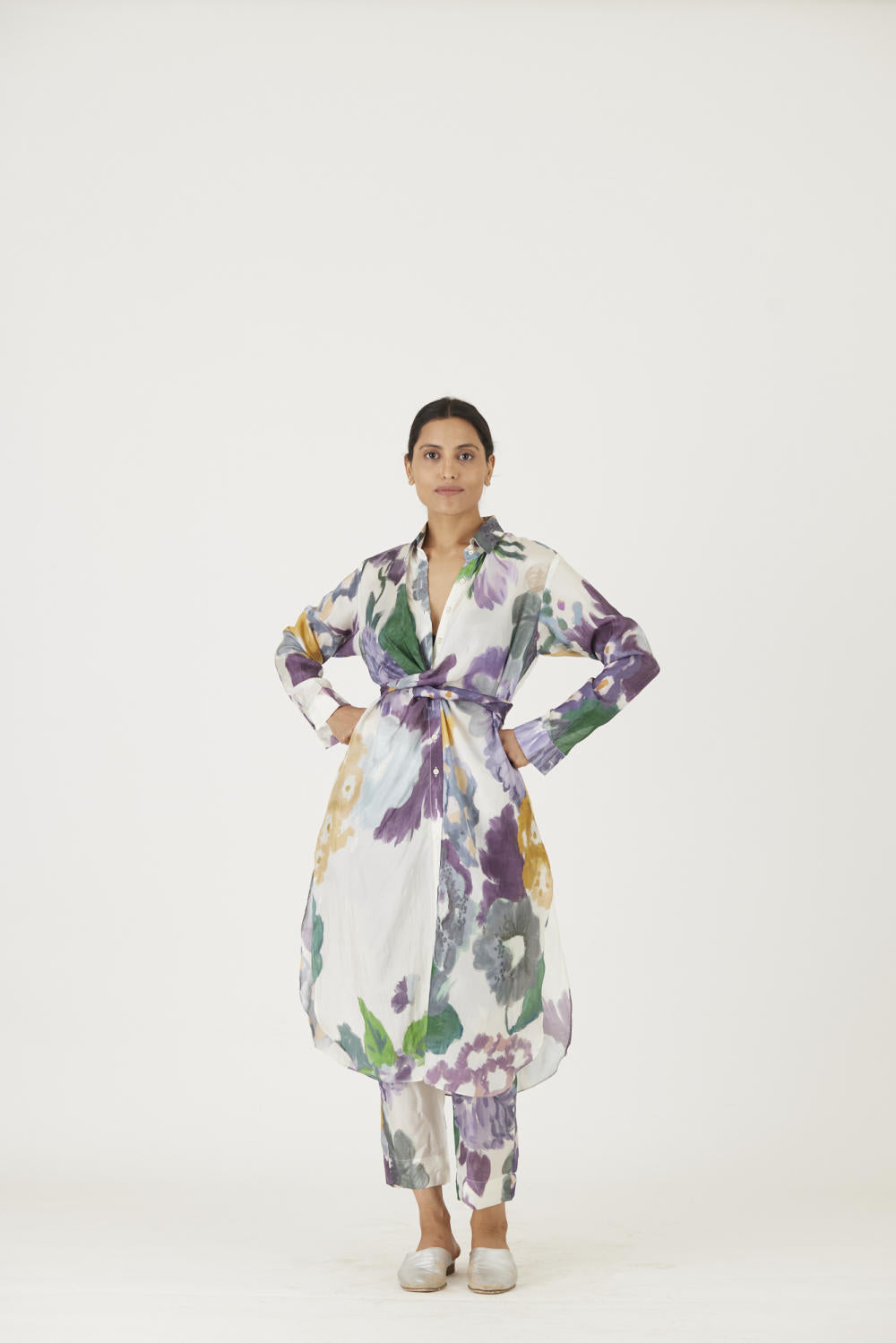 The print features an abundance of roses along with marigolds and jasmines arranged together in a bouquet on summer white base with florals in shades of blue. The set is crafted in the Farah print carefully printed on pure silk. The set includes a wrap shirt kurta and pants with drawstring front and back elastic.