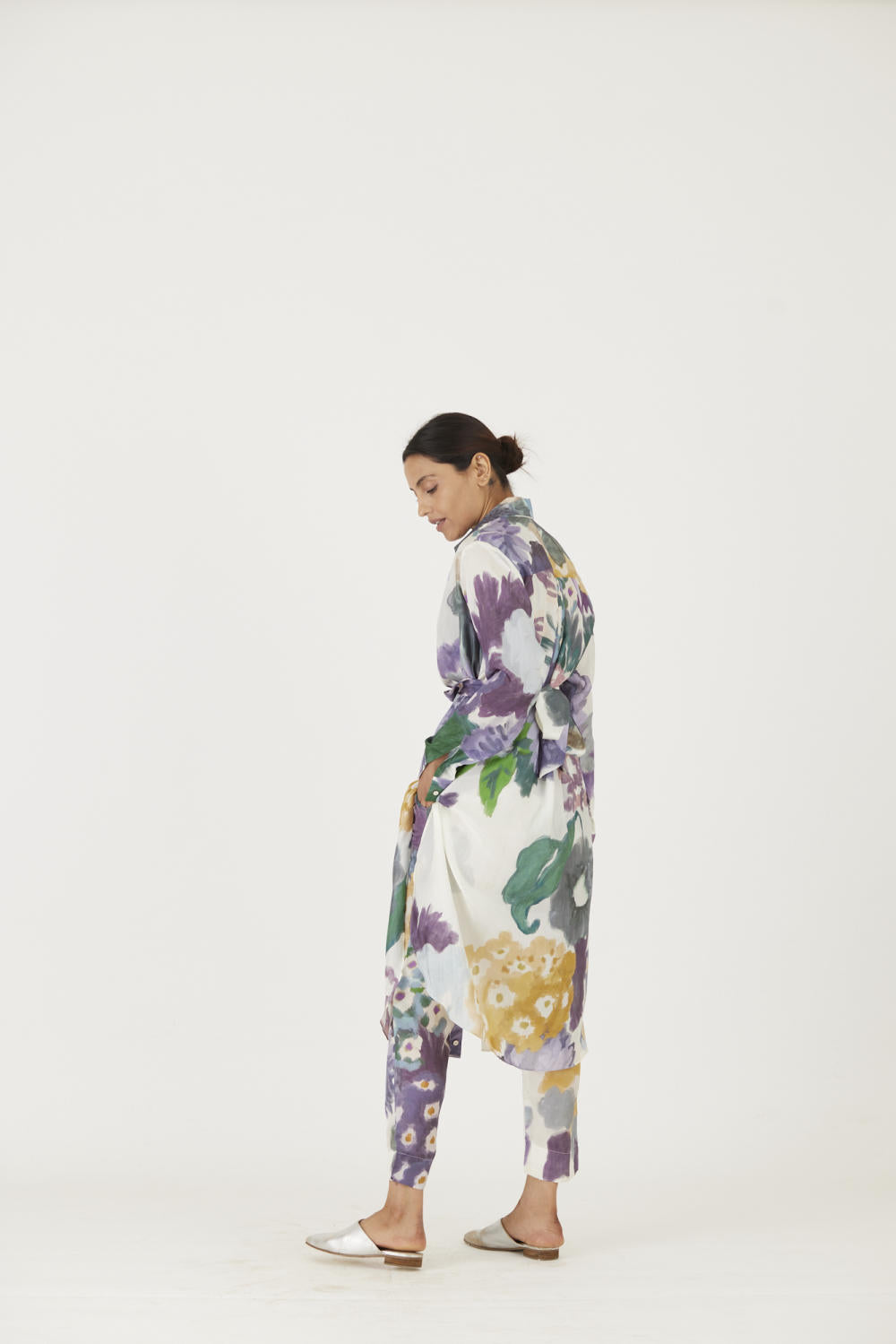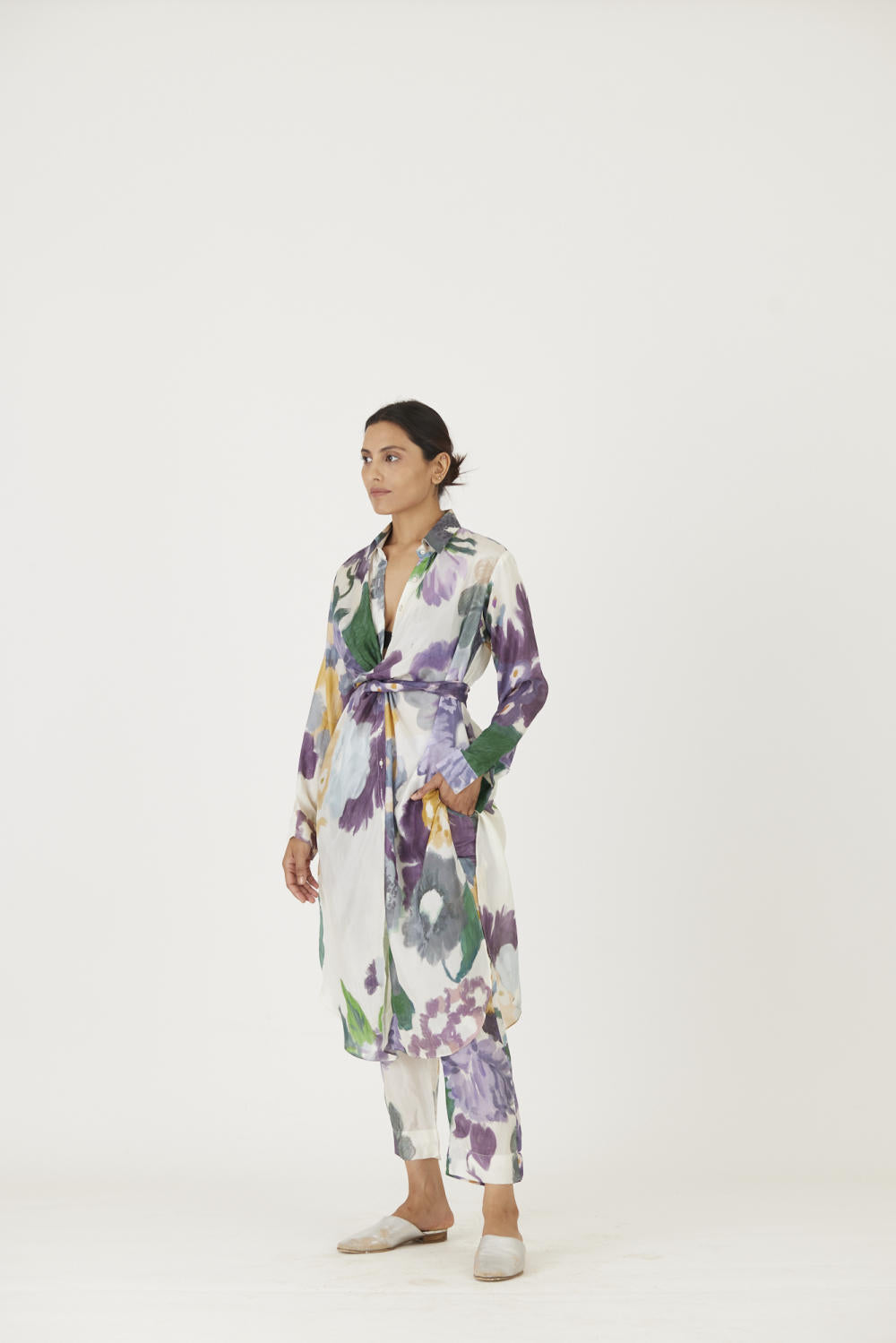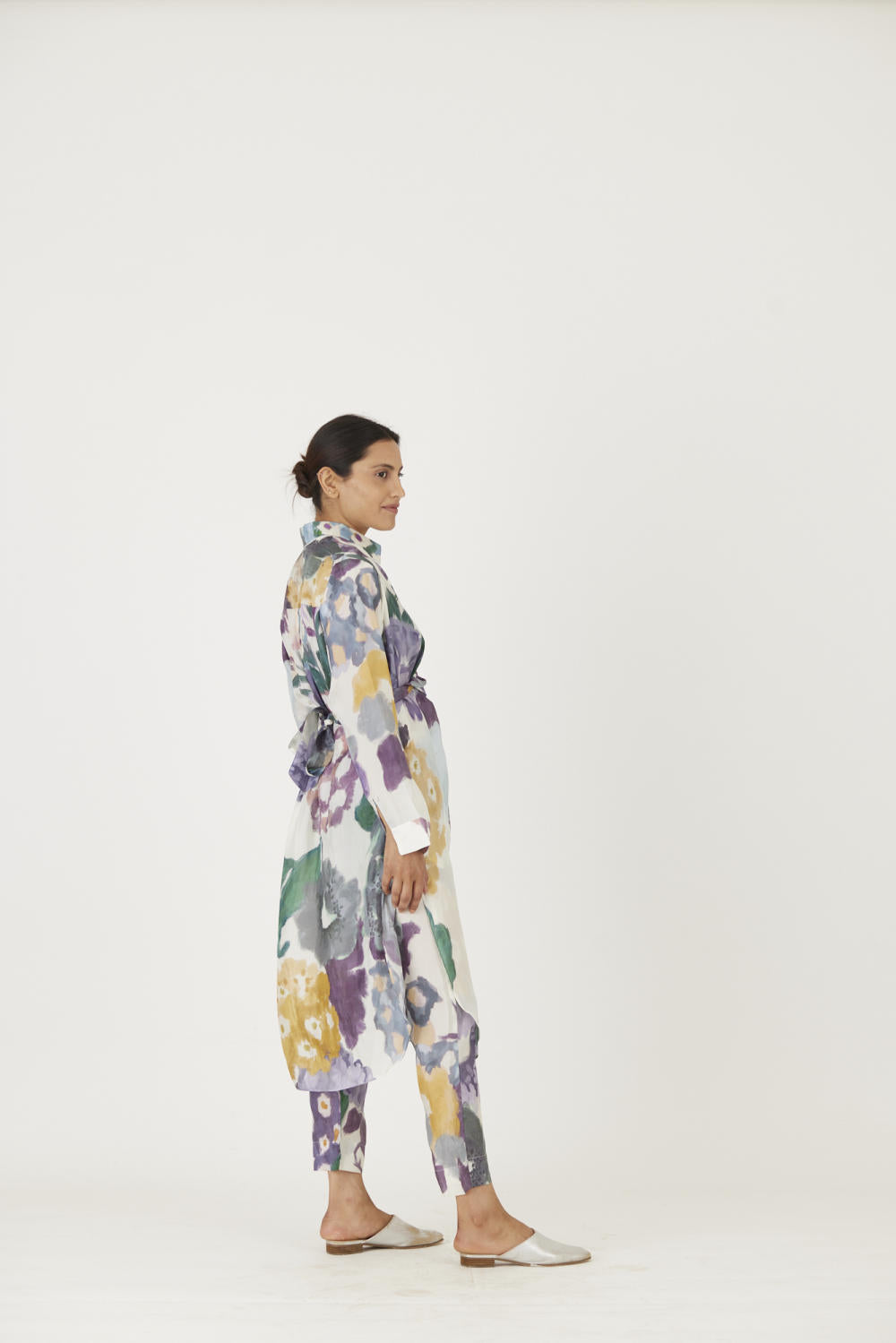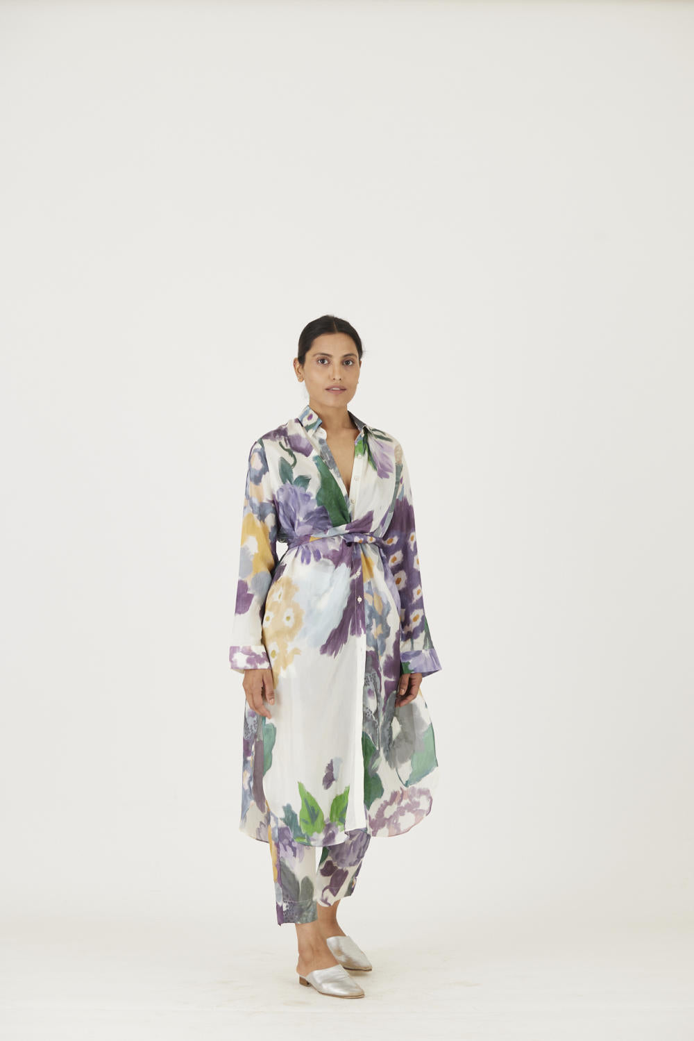 The print features an abundance of roses along with marigolds and jasmines arranged together in a bouquet on summer white base with florals in shades of blue. The set is crafted in the Farah print carefully printed on pure silk. The set includes a wrap shirt kurta and pants with drawstring front and back elastic.