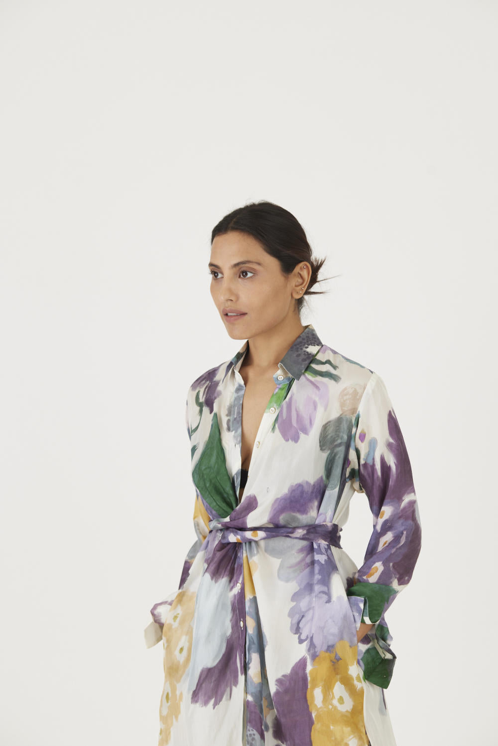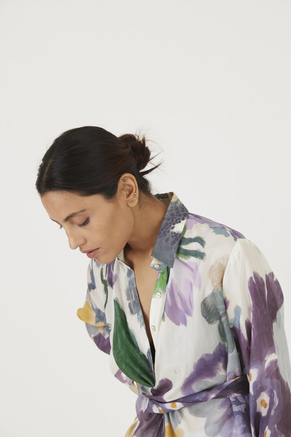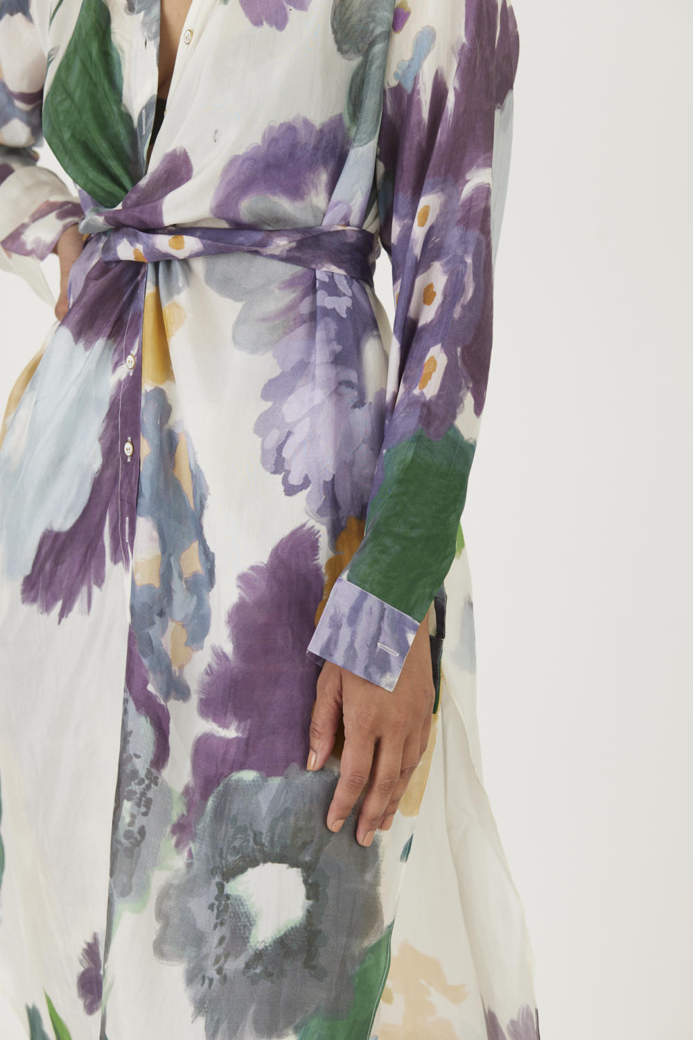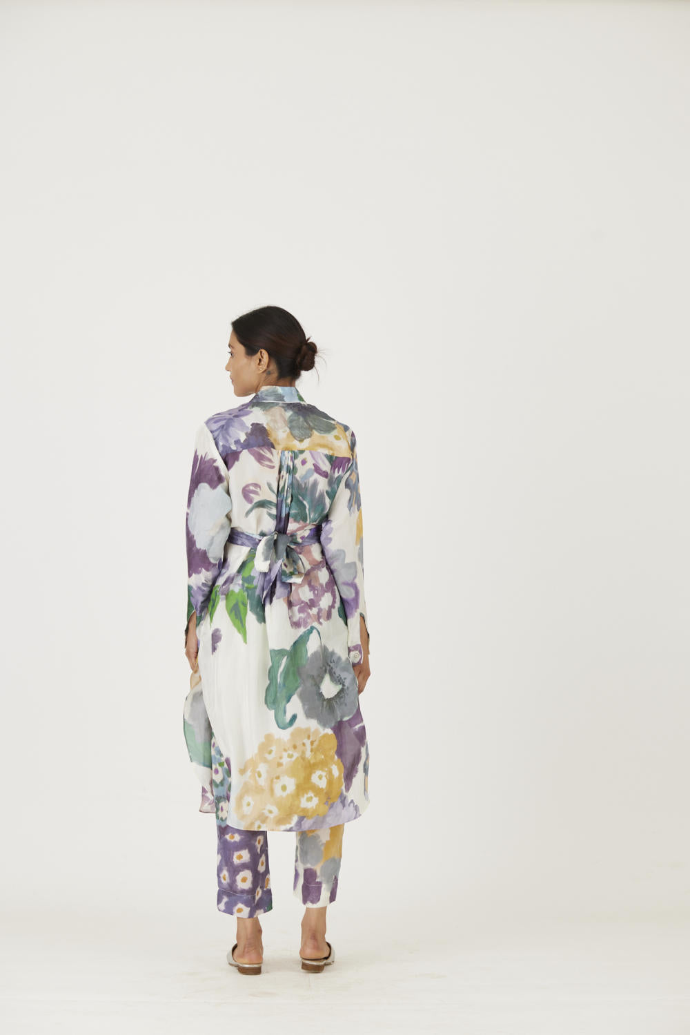 The print features an abundance of roses along with marigolds and jasmines arranged together in a bouquet on summer white base with florals in shades of blue. The set is crafted in the Farah print carefully printed on pure silk. The set includes a wrap shirt kurta and pants with drawstring front and back elastic.