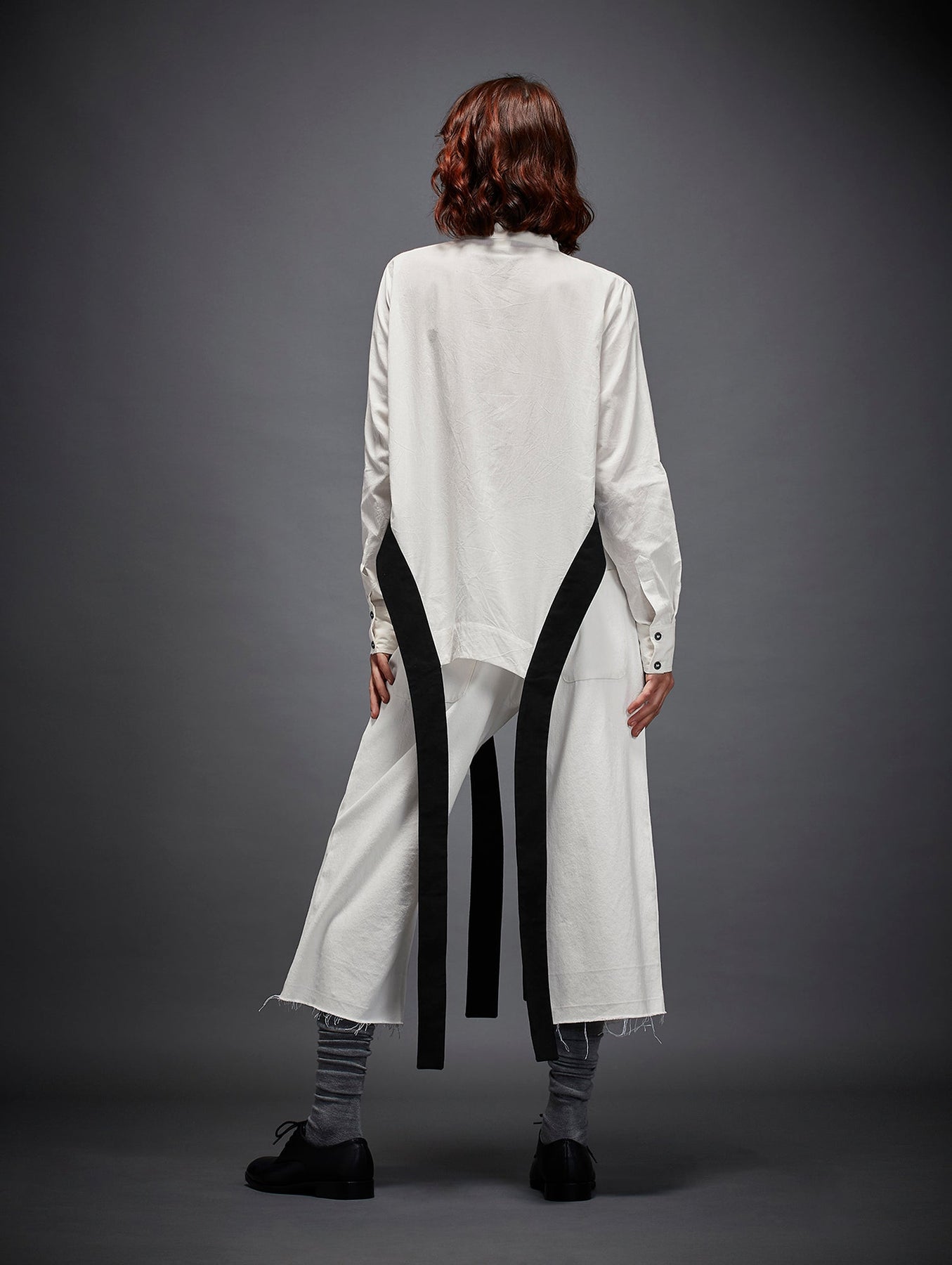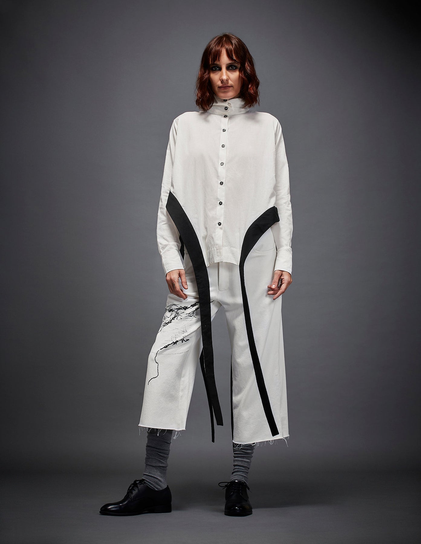 HIGH COLLAR SHIRT WITH UNEVEN BODY CUT SLITS, REGULAR FULL SLEEVES AND HANGING BELTS