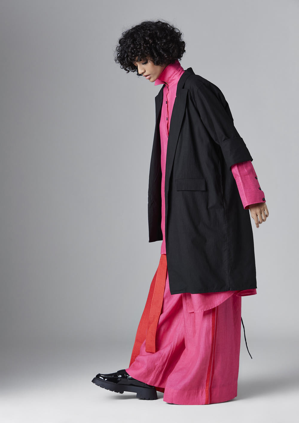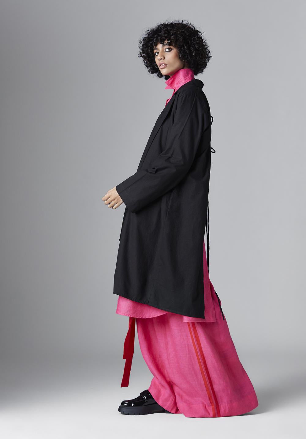 Chola’s universe begins with thoughtful materials. Recycled cottons, post-consumer fabrics, and free-cutting techniques come together in a kind of mindful choreography—one that honours form without creating waste, and prioritises movement over rigidity. This is clothing that feels lived-in yet architectural; pared-back yet quietly avant-garde.