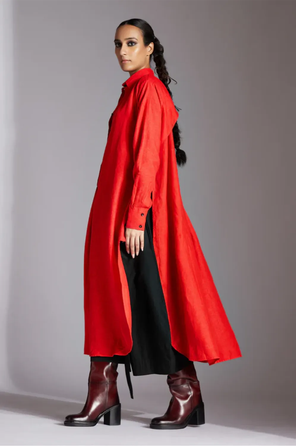 The Alin shirt features a shirt collar, half front button down placket with pleat, side extensions with buttons, curved back flap and narrow full sleeves.