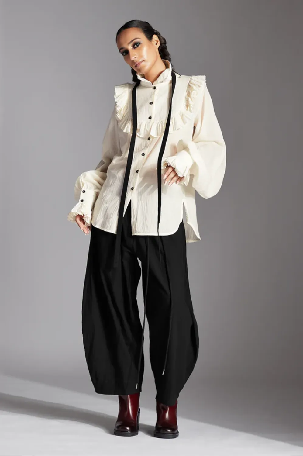 The Amri Shirt has a high collar with detachable black tie, bishop sleeves, ruffles on the front and back yoke and front button down placket. Additionally, it features a half button down placket at the back.