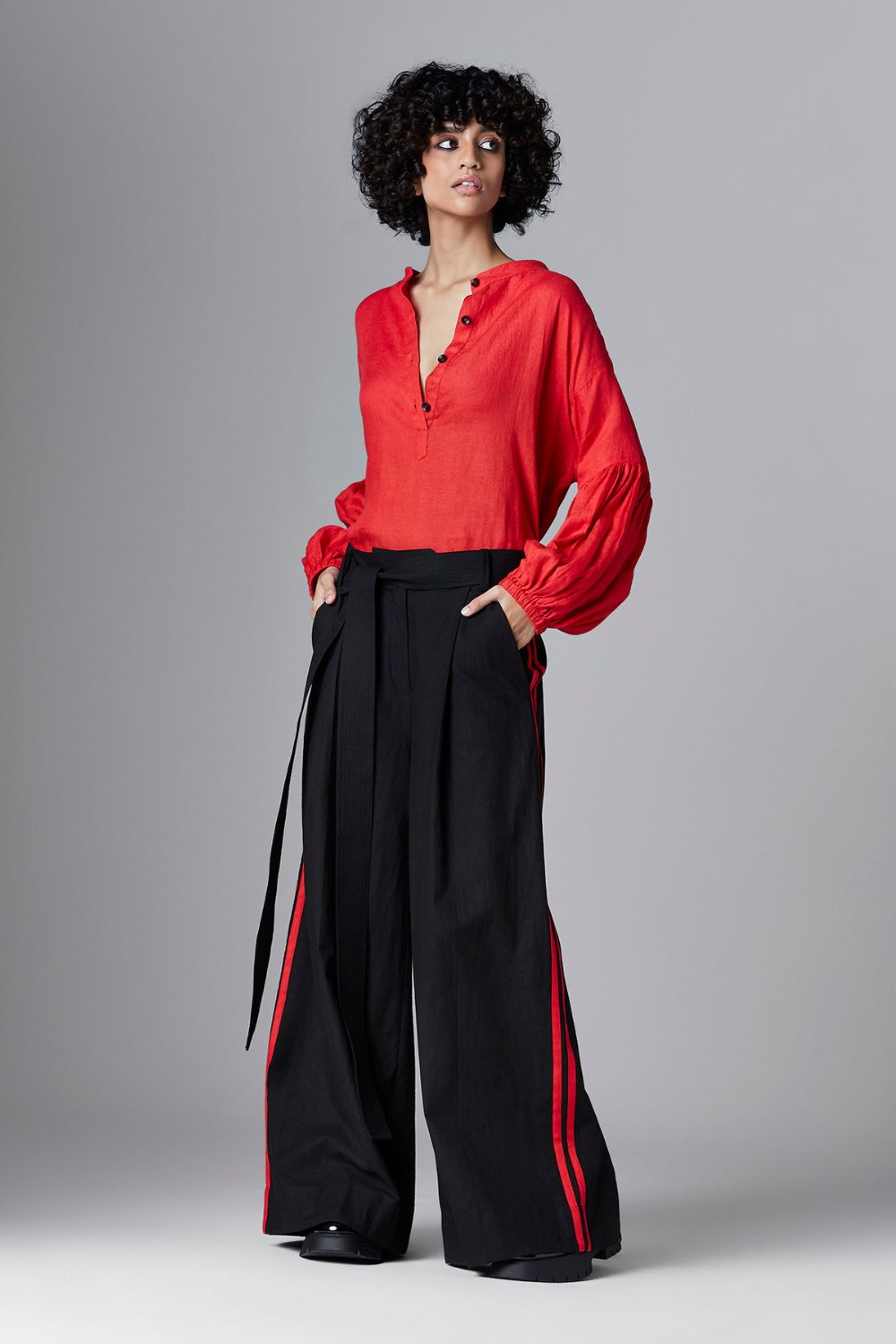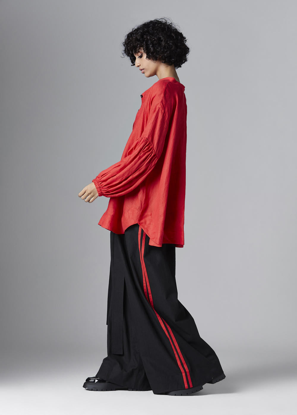 Chola’s universe begins with thoughtful materials. Recycled cottons, post-consumer fabrics, and free-cutting techniques come together in a kind of mindful choreography—one that honours form without creating waste, and prioritises movement over rigidity. This is clothing that feels lived-in yet architectural; pared-back yet quietly avant-garde.