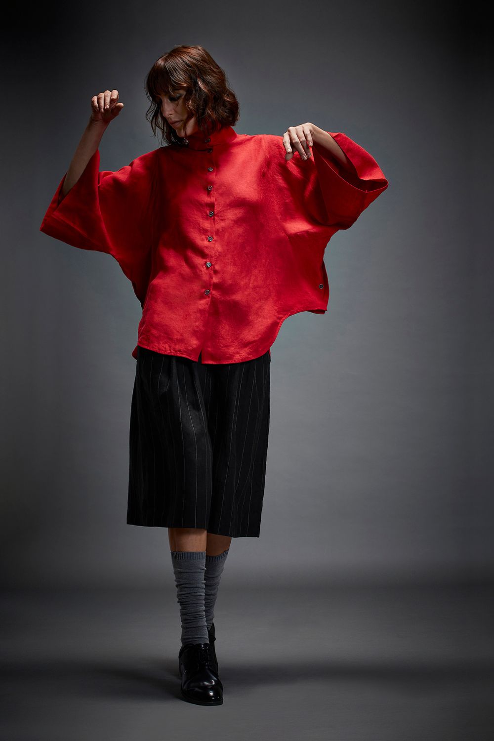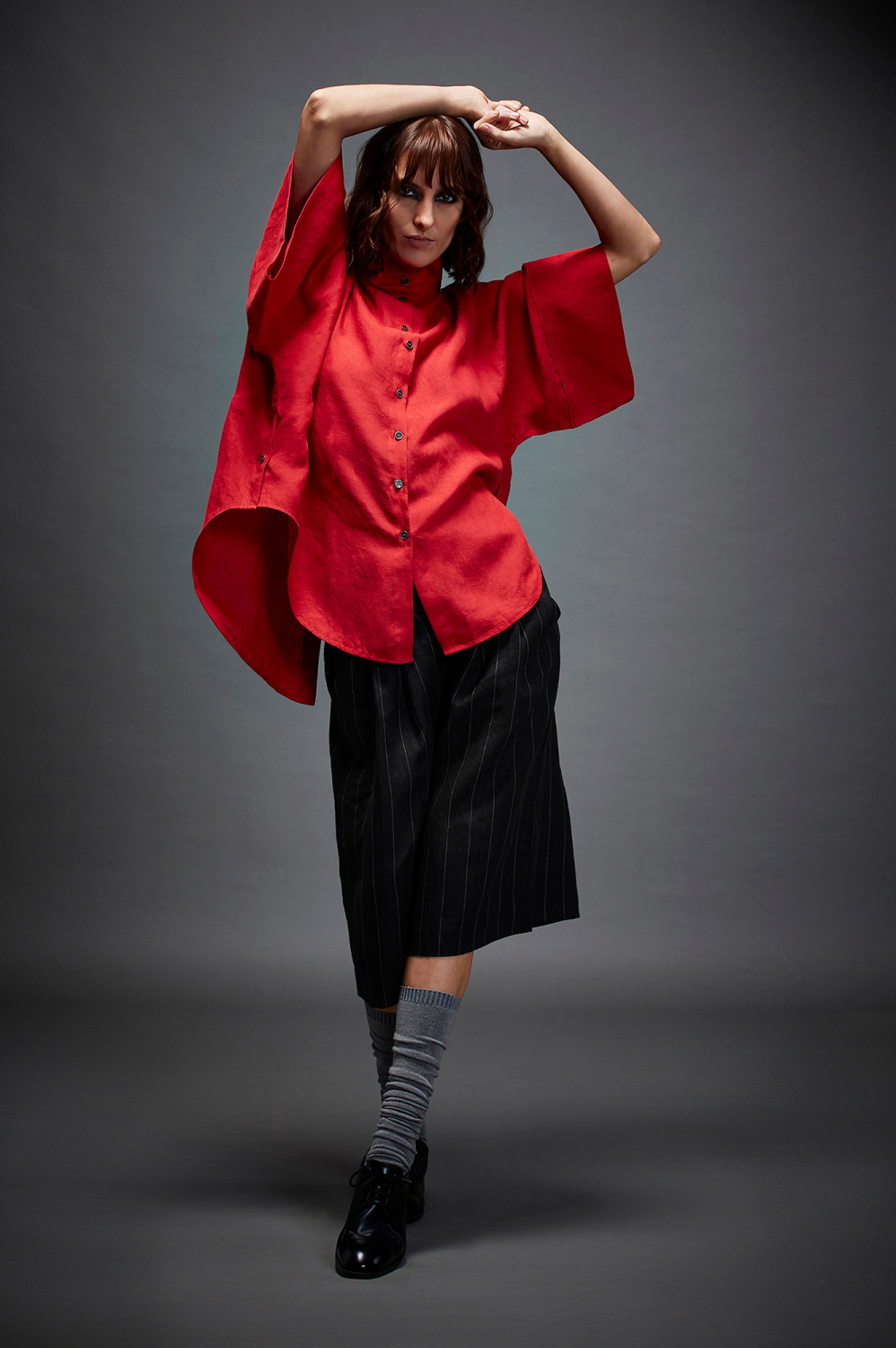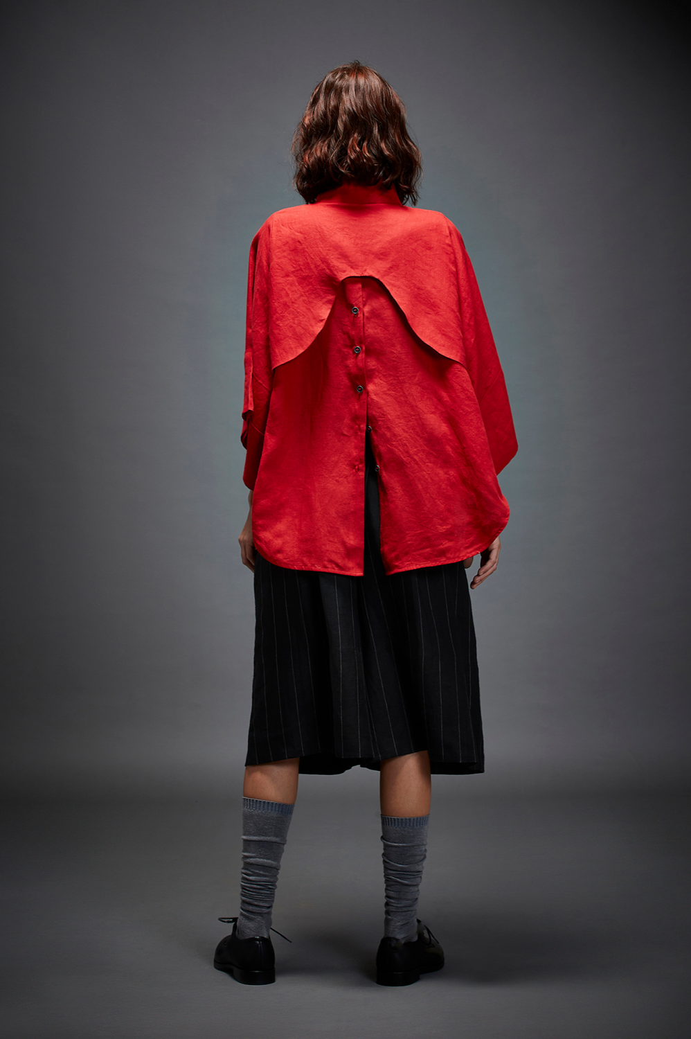 U SHIRT WITH HIGH COLLAR, EXAGGERATED BOX SLEEVE, PIPING AT SLEEVES, SIDE BUTTON DETAILS AND U BACK FLAP