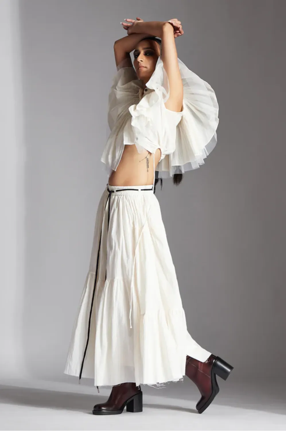 Ori is an asymmetric frill crop shirt with shirt collar, tulle fril details and drawstring at the hem