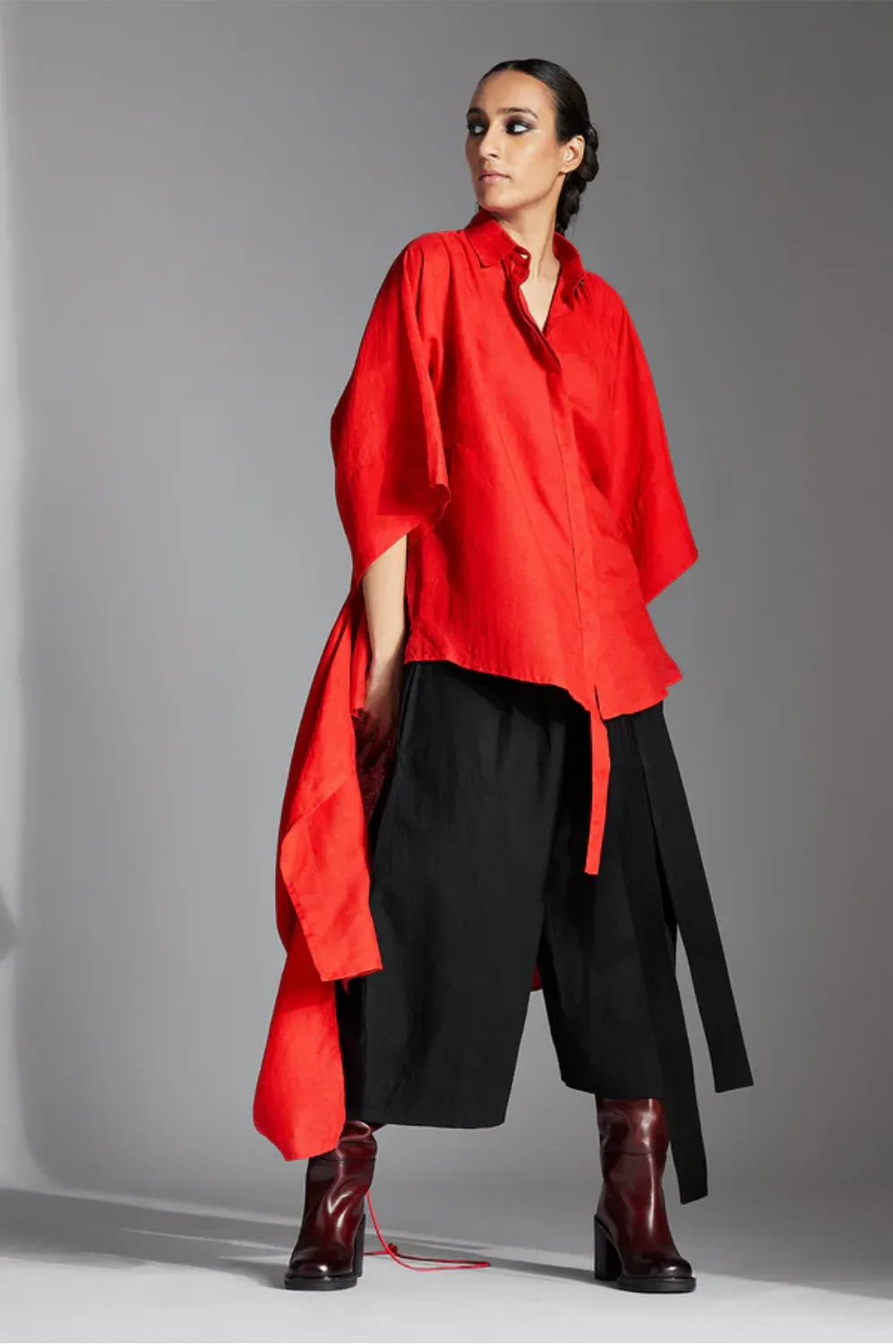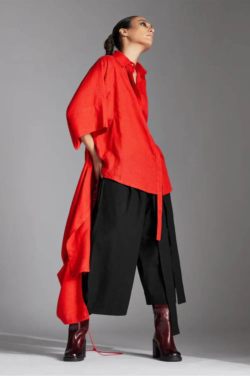 The Orien shirt features a shirt collar, insible extended button placket on the front, box sleeves and a hanging panel with drawstring at the back.
