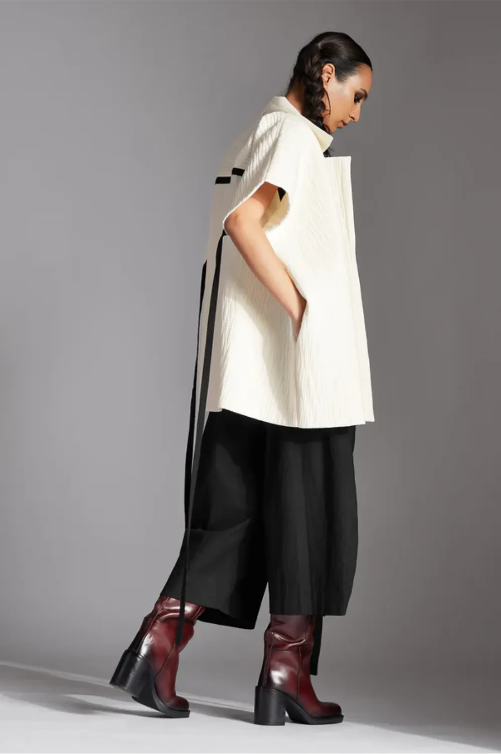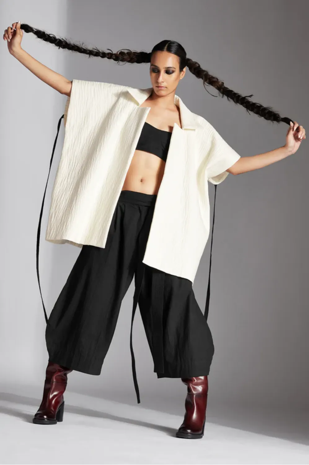 Chola’s universe begins with thoughtful materials. Recycled cottons, post-consumer fabrics, and free-cutting techniques come together in a kind of mindful choreography—one that honours form without creating waste, and prioritises movement over rigidity. This is clothing that feels lived-in yet architectural; pared-back yet quietly avant-garde.