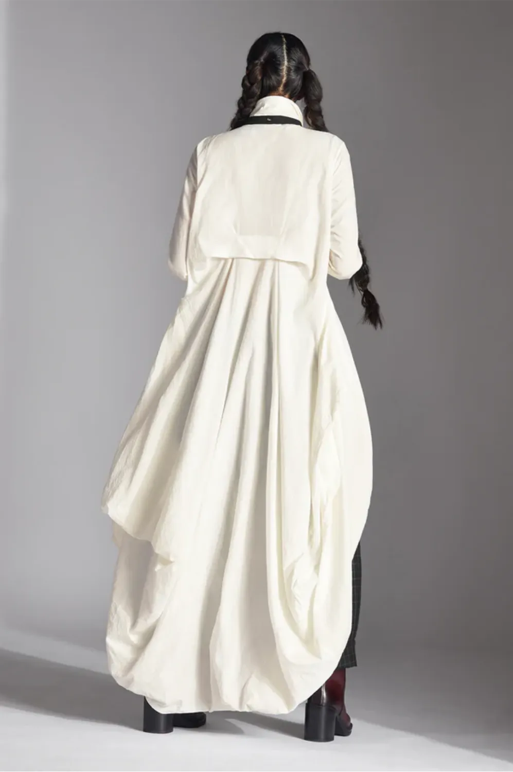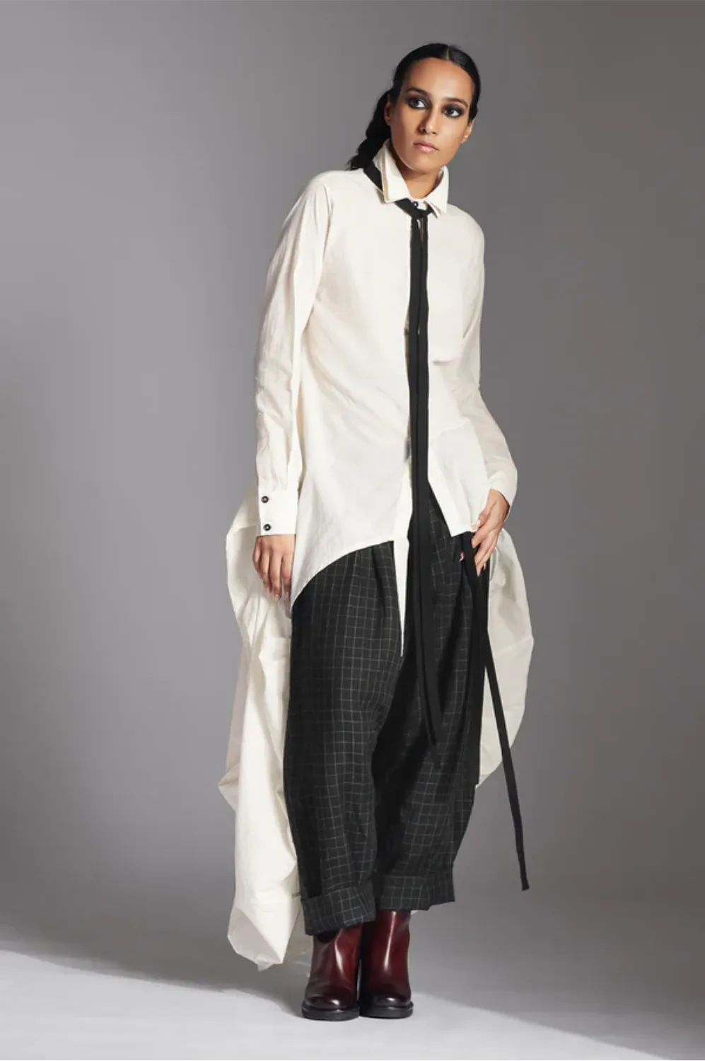 The Tane shirt features a double shirt collar, invisible extended front button placket, narrow full sleeves and fold at the back. Additionally, it features tucks at the hem.