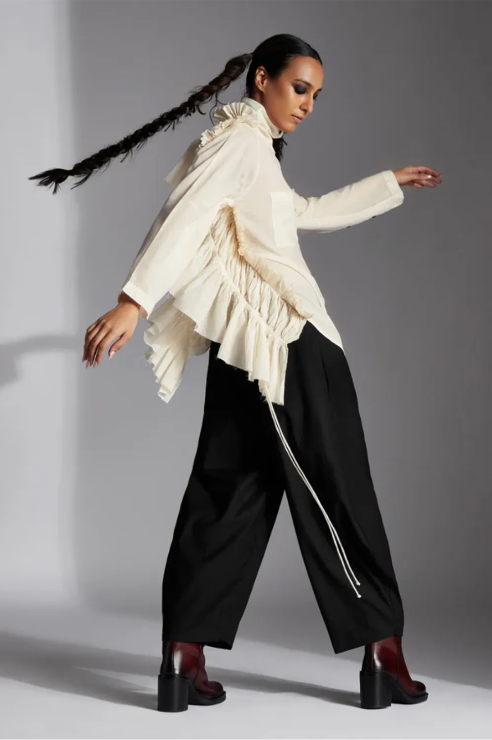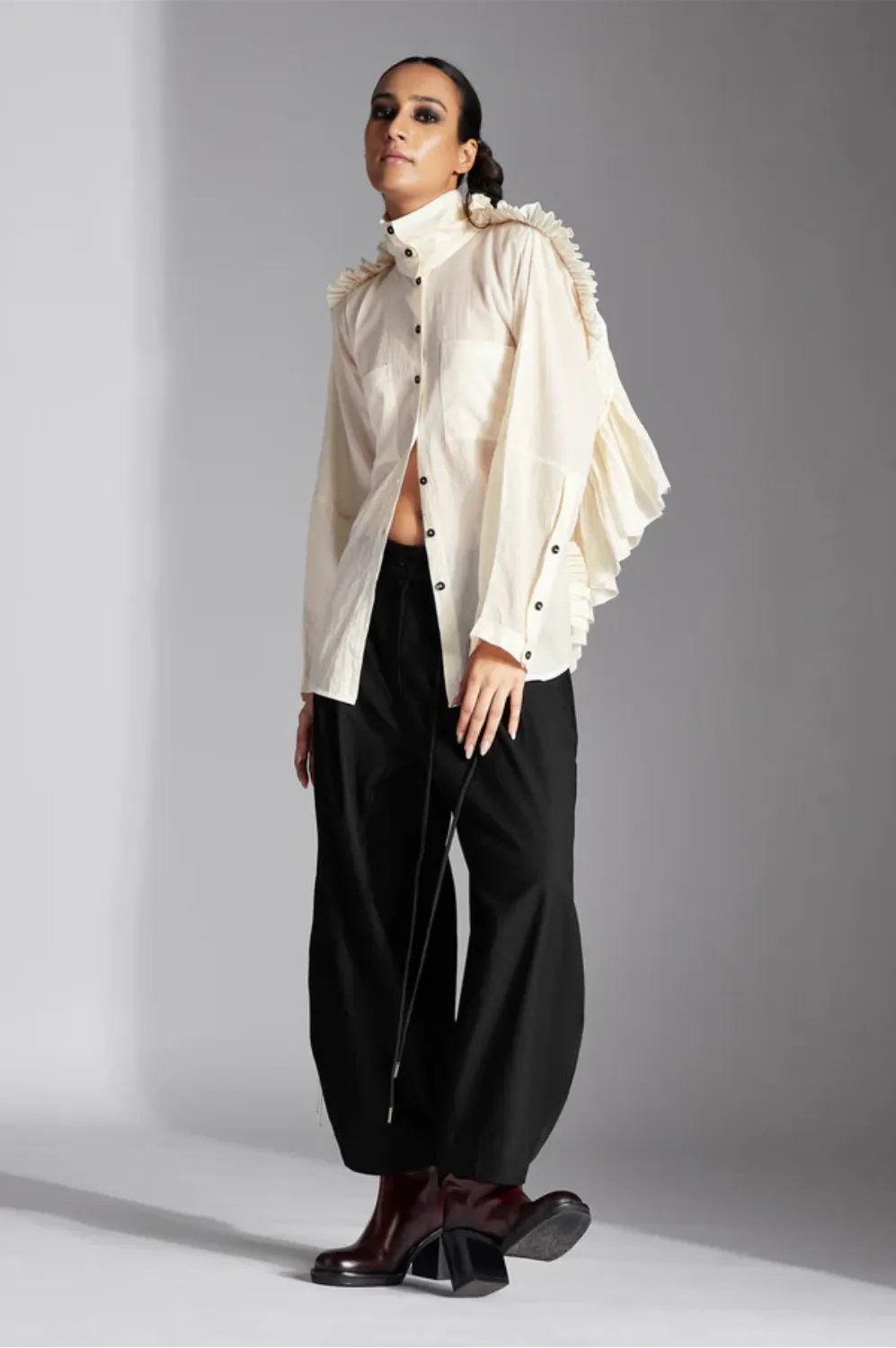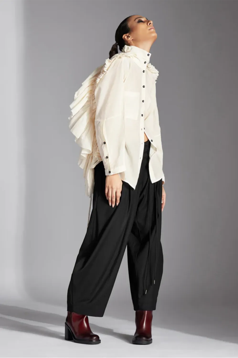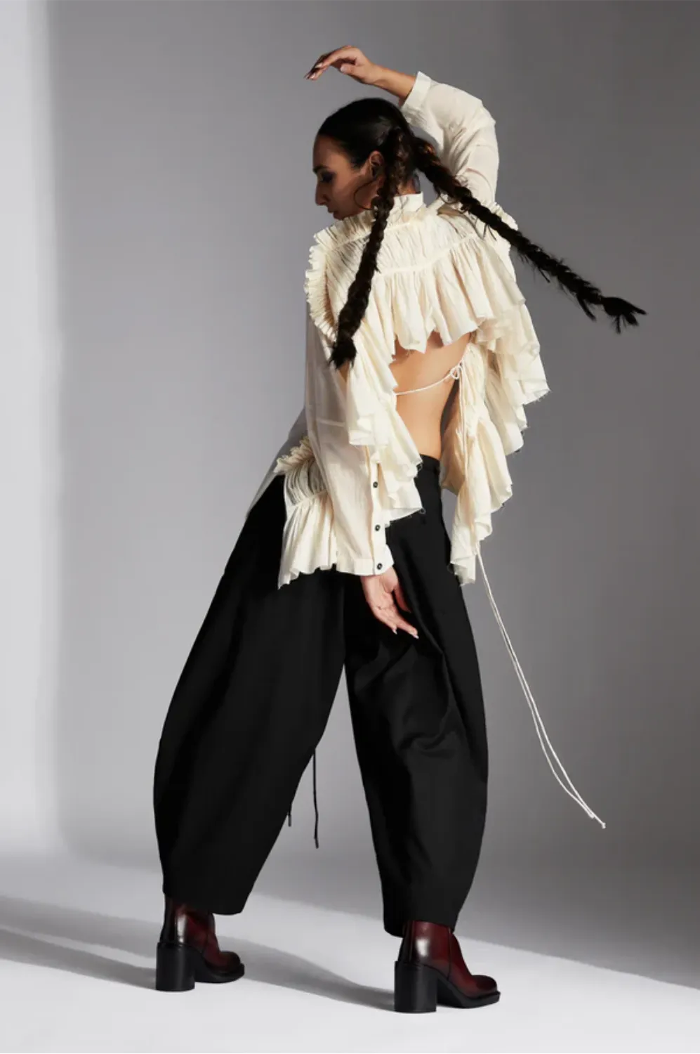 Tiran is a backless shirt with smocked frill detail, high collar, lantern full sleeves and back tie-up.