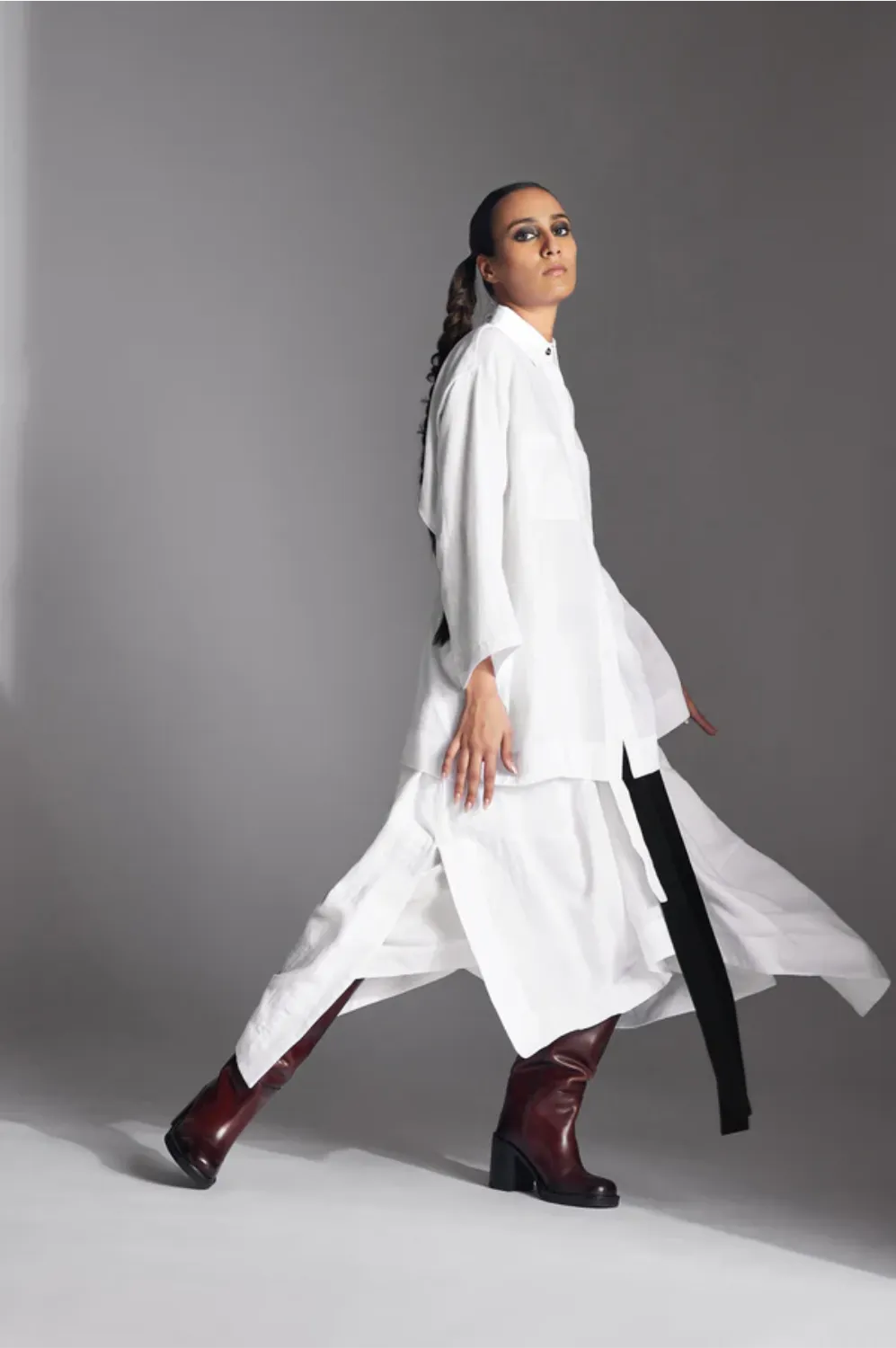 Chola’s universe begins with thoughtful materials. Recycled cottons, post-consumer fabrics, and free-cutting techniques come together in a kind of mindful choreography—one that honours form without creating waste, and prioritises movement over rigidity. This is clothing that feels lived-in yet architectural; pared-back yet quietly avant-garde.