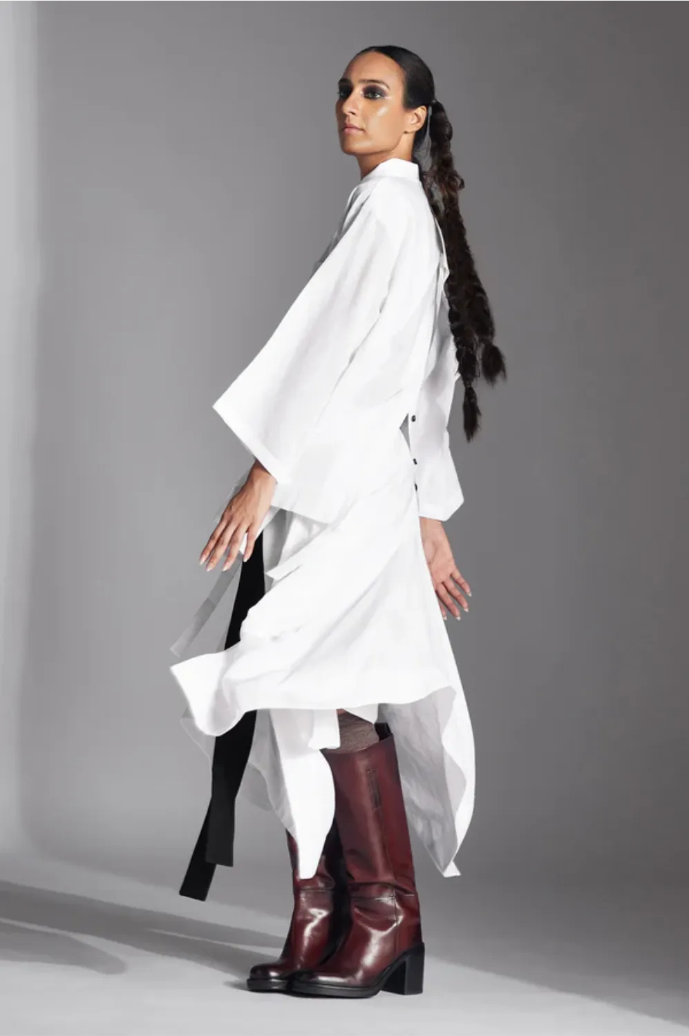 The Fira shirt has a barrel shaped silhouette with shirt collar, invisible button placket, curved back flap and a patch pocket on the front.
