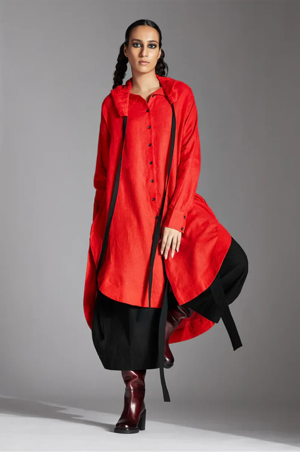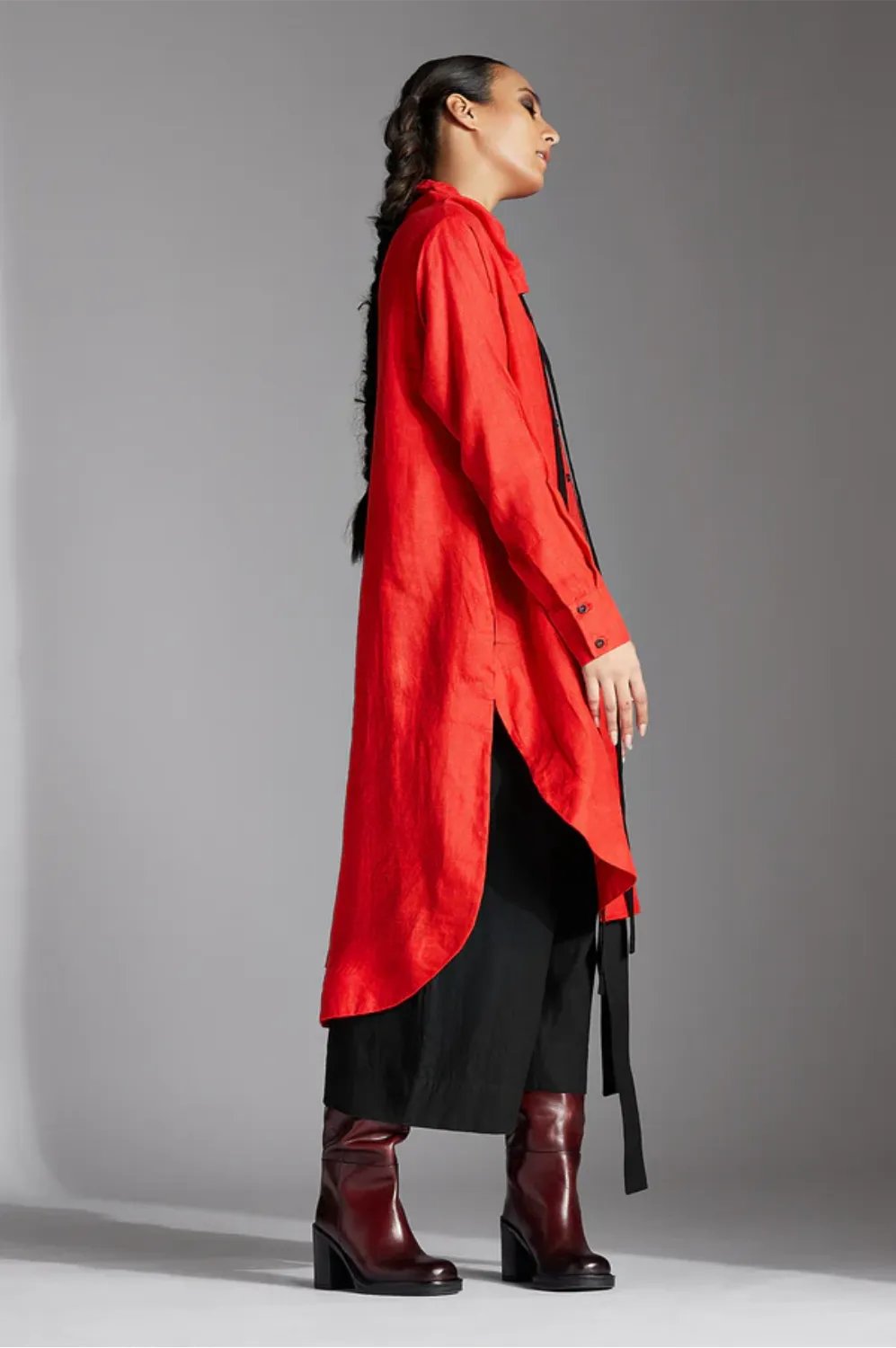 The Zale shirt exhibits a high-low style with extended high collar, narrow full sleeves and contrast back detail.