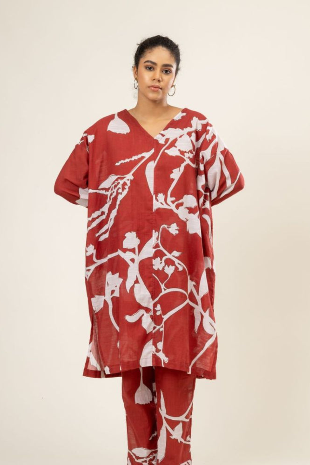 Description: Oversized Kaftan Tunic with slit at side and long sleeves. Printed Elasticated pants.