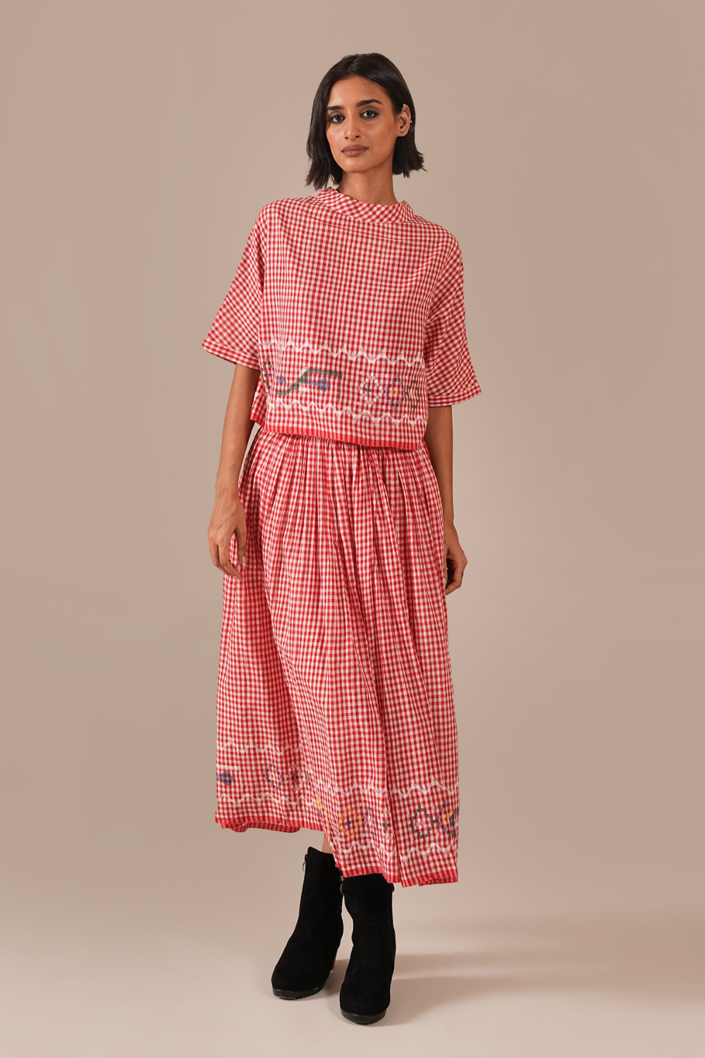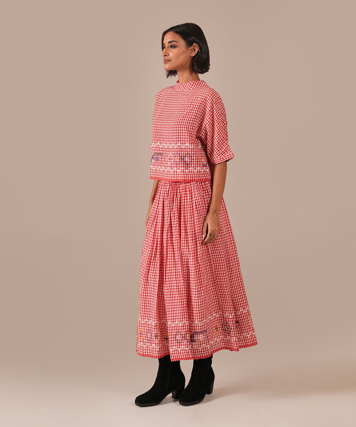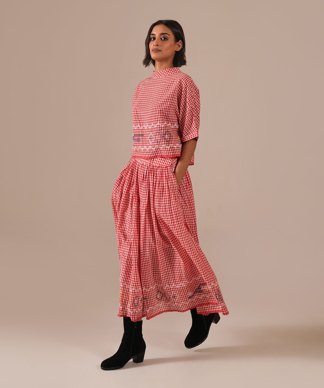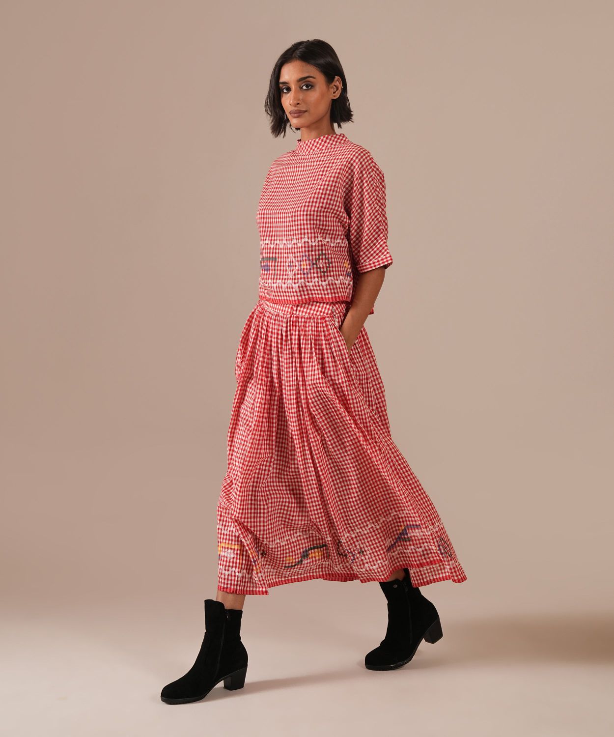A classic jamdani co-ord set featuring jamdani gathered skirt with side pockets and a boxy top is a perfect choice for your wardrobe.