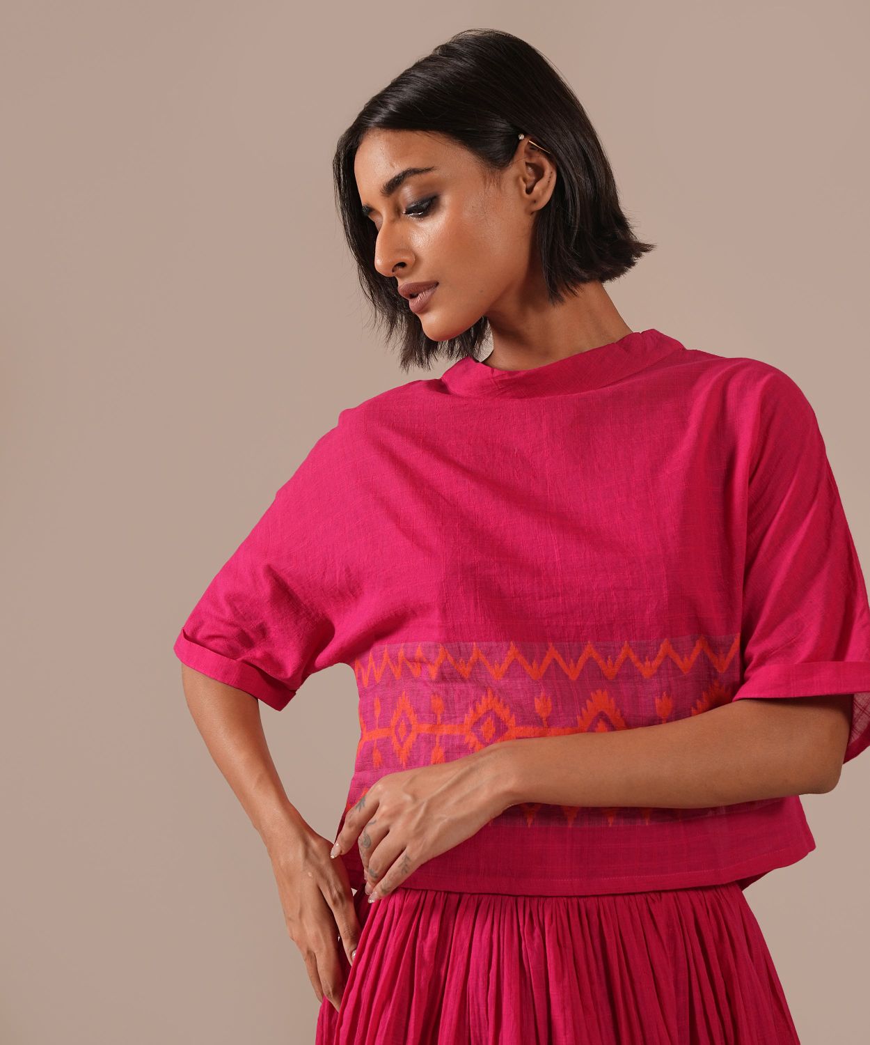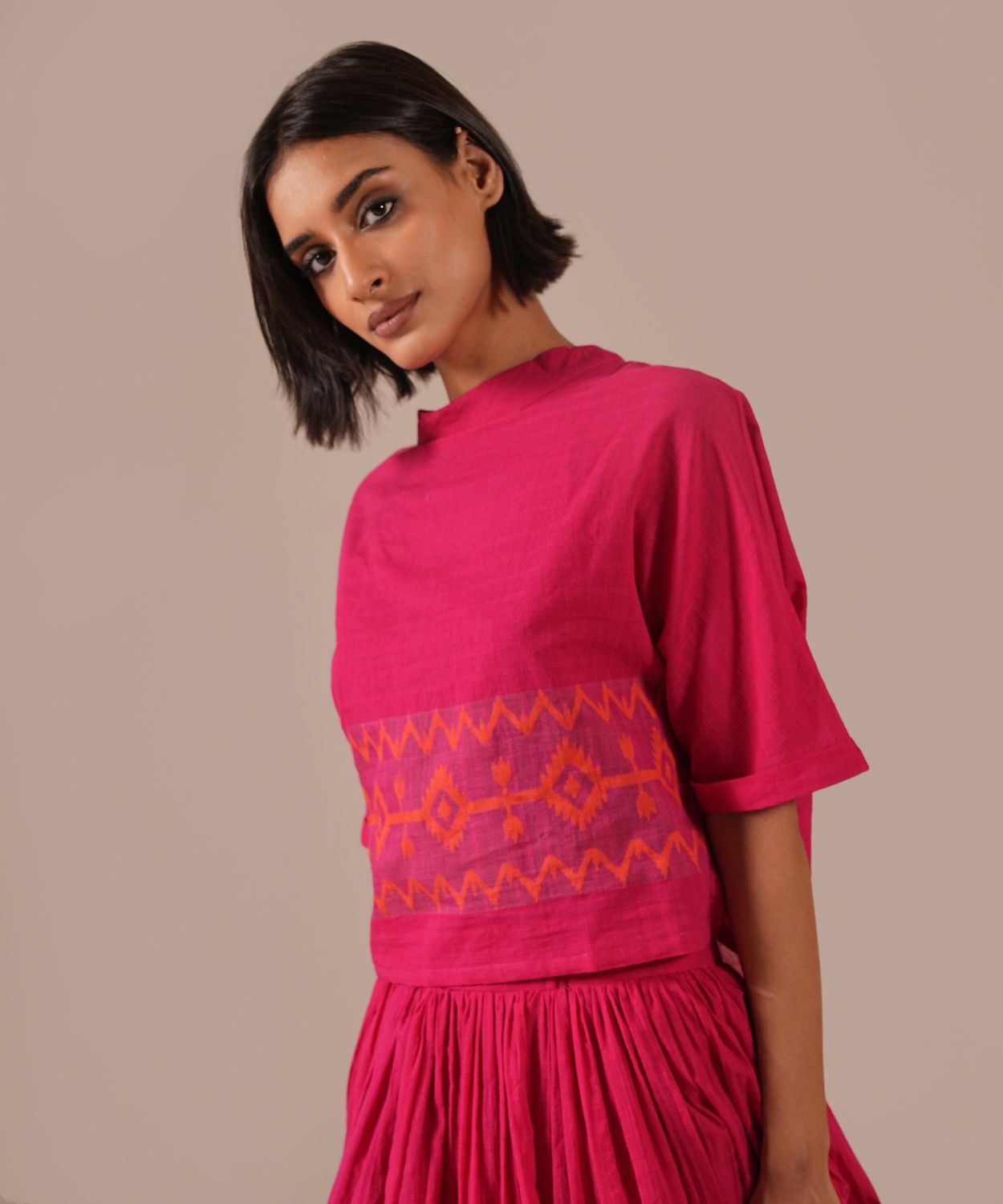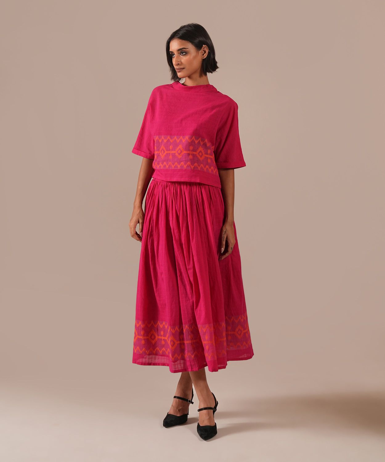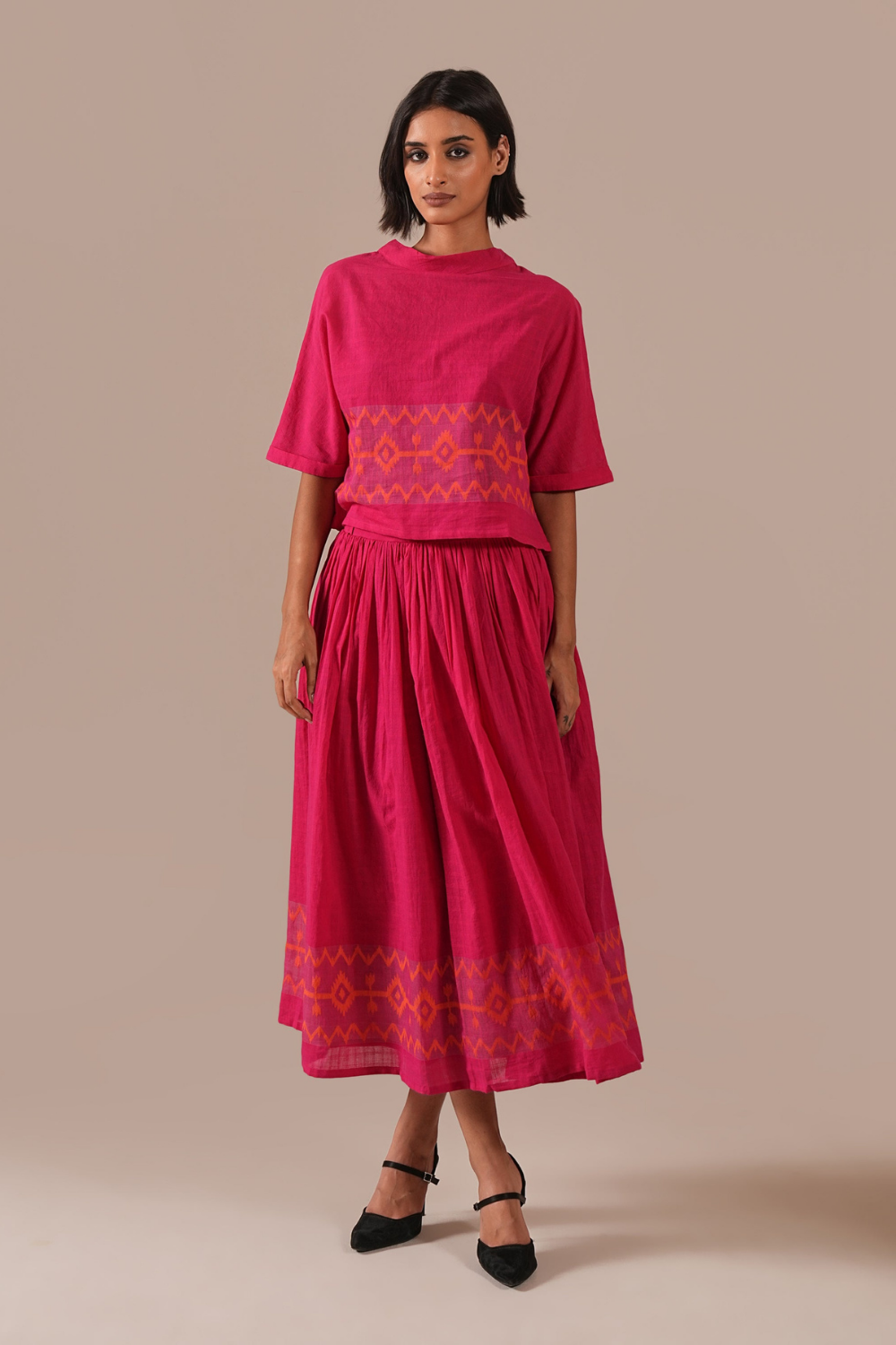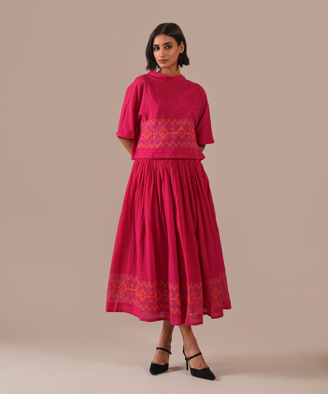 A classic jamdani co-ord set featuring jamdani gathered skirt with side pockets and a boxy top is a perfect choice for your wardrobe.