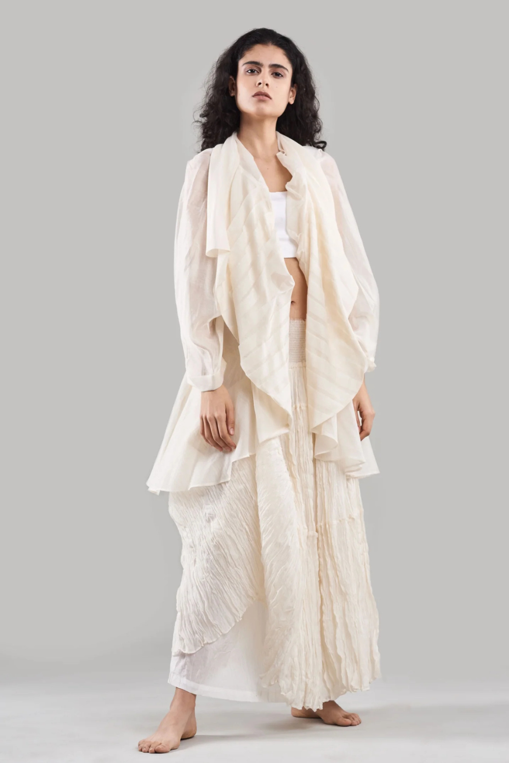 Crafted from lightweight crinkle chanderi silk and cotton, this festive set seamlessly blends versatility with elegance. The ensemble includes a fold-detail jacket and a uniquely designed ruffled skirt that effortlessly transforms into a chic tube dress for a standout look.
