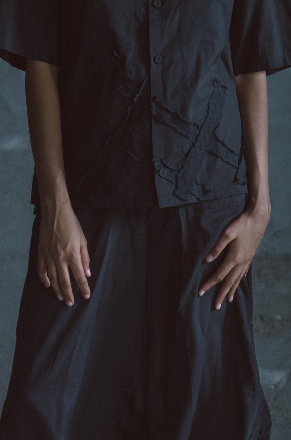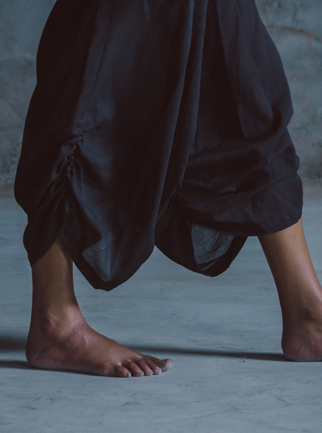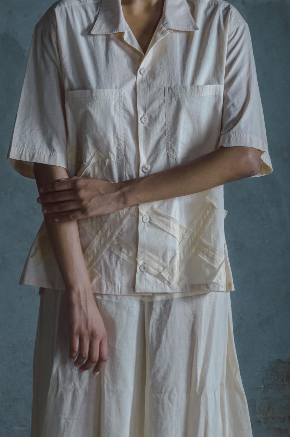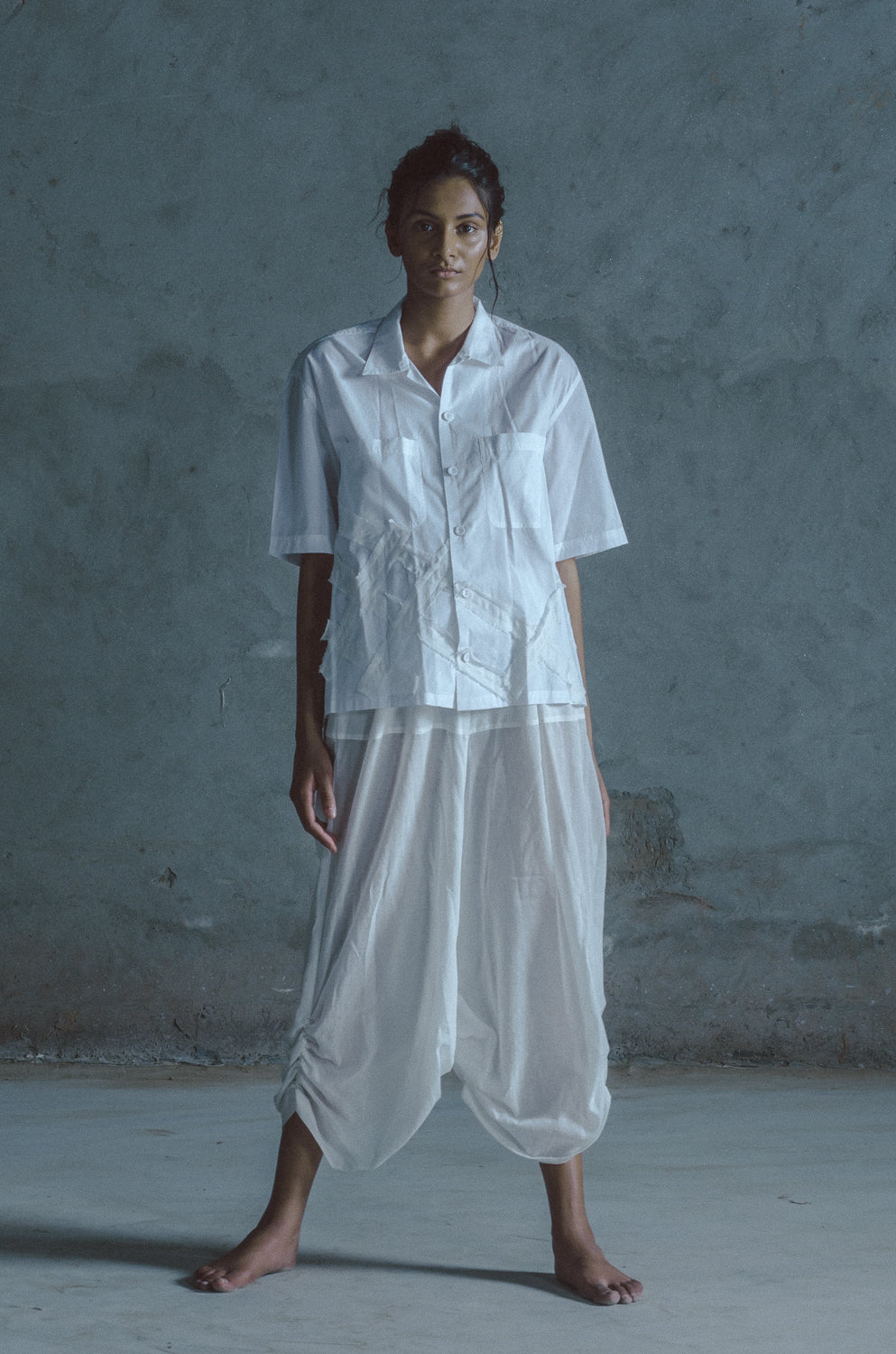 Crafted for relaxation, this effortlessly stylish set includes a shirt with appliqué detailing and semi-sheer dhoti pants, made from ultra-light cotton.