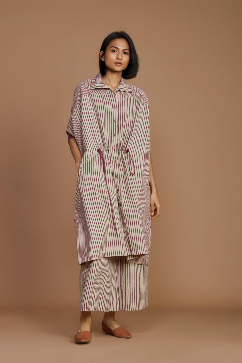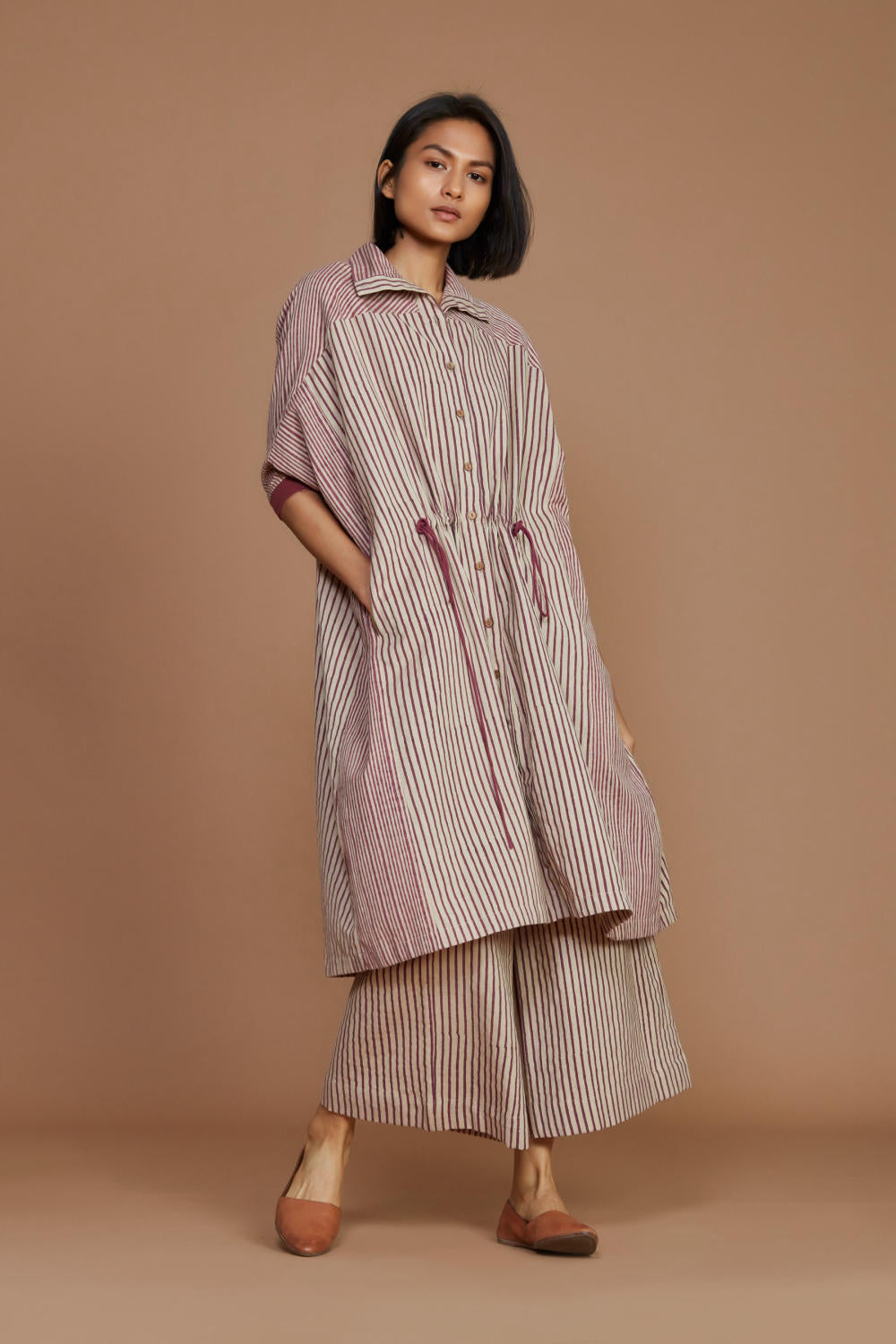 This smart set of High collar kaftan is a perfect bold yet comfortable look for your closet. It has an Easy fit with drawstrings at the waist gives a beautiful cinched look. A versatile set which can be styled separately.
