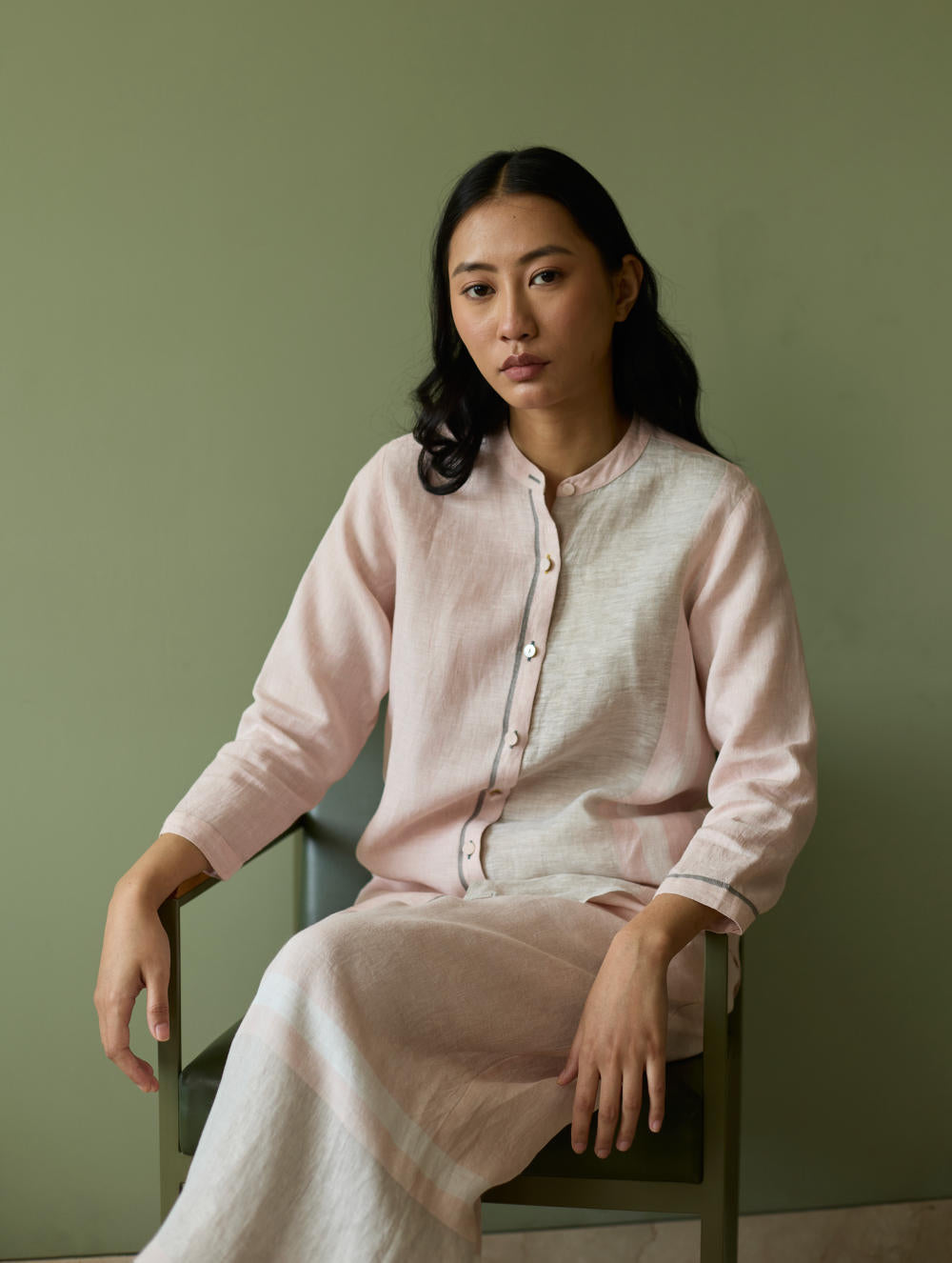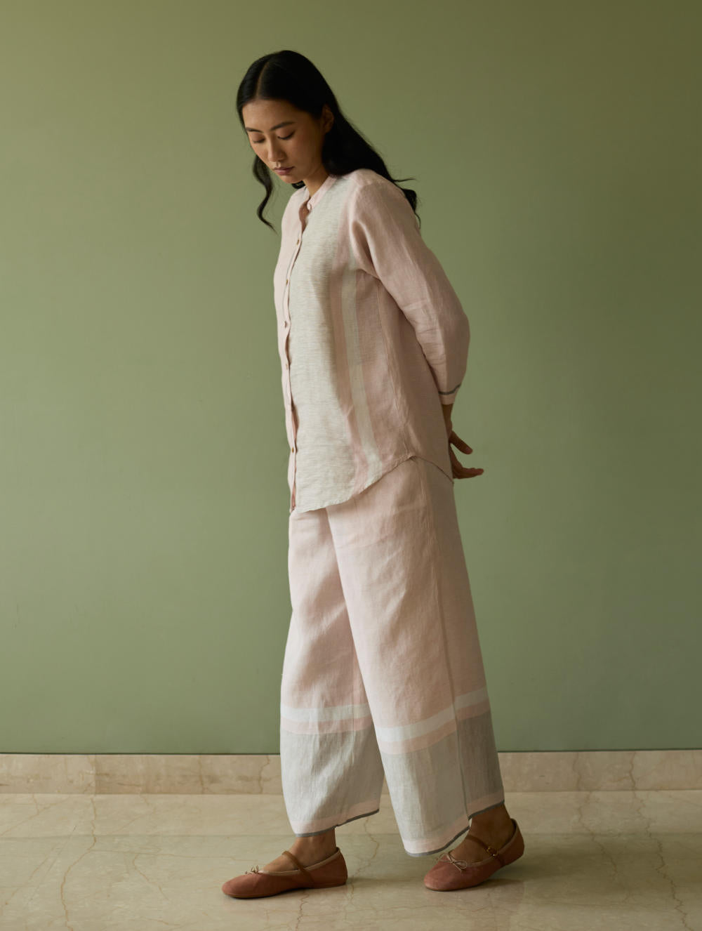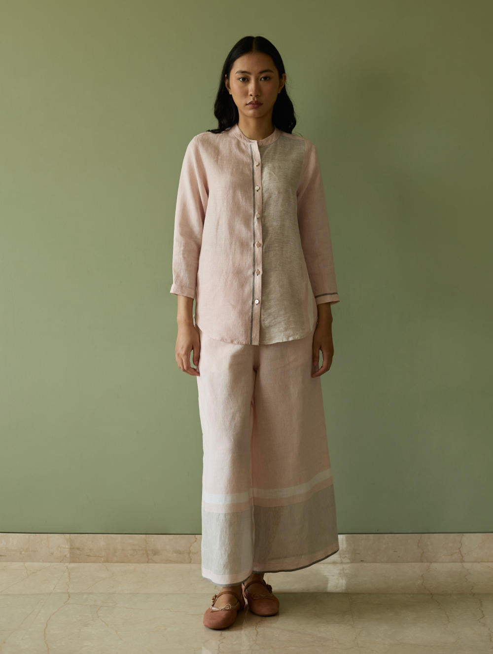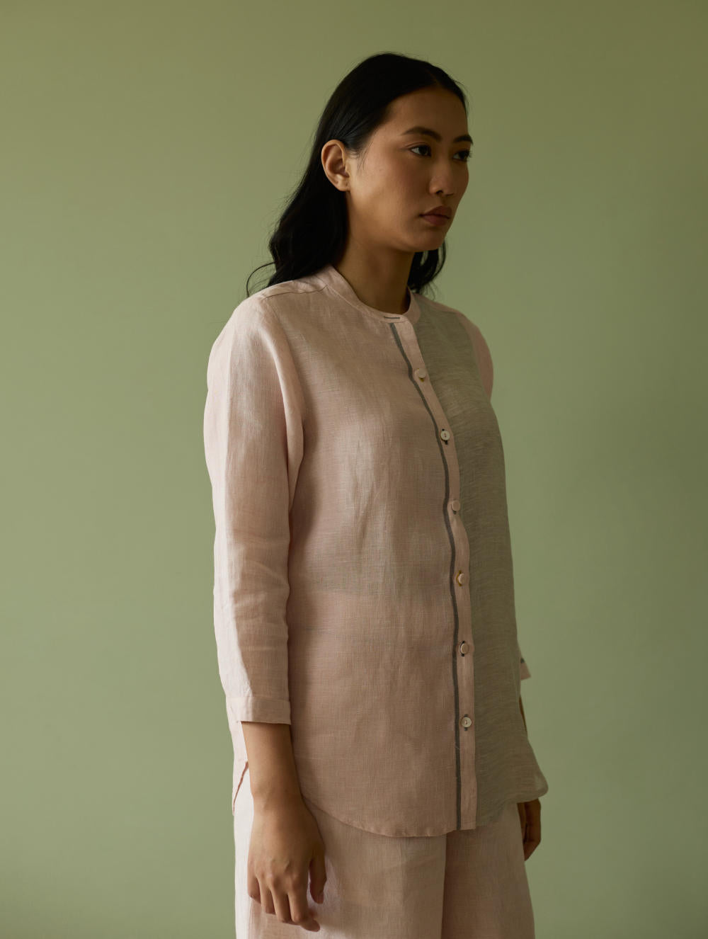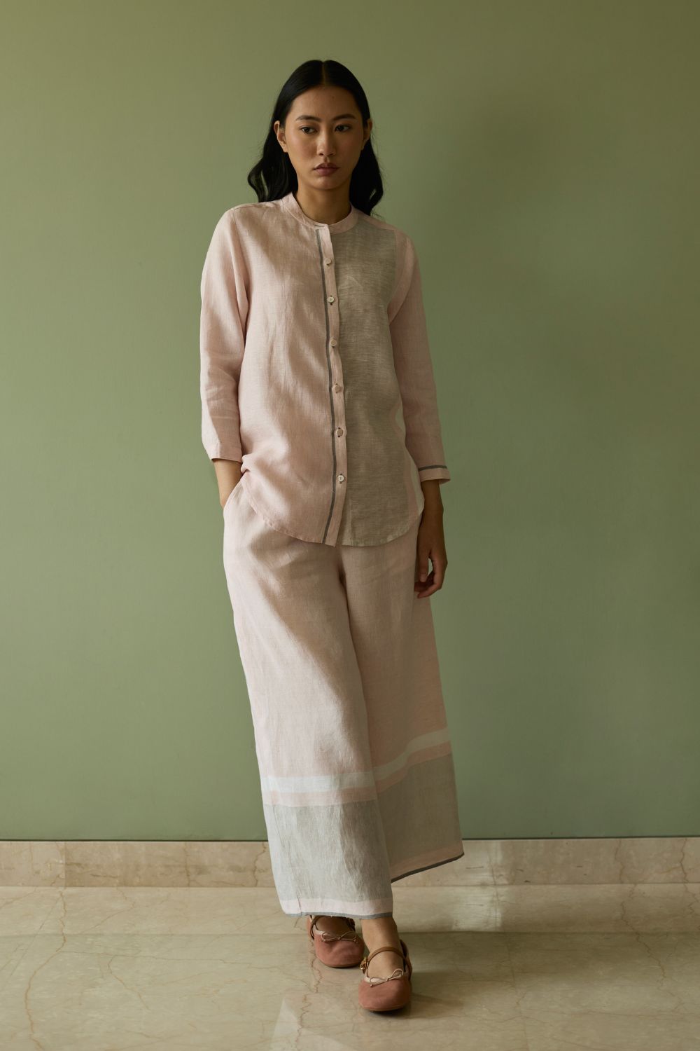 Top - This forever mandarin-collared shirt is crafted from our signature soft handwoven metallic border linen. A subtle grey handwoven selvedge adds a quiet unique detail to the silhouette. The button-down placket is thoughtfully finished with a blend of linen fabric and mother-of-pearl buttons, while the 3/4th sleeves are ideal for an informal or formal look.