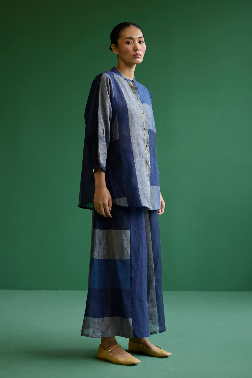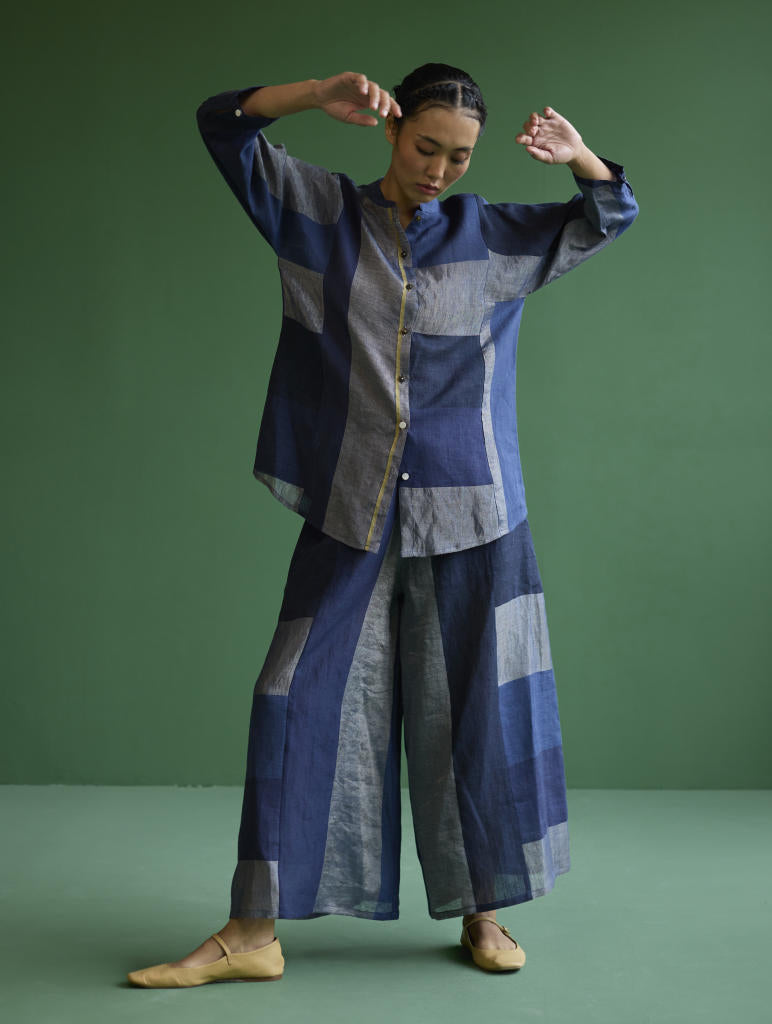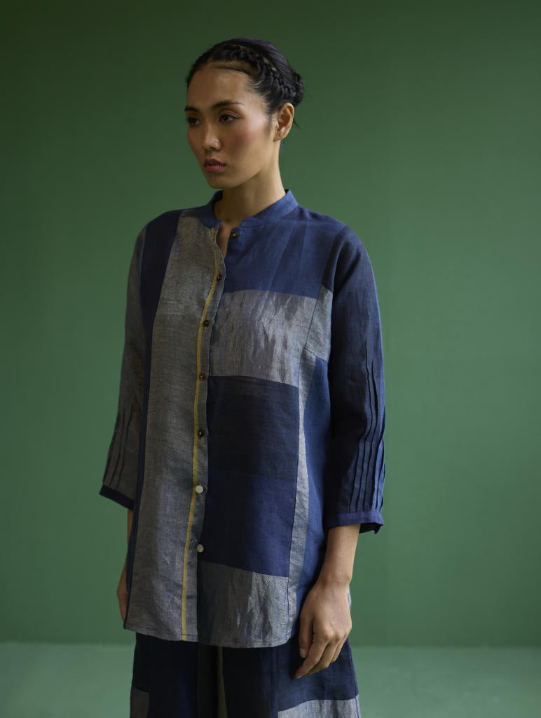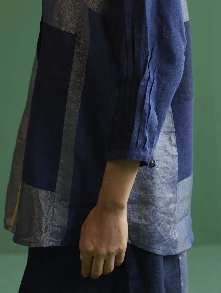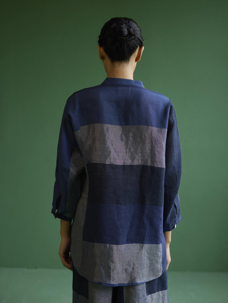 Shirt - A statement patchwork shirt crafted from our soft, handwoven broad striped linen with 3/4th sleeves, a mandarin collar, pleated sleeve cuff detail, and brass and linen-covered buttons. This Izara shirt will pair beautifully with our classic linen pants and your favorite denim.