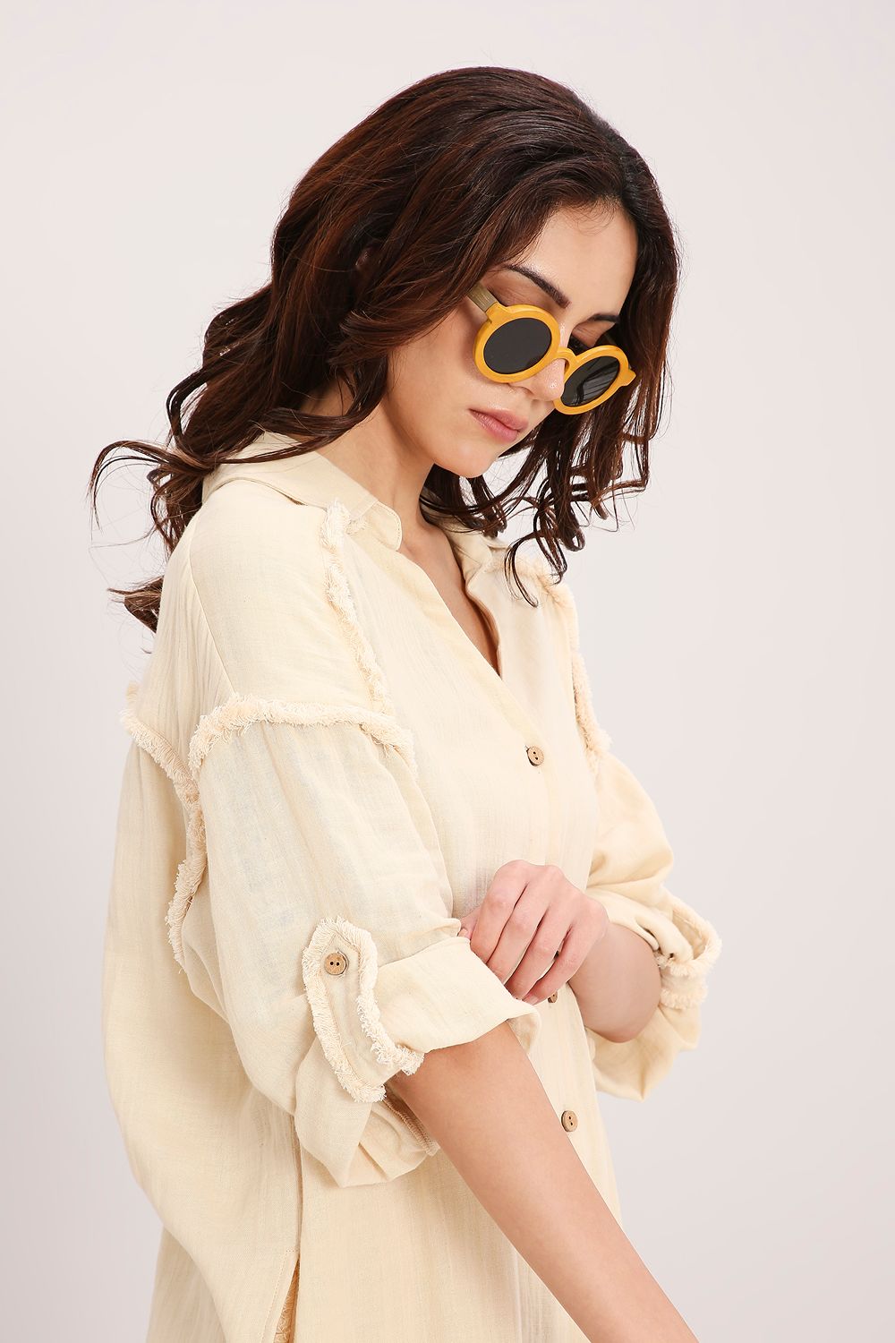 Long shirt in soft crush cotton with front button opening, fringed details and comfort fit. Comes with our tassled elasticated pants with side pockets. Total 2 pcs.